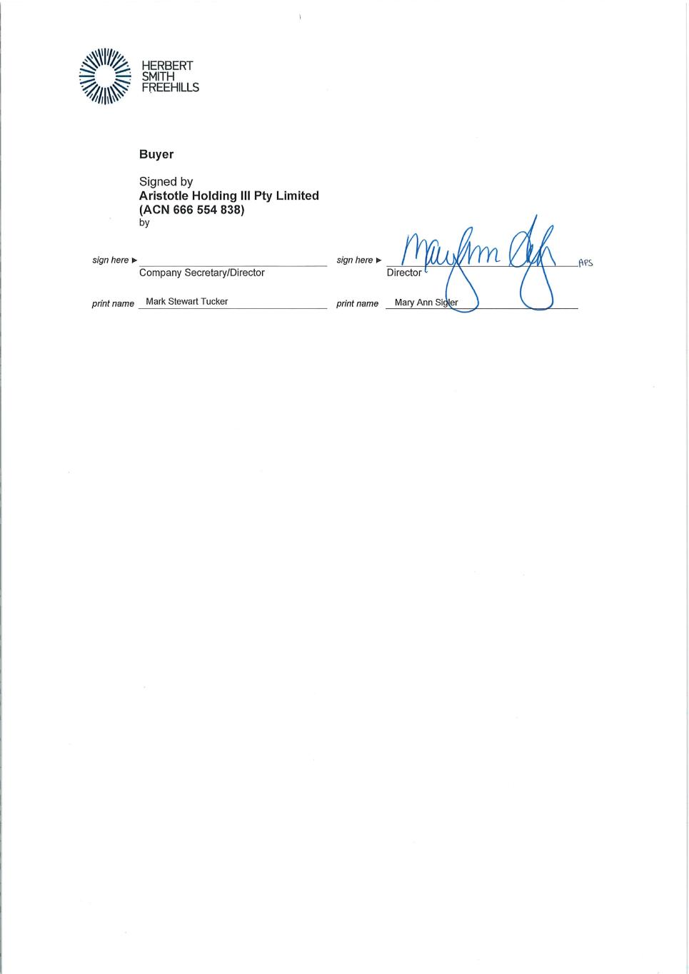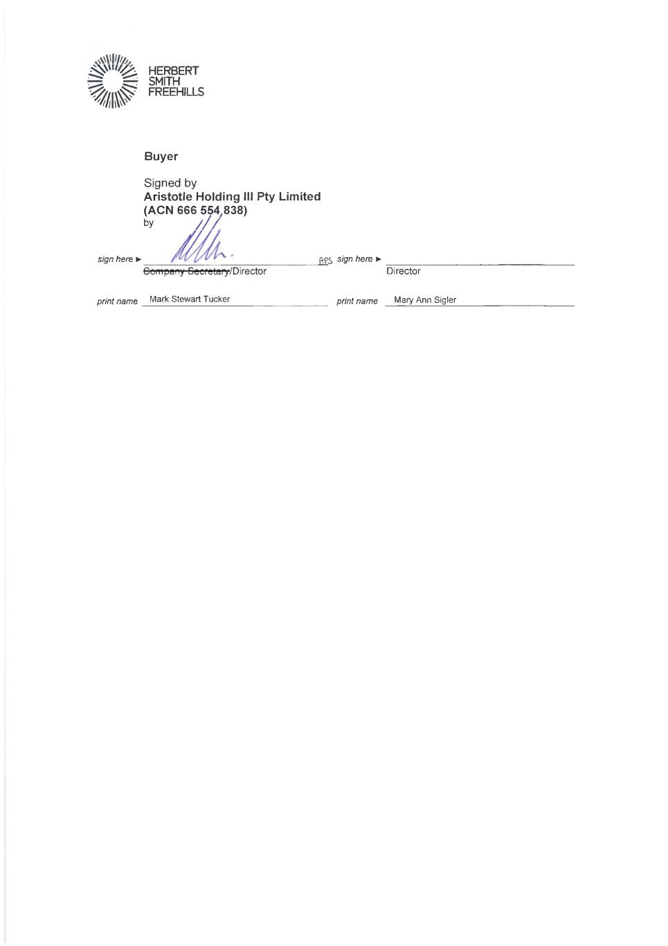> HERBERT =- SMITH%P FREEHILLS Buyer Signed by Aristotle Holding III Pty Limited (ACN GGG 554 838) by sign here ► f\pc, sign here ► Company Secretary/Director Director print name Mark Stewart Tucker print name Mary Ann Sigler