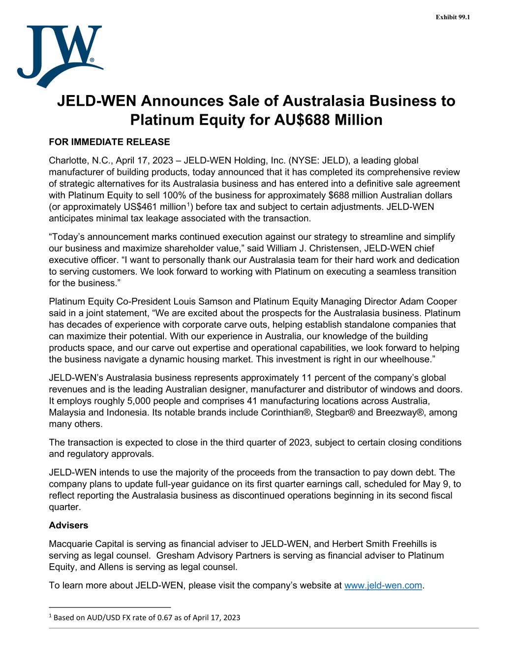 JELD-WEN Announces Sale of Australasia Business to Platinum Equity for AU$688 Million FOR IMMEDIATE RELEASE Charlotte, N.C., April 17, 2023 – JELD-WEN Holding, Inc. (NYSE: JELD), a leading global manufacturer of building products, today announced that it has completed its comprehensive review of strategic alternatives for its Australasia business and has entered into a definitive sale agreement with Platinum Equity to sell 100% of the business for approximately $688 million Australian dollars (or approximately US$461 million1) before tax and subject to certain adjustments. JELD-WEN anticipates minimal tax leakage associated with the transaction. “Today’s announcement marks continued execution against our strategy to streamline and simplify our business and maximize shareholder value,” said William J. Christensen, JELD-WEN chief executive officer. “I want to personally thank our Australasia team for their hard work and dedication to serving customers. We look forward to working with Platinum on executing a seamless transition for the business.” Platinum Equity Co-President Louis Samson and Platinum Equity Managing Director Adam Cooper said in a joint statement, “We are excited about the prospects for the Australasia business. Platinum has decades of experience with corporate carve outs, helping establish standalone companies that can maximize their potential. With our experience in Australia, our knowledge of the building products space, and our carve out expertise and operational capabilities, we look forward to helping the business navigate a dynamic housing market. This investment is right in our wheelhouse.” JELD-WEN’s Australasia business represents approximately 11 percent of the company’s global revenues and is the leading Australian designer, manufacturer and distributor of windows and doors. It employs roughly 5,000 people and comprises 41 manufacturing locations across Australia, Malaysia and Indonesia. Its notable brands include Corinthian®, Stegbar® and Breezway®, among many others. The transaction is expected to close in the third quarter of 2023, subject to certain closing conditions and regulatory approvals. JELD-WEN intends to use the majority of the proceeds from the transaction to pay down debt. The company plans to update full-year guidance on its first quarter earnings call, scheduled for May 9, to reflect reporting the Australasia business as discontinued operations beginning in its second fiscal quarter. Advisers Macquarie Capital is serving as financial adviser to JELD-WEN, and Herbert Smith Freehills is serving as legal counsel. Gresham Advisory Partners is serving as financial adviser to Platinum Equity, and Allens is serving as legal counsel. To learn more about JELD-WEN, please visit the company’s website at www.jeld-wen.com. 1 Based on AUD/USD FX rate of 0.67 as of April 17, 2023 Exhibit 99.1