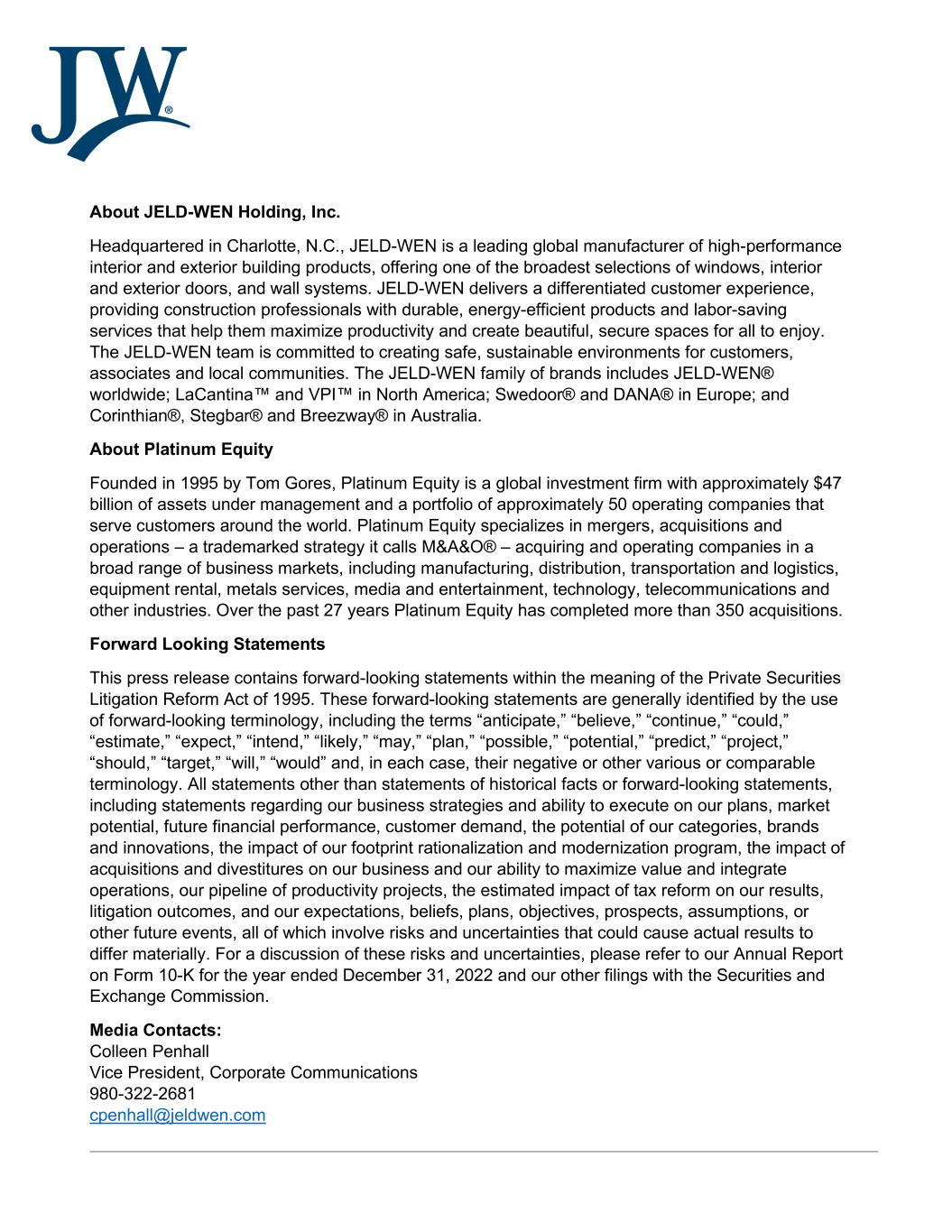 About JELD-WEN Holding, Inc. Headquartered in Charlotte, N.C., JELD-WEN is a leading global manufacturer of high-performance interior and exterior building products, offering one of the broadest selections of windows, interior and exterior doors, and wall systems. JELD-WEN delivers a differentiated customer experience, providing construction professionals with durable, energy-efficient products and labor-saving services that help them maximize productivity and create beautiful, secure spaces for all to enjoy. The JELD-WEN team is committed to creating safe, sustainable environments for customers, associates and local communities. The JELD-WEN family of brands includes JELD-WEN® worldwide; LaCantina™ and VPI™ in North America; Swedoor® and DANA® in Europe; and Corinthian®, Stegbar® and Breezway® in Australia. About Platinum Equity Founded in 1995 by Tom Gores, Platinum Equity is a global investment firm with approximately $47 billion of assets under management and a portfolio of approximately 50 operating companies that serve customers around the world. Platinum Equity specializes in mergers, acquisitions and operations – a trademarked strategy it calls M&A&O® – acquiring and operating companies in a broad range of business markets, including manufacturing, distribution, transportation and logistics, equipment rental, metals services, media and entertainment, technology, telecommunications and other industries. Over the past 27 years Platinum Equity has completed more than 350 acquisitions. Forward Looking Statements This press release contains forward-looking statements within the meaning of the Private Securities Litigation Reform Act of 1995. These forward-looking statements are generally identified by the use of forward-looking terminology, including the terms “anticipate,” “believe,” “continue,” “could,” “estimate,” “expect,” “intend,” “likely,” “may,” “plan,” “possible,” “potential,” “predict,” “project,” “should,” “target,” “will,” “would” and, in each case, their negative or other various or comparable terminology. All statements other than statements of historical facts or forward-looking statements, including statements regarding our business strategies and ability to execute on our plans, market potential, future financial performance, customer demand, the potential of our categories, brands and innovations, the impact of our footprint rationalization and modernization program, the impact of acquisitions and divestitures on our business and our ability to maximize value and integrate operations, our pipeline of productivity projects, the estimated impact of tax reform on our results, litigation outcomes, and our expectations, beliefs, plans, objectives, prospects, assumptions, or other future events, all of which involve risks and uncertainties that could cause actual results to differ materially. For a discussion of these risks and uncertainties, please refer to our Annual Report on Form 10-K for the year ended December 31, 2022 and our other filings with the Securities and Exchange Commission. Media Contacts: Colleen Penhall Vice President, Corporate Communications 980-322-2681 cpenhall@jeldwen.com