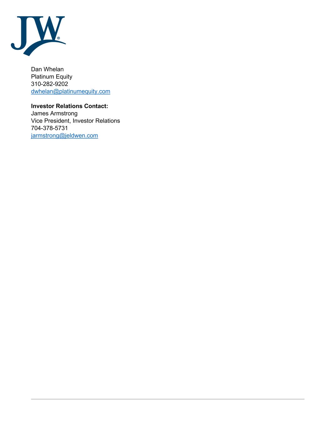 Dan Whelan Platinum Equity 310-282-9202 dwhelan@platinumequity.com Investor Relations Contact: James Armstrong Vice President, Investor Relations 704-378-5731 jarmstrong@jeldwen.com