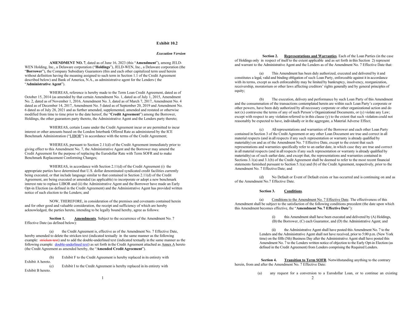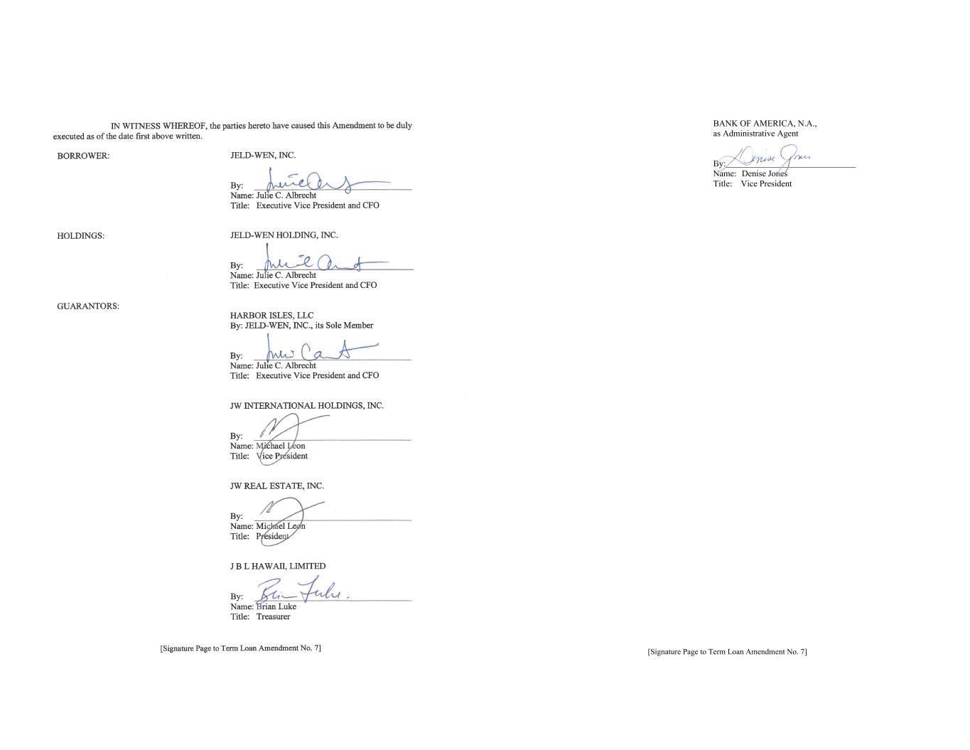1 Execution Version AMENDMENT NO. 7, dated as of June 16, 2023 (this “Amendment”), among JELD- WEN Holding, Inc., a Delaware corporation (“Holdings”), JELD-WEN, Inc., a Delaware corporation (the “Borrower”), the Company Subsidiary Guarantors (this and each other capitalized term used herein without definition having the meaning assigned to such term in Section 1.1 of the Credit Agreement described below) and Bank of America, N.A., as administrative agent for the Lenders ( the “Administrative Agent”). WHEREAS, reference is hereby made to the Term Loan Credit Agreement, dated as of October 15, 2014 (as amended by that certain Amendment No. 1, dated as of July 1, 2015, Amendment No. 2, dated as of November 1, 2016, Amendment No. 3, dated as of March 7, 2017, Amendment No. 4 dated as of December 14, 2017, Amendment No. 5 dated as of September 20, 2019 and Amendment No. 6 dated as of July 28, 2021 and as further amended, supplemented, amended and restated or otherwise modified from time to time prior to the date hereof, the “Credit Agreement”) among the Borrower, Holdings, the other guarantors party thereto, the Administrative Agent and the Lenders party thereto; WHEREAS, certain Loans under the Credit Agreement incur or are permitted to incur interest or other amounts based on the London Interbank Offered Rate as administered by the ICE Benchmark Administration (“LIBOR”) in accordance with the terms of the Credit Agreement; WHEREAS, pursuant to Section 2.11(d) of the Credit Agreement immediately prior to giving effect to this Amendment No. 7, the Administrative Agent and the Borrower may amend the Credit Agreement for the purpose of replacing the Eurodollar Rate with Term SOFR and to make Benchmark Replacement Conforming Changes; WHEREAS, in accordance with Section 2.11(d) of the Credit Agreement (i) the appropriate parties have determined that U.S. dollar denominated syndicated credit facilities currently being executed, or that include language similar to that contained in Section 2.11(d) of the Credit Agreement, are being executed or amended (as applicable) to incorporate or adopt a new benchmark interest rate to replace LIBOR and (ii) the Administrative Agent and the Borrower have made an Early Opt-in Election (as defined in the Credit Agreement) and the Administrative Agent has provided written notice of such election to the Lenders; and NOW, THEREFORE, in consideration of the premises and covenants contained herein and for other good and valuable consideration, the receipt and sufficiency of which are hereby acknowledged, the parties hereto, intending to be legally bound hereby, agree as follows: Section 1. Amendments. Subject to the occurrence of the Amendment No. 7 Effective Date (as defined below): (a) the Credit Agreement is, effective as of the Amendment No. 7 Effective Date, hereby amended to delete the stricken text (indicated textually in the same manner as the following example: stricken text) and to add the double-underlined text (indicated textually in the same manner as the following example: double-underlined text) as set forth in the Credit Agreement attached as Annex A hereto (the Credit Agreement as amended hereby, the “Amended Credit Agreement”). (b) Exhibit F to the Credit Agreement is hereby replaced in its entirety with Exhibit A hereto. (c) Exhibit I to the Credit Agreement is hereby replaced in its entirety with Exhibit B hereto. Exhibit 10.2 2 Section 2. Representations and Warranties. Each of the Loan Parties (in the case of Holdings only in respect of itself to the extent applicable and as set forth in this Section 2) represent and warrant to the Administrative Agent and the Lenders as of the Amendment No. 7 Effective Date that: (a) This Amendment has been duly authorized, executed and delivered by it and constitutes a legal, valid and binding obligation of such Loan Party, enforceable against it in accordance with its terms, except as such enforceability may be limited by bankruptcy, insolvency, reorganization, receivership, moratorium or other laws affecting creditors’ rights generally and by general principles of equity; (b) The execution, delivery and performance by such Loan Party of this Amendment and the consummation of the transactions contemplated herein are within such Loan Party’s corporate or other powers, have been duly authorized by all necessary corporate or other organizational action and do not (x) contravene the terms of any of such Person’s Organizational Documents, or (y) violate any Law; except with respect to any violation referred to in this clause (y) to the extent that such violation could not reasonably be expected to have, individually or in the aggregate, a Material Adverse Effect; (c) All representations and warranties of the Borrower and each other Loan Party contained in Section 3 of the Credit Agreement or any other Loan Document are true and correct in all material respects (and in all respects if any such representation or warranty is already qualified by materiality) on and as of the Amendment No. 7 Effective Date, except to the extent that such representations and warranties specifically refer to an earlier date, in which case they are true and correct in all material respects (and in all respects if any such representation or warranty is already qualified by materiality) as of such earlier date, and except that, the representations and warranties contained in Sections 3.1(a) and 3.1(b) of the Credit Agreement shall be deemed to refer to the most recent financial statements furnished pursuant to Section 5.1(a) and (b) of the Credit Agreement, respectively, prior to the Amendment No. 7 Effective Date; and (d) No Default or Event of Default exists or has occurred and is continuing on and as of the Amendment No.7 Effective Date. Section 3. Conditions. (a) Conditions to the Amendment No. 7 Effective Date. The effectiveness of this Amendment shall be subject to the satisfaction of the following co