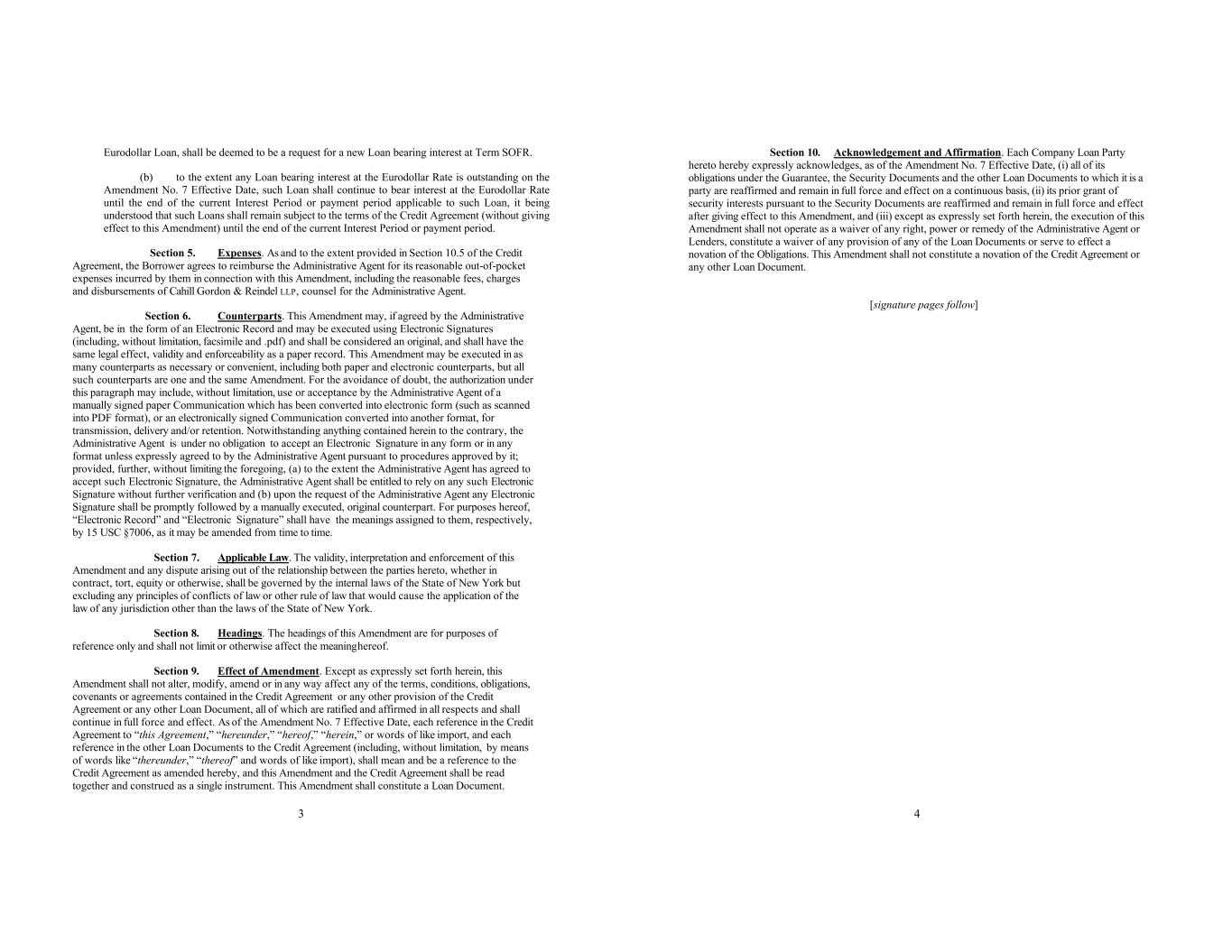 3 Eurodollar Loan, shall be deemed to be a request for a new Loan bearing interest at Term SOFR. (b) to the extent any Loan bearing interest at the Eurodollar Rate is outstanding on the Amendment No. 7 Effective Date, such Loan shall continue to bear interest at the Eurodollar Rate until the end of the current Interest Period or payment period applicable to such Loan, it being understood that such Loans shall remain subject to the terms of the Credit Agreement (without giving effect to this Amendment) until the end of the current Interest Period or payment period. Section 5. Expenses. As and to the extent provided in Section 10.5 of the Credit Agreement, the Borrower agrees to reimburse the Administrative Agent for its reasonable out-of-pocket expenses incurred by them in connection with this Amendment, including the reasonable fees, charges and disbursements of Cahill Gordon & Reindel LLP, counsel for the Administrative Agent. Section 6. Counterparts. This Amendment may, if agreed by the Administrative Agent, be in the form of an Electronic Record and may be executed using Electronic Signatures (including, without limitation, facsimile and .pdf) and shall be considered an original, and shall have the same legal effect, validity and enforceability as a paper record. This Amendment may be executed in as many counterparts as necessary or convenient, including both paper and electronic counterparts, but all such counterparts are one and the same Amendment. For the avoidance of doubt, the authorization under this paragraph may include, without limitation, use or acceptance by the Administrative Agent of a manually signed paper Communication which has been converted into electronic form (such as scanned into PDF format), or an electronically signed Communication converted into another format, for transmission, delivery and/or retention. Notwithstanding anything contained herein to the contrary, the Administrative Agent is under no obligation to accept an Electronic Signature in any form or in any format unless expressly agreed to by the Administrative Agent pursuant to procedures approved by it; provided, further, without limiting the foregoing, (a) to the extent the Administrative Agent has agreed to accept such Electronic Signature, the Administrative Agent shall be entitled to rely on any such Electronic Signature without further verification and (b) upon the request of the Administrative Agent any Electronic Signature shall be promptly followed by a manually executed, original counterpart. For purposes hereof, “Electronic Record” and “Electronic Signature” shall have the meanings assigned to them, respectively, by 15 USC §7006, as it may be amended from time to time. Section 7. Applicable Law. The validity, interpretation and enforcement of this Amendment and any dispute arising out of the relationship between the parties hereto, whether in contract, tort, equity or otherwise, shall be governed by the internal laws of the State of New York but excluding any principles of conflicts of law or other rule of law that would cause the application of the law of any jurisdiction other than the laws of the State of New York. Section 8. Headings. The headings of this Amendment are for purposes of reference only and shall not limit or otherwise affect the meaninghereof. Section 9. Effect of Amendment. Except as expressly set forth herein, this Amendment shall not alter, modify, amend or in any way affect any of the terms, conditions, obligations, covenants or agreements contained in the Credit Agreement or any other provision of the Credit Agreement or any other Loan Document, all of which are ratified and affirmed in all respects and shall continue in full force and effect. As of the Amendment No. 7 Effective Date, each reference in the Credit Agreement to “this Agreement,” “hereunder,” “hereof,” “herein,” or words of like import, and each reference in the other Loan Documents to the Credit Agreement (including, without limitation, by means of words like “thereunder,” “thereof” and words of like import), shall mean and be a reference to the Credit Agreement as amended hereby, and this Amendment and the Credit Agreement shall be read together and construed as a single instrument. This Amendment shall constitute a Loan Document. 4 Section 10. Acknowledgement and Affirmation. Each Company Loan Party hereto hereby expressly acknowledges, as of the Amendment No. 7 Effective Date, (i) all of its obligations under the Guarantee, the Security Documents and the other Loan Documents to which it is a party are reaffirmed and remain in full force and effect on a continuous basis, (ii) its prior grant of security interests pursuant to the Security Documents are reaffirmed and remain in full force and effect after giving effect to this Amendment, and (iii) except as expressly set forth herein, the execution of this Amendment shall not operate as a waiver of any right, power or remedy of the Administrative Agent or Lenders, constitute a waiver of any provision of any of the Loan Documents or serve to effect a novation of the Obligations. This Amendment shall not constitute a novation of the Credit Agreement or any other Loan Document. [signature pages follow]