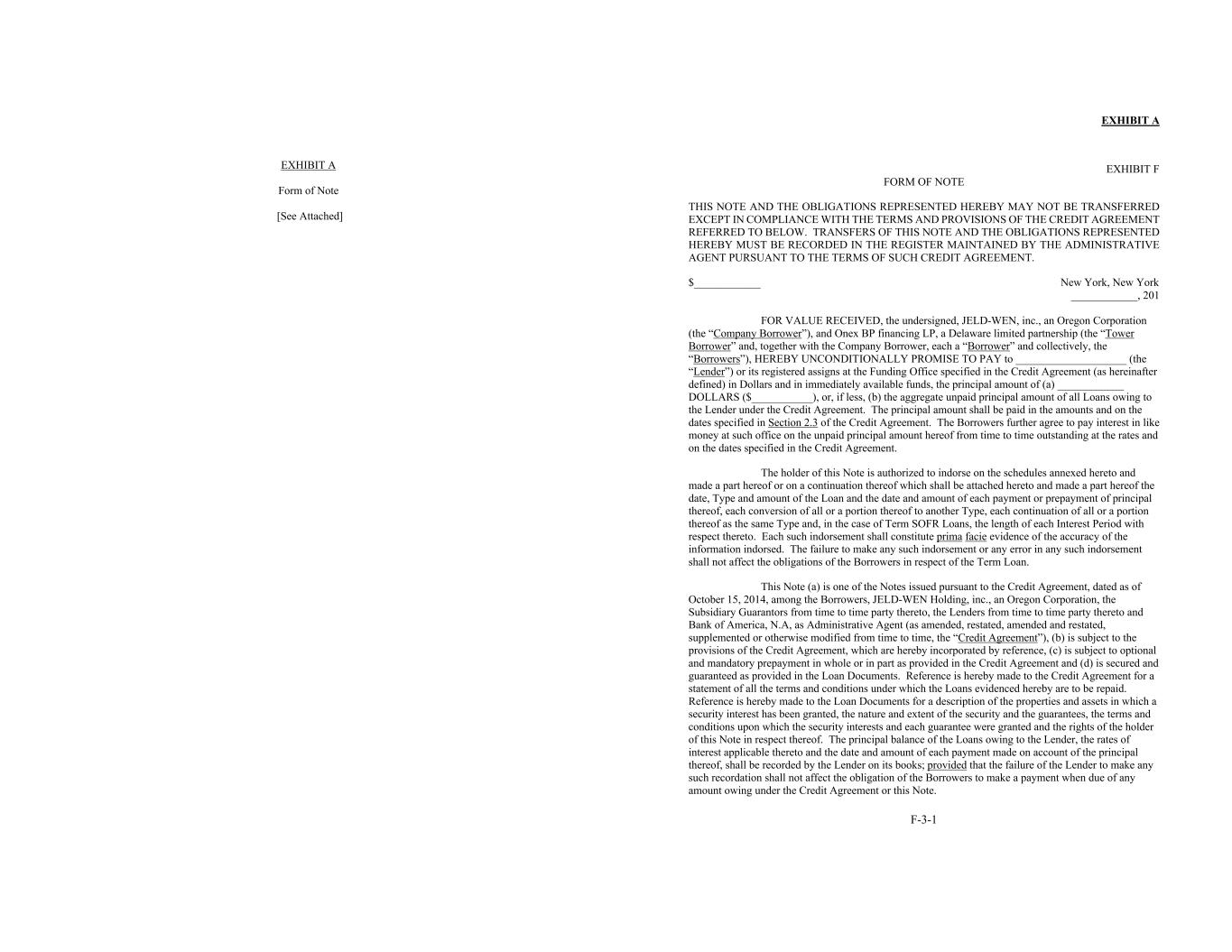 EXHIBIT A Form of Note [See Attached] EXHIBIT A F-3-1 EXHIBIT F FORM OF NOTE THIS NOTE AND THE OBLIGATIONS REPRESENTED HEREBY MAY NOT BE TRANSFERRED EXCEPT IN COMPLIANCE WITH THE TERMS AND PROVISIONS OF THE CREDIT AGREEMENT REFERRED TO BELOW. TRANSFERS OF THIS NOTE AND THE OBLIGATIONS REPRESENTED HEREBY MUST BE RECORDED IN THE REGISTER MAINTAINED BY THE ADMINISTRATIVE AGENT PURSUANT TO THE TERMS OF SUCH CREDIT AGREEMENT. $____________ New York, New York ____________, 201 FOR VALUE RECEIVED, the undersigned, JELD-WEN, inc., an Oregon Corporation (the “Company Borrower”), and Onex BP financing LP, a Delaware limited partnership (the “Tower Borrower” and, together with the Company Borrower, each a “Borrower” and collectively, the “Borrowers”), HEREBY UNCONDITIONALLY PROMISE TO PAY to ____________________ (the “Lender”) or its registered assigns at the Funding Office specified in the Credit Agreement (as hereinafter defined) in Dollars and in immediately available funds, the principal amount of (a) ____________ DOLLARS ($___________), or, if less, (b) the aggregate unpaid principal amount of all Loans owing to the Lender under the Credit Agreement. The principal amount shall be paid in the amounts and on the dates specified in Section 2.3 of the Credit Agreement. The Borrowers further agree to pay interest in like money at such office on the unpaid principal amount hereof from time to time outstanding at the rates and on the dates specified in the Credit Agreement. The holder of this Note is authorized to indorse on the schedules annexed hereto and made a part hereof or on a continuation thereof which shall be attached hereto and made a part hereof the date, Type and amount of the Loan and the date and amount of each payment or prepayment of principal thereof, each conversion of all or a portion thereof to another Type, each continuation of all or a portion thereof as the same Type and, in the case of Term SOFR Loans, the length of each Interest Period with respect thereto. Each such indorsement shall constitute prima facie evidence of the accuracy of the information indorsed. The failure to make any such indorsement or any error in any such indorsement shall not affect the obligations of the Borrowers in respect of the Term Loan. This Note (a) is one of the Notes issued pursuant to the Credit Agreement, dated as of October 15, 2014, among the Borrowers, JELD-WEN Holding, inc., an Oregon Corporation, the Subsidiary Guarantors from time to time party thereto, the Lenders from time to time party thereto and Bank of America, N.A, as Administrative Agent (as amended, restated, amended and restated, supplemented or otherwise modified from time to time, the “Credit Agreement”), (b) is subject to the provisions of the Credit Agreement, which are hereby incorporated by reference, (c) is subject to optional and mandatory prepayment in whole or in part as provided in the Credit Agreement and (d) is secured and guaranteed as provided in the Loan Documents. Reference is hereby made to the Credit Agreement for a statement of all the terms and conditions under which the Loans evidenced hereby are to be repaid. Reference is hereby made to the Loan Documents for a description of the properties and assets in which a security interest has been granted, the nature and extent of the security and the guarantees, the terms and conditions upon which the security interests and each guarantee were granted and the rights of the holder of this Note in respect thereof. The principal balance of the Loans owing to the Lender, the rates of interest applicable thereto and the date and amount of each payment made on account of the principal thereof, shall be recorded by the Lender on its books; provided that the failure of the Lender to make any such recordation shall not affect the obligation of the Borrowers to make a payment when due of any amount owing under the Credit Agreement or this Note.