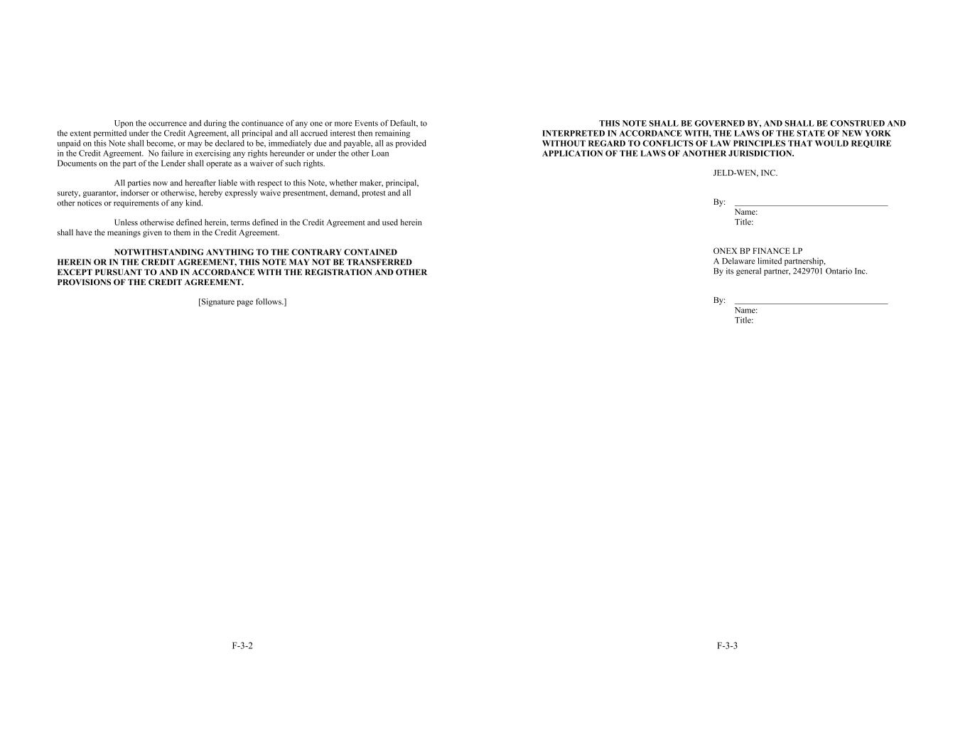 F-3-2 Upon the occurrence and during the continuance of any one or more Events of Default, to the extent permitted under the Credit Agreement, all principal and all accrued interest then remaining unpaid on this Note shall become, or may be declared to be, immediately due and payable, all as provided in the Credit Agreement. No failure in exercising any rights hereunder or under the other Loan Documents on the part of the Lender shall operate as a waiver of such rights. All parties now and hereafter liable with respect to this Note, whether maker, principal, surety, guarantor, indorser or otherwise, hereby expressly waive presentment, demand, protest and all other notices or requirements of any kind. Unless otherwise defined herein, terms defined in the Credit Agreement and used herein shall have the meanings given to them in the Credit Agreement. NOTWITHSTANDING ANYTHING TO THE CONTRARY CONTAINED HEREIN OR IN THE CREDIT AGREEMENT, THIS NOTE MAY NOT BE TRANSFERRED EXCEPT PURSUANT TO AND IN ACCORDANCE WITH THE REGISTRATION AND OTHER PROVISIONS OF THE CREDIT AGREEMENT. [Signature page follows.] F-3-3 THIS NOTE SHALL BE GOVERNED BY, AND SHALL BE CONSTRUED AND INTERPRETED IN ACCORDANCE WITH, THE LAWS OF THE STATE OF NEW YORK WITHOUT REGARD TO CONFLICTS OF LAW PRINCIPLES THAT WOULD REQUIRE APPLICATION OF THE LAWS OF ANOTHER JURISDICTION. JELD-WEN, INC. By: Name: Title: ONEX BP FINANCE LP A Delaware limited partnership, By its general partner, 2429701 Ontario Inc. By: Name: Title: