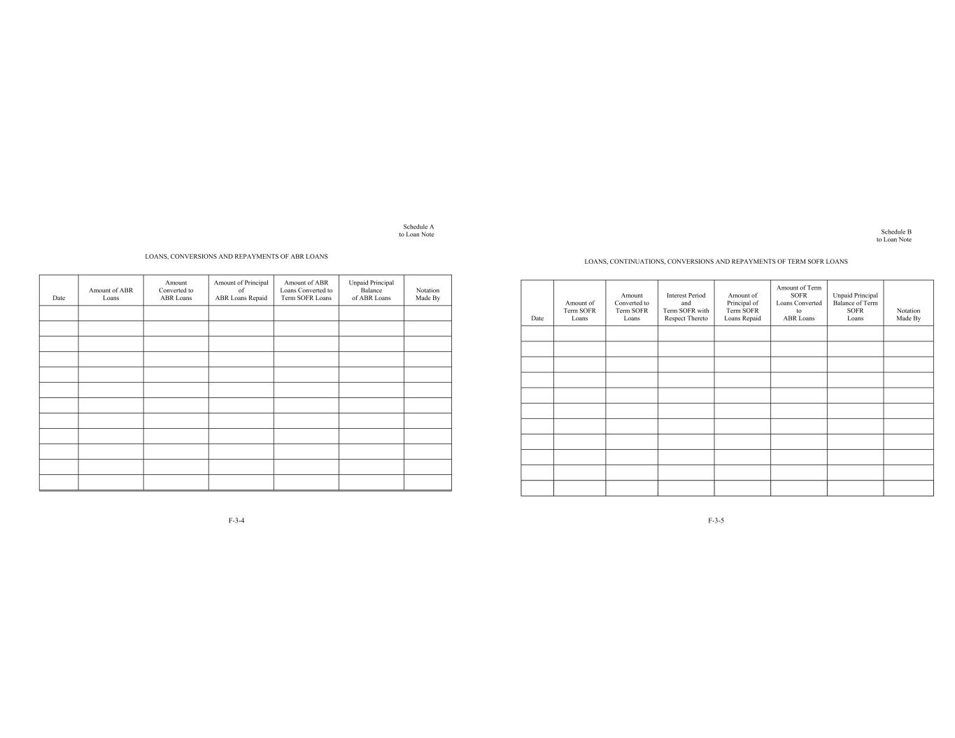 F-3-4 Schedule A to Loan Note LOANS, CONVERSIONS AND REPAYMENTS OF ABR LOANS Date Amount of ABR Loans Amount Converted to ABR Loans Amount of Principal of ABR Loans Repaid Amount of ABR Loans Converted to Term SOFR Loans Unpaid Principal Balance of ABR Loans Notation Made By F-3-5 Schedule B to Loan Note LOANS, CONTINUATIONS, CONVERSIONS AND REPAYMENTS OF TERM SOFR LOANS Date Amount of Term SOFR Loans Amount Converted to Term SOFR Loans Interest Period and Term SOFR with Respect Thereto Amount of Principal of Term SOFR Loans Repaid Amount of Term SOFR Loans Converted to ABR Loans Unpaid Principal Balance of Term SOFR Loans Notation Made By