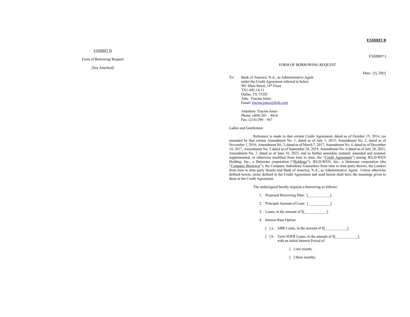 EXHIBIT B Form of Borrowing Request [See Attached] EXHIBIT B EXHIBIT I FORM OF BORROWING REQUEST Date: [•], 20[•] To: Bank of America, N.A., as Administrative Agent under the Credit Agreement referred to below 901 Main Street, 14th Floor TX1-492-14-11 Dallas, TX 75202 Attn: Tracina Jones Email: tracina.jones@bofa.com Attention: Tracina Jones Phone: (469) 201 – 8816 Fax: (214) 290 – 967 Ladies and Gentlemen: Reference is made to that certain Credit Agreement, dated as of October 15, 2014, (as amended by that certain Amendment No. 1, dated as of July 1, 2015, Amendment No. 2, dated as of November 1, 2016, Amendment No. 3, dated as of March 7, 2017, Amendment No. 4, dated as of December 14, 2017, Amendment No. 5 dated as of September 20, 2019, Amendment No. 6 dated as of July 28, 2021, Amendment No. 7, dated as of June 16, 2023, and as further amended, restated, amended and restated, supplemented, or otherwise modified from time to time, the “Credit Agreement”) among JELD-WEN Holding, Inc., a Delaware corporation (“Holdings”), JELD-WEN, Inc., a Delaware corporation (the “Company Borrower”), the Company Subsidiary Guarantors from time to time party thereto, the Lenders from time to time party thereto and Bank of America, N.A., as Administrative Agent. Unless otherwise defined herein, terms defined in the Credit Agreement and used herein shall have the meanings given to them in the Credit Agreement. The undersigned hereby requests a borrowing as follows: 1. Proposed Borrowing Date: [____________]. 2. Principal Amount of Loan: [____________]. 3. Loans, in the amount of $[____________]. 4. Interest Rate Option: [ ] a. ABR Loans, in the amount of $[____________]. [ ] b. Term SOFR Loans, in the amount of $[____________], with an initial Interest Period of [ ] one month; [ ] three months;