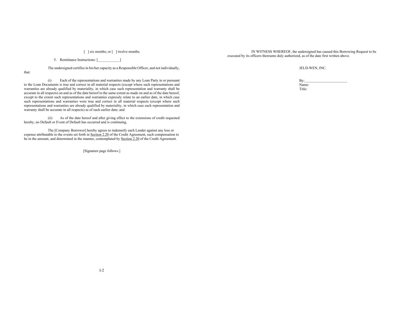 I-2 [ ] six months; or [ ] twelve months. 5. Remittance Instructions: [____________] The undersigned certifies in his/her capacity as a Responsible Officer, and not individually, that: (i) Each of the representations and warranties made by any Loan Party in or pursuant to the Loan Documents is true and correct in all material respects (except where such representations and warranties are already qualified by materiality, in which case such representation and warranty shall be accurate in all respects) on and as of the date hereof to the same extent as made on and as of the date hereof, except to the extent such representations and warranties expressly relate to an earlier date, in which case such representations and warranties were true and correct in all material respects (except where such representations and warranties are already qualified by materiality, in which case such representation and warranty shall be accurate in all respects) as of such earlier date; and (ii) As of the date hereof and after giving effect to the extensions of credit requested hereby, no Default or Event of Default has occurred and is continuing. The [Company Borrower] hereby agrees to indemnify each Lender against any loss or expense attributable to the events set forth in Section 2.20 of the Credit Agreement, such compensation to be in the amount, and determined in the manner, contemplated by Section 2.20 of the Credit Agreement. [Signature page follows.] IN WITNESS WHEREOF, the undersigned has caused this Borrowing Request to be executed by its officers thereunto duly authorized, as of the date first written above. JELD-WEN, INC. By: Name: Title: