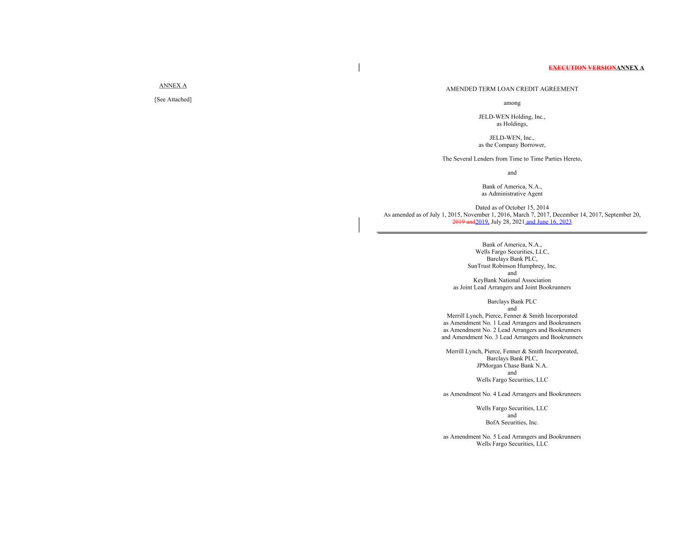 ANNEX A [See Attached] EXECUTION VERSIONANNEX A AMENDED TERM LOAN CREDIT AGREEMENT among JELD-WEN Holding, Inc., as Holdings, JELD-WEN, Inc., as the Company Borrower, The Several Lenders from Time to Time Parties Hereto, and Bank of America, N.A., as Administrative Agent Dated as of October 15, 2014 As amended as of July 1, 2015, November 1, 2016, March 7, 2017, December 14, 2017, September 20, 2019 and2019, July 28, 2021 and June 16, 2023 Bank of America, N.A., Wells Fargo Securities, LLC, Barclays Bank PLC, SunTrust Robinson Humphrey, Inc. and KeyBank National Association as Joint Lead Arrangers and Joint Bookrunners Barclays Bank PLC and Merrill Lynch, Pierce, Fenner & Smith Incorporated as Amendment No. 1 Lead Arrangers and Bookrunners as Amendment No. 2 Lead Arrangers and Bookrunners and Amendment No. 3 Lead Arrangers and Bookrunners Merrill Lynch, Pierce, Fenner & Smith Incorporated, Barclays Bank PLC, JPMorgan Chase Bank N.A. and Wells Fargo Securities, LLC as Amendment No. 4 Lead Arrangers and Bookrunners Wells Fargo Securities, LLC and BofA Securities, Inc. as Amendment No. 5 Lead Arrangers and Bookrunners Wells Fargo Securities, LLC