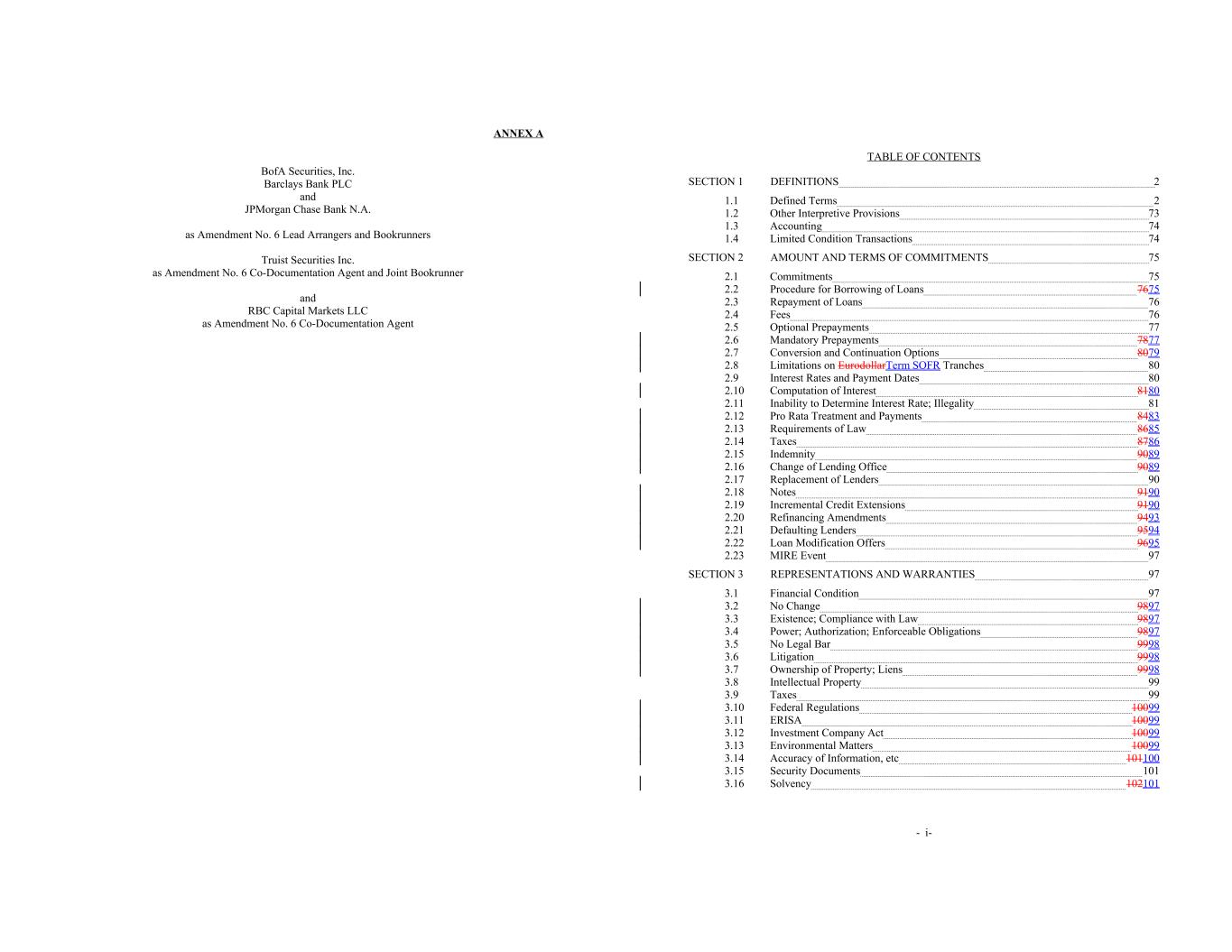 ANNEX A BofA Securities, Inc. Barclays Bank PLC and JPMorgan Chase Bank N.A. as Amendment No. 6 Lead Arrangers and Bookrunners Truist Securities Inc. as Amendment No. 6 Co-Documentation Agent and Joint Bookrunner and RBC Capital Markets LLC as Amendment No. 6 Co-Documentation Agent TABLE OF CONTENTS SECTION 1 DEFINITIONS 2 1.1 Defined Terms 2 1.2 Other Interpretive Provisions 73 1.3 Accounting 74 1.4 Limited Condition Transactions 74 SECTION 2 AMOUNT AND TERMS OF COMMITMENTS 75 2.1 Commitments 75 2.2 Procedure for Borrowing of Loans 7675 2.3 Repayment of Loans 76 2.4 Fees 76 2.5 Optional Prepayments 77 2.6 Mandatory Prepayments 7877 2.7 Conversion and Continuation Options 8079 2.8 Limitations on EurodollarTerm SOFR Tranches 80 2.9 Interest Rates and Payment Dates 80 2.10 Computation of Interest 8180 2.11 Inability to Determine Interest Rate; Illegality 81 2.12 Pro Rata Treatment and Payments 8483 2.13 Requirements of Law 8685 2.14 Taxes 8786 2.15 Indemnity 9089 2.16 Change of Lending Office 9089 2.17 Replacement of Lenders 90 2.18 Notes 9190 2.19 Incremental Credit Extensions 9190 2.20 Refinancing Amendments 9493 2.21 Defaulting Lenders 9594 2.22 Loan Modification Offers 9695 2.23 MIRE Event 97 SECTION 3 REPRESENTATIONS AND WARRANTIES 97 3.1 Financial Condition 97 3.2 No Change 9897 3.3 Existence; Compliance with Law 9897 3.4 Power; Authorization; Enforceable Obligations 9897 3.5 No Legal Bar 9998 3.6 Litigation 9998 3.7 Ownership of Property; Liens 9998 3.8 Intellectual Property 99 3.9 Taxes 99 3.10 Federal Regulations 10099 3.11 ERISA 10099 3.12 Investment Company Act 10099 3.13 Environmental Matters 10099 3.14 Accuracy of Information, etc 101100 3.15 Security Documents 101 3.16 Solvency 102101 - i-