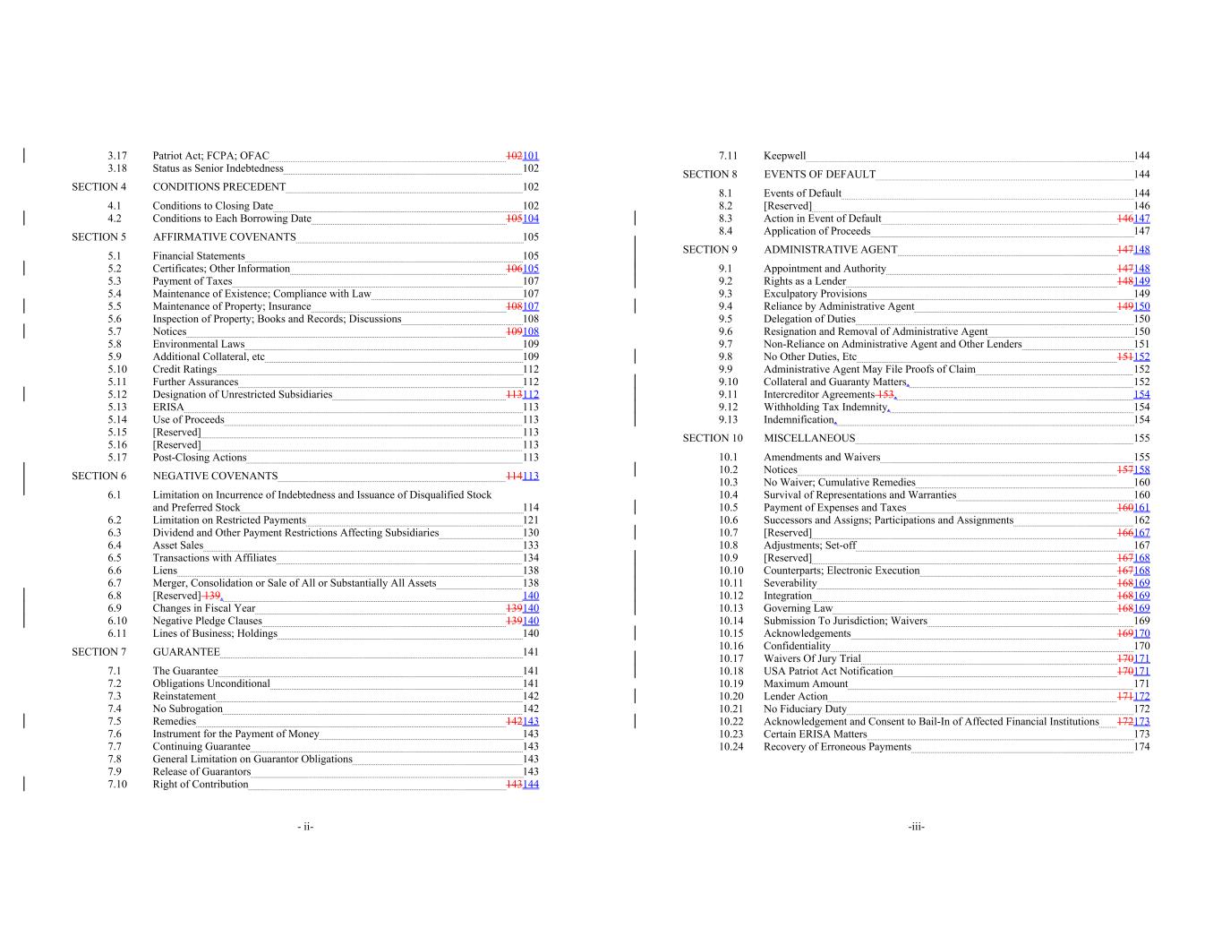 3.17 Patriot Act; FCPA; OFAC 102101 3.18 Status as Senior Indebtedness 102 SECTION 4 CONDITIONS PRECEDENT 102 4.1 Conditions to Closing Date 102 4.2 Conditions to Each Borrowing Date 105104 SECTION 5 AFFIRMATIVE COVENANTS 105 5.1 Financial Statements 105 5.2 Certificates; Other Information 106105 5.3 Payment of Taxes 107 5.4 Maintenance of Existence; Compliance with Law 107 5.5 Maintenance of Property; Insurance 108107 5.6 Inspection of Property; Books and Records; Discussions 108 5.7 Notices 109108 5.8 Environmental Laws 109 5.9 Additional Collateral, etc 109 5.10 Credit Ratings 112 5.11 Further Assurances 112 5.12 Designation of Unrestricted Subsidiaries 113112 5.13 ERISA 113 5.14 Use of Proceeds 113 5.15 [Reserved] 113 5.16 [Reserved] 113 5.17 Post-Closing Actions 113 SECTION 6 NEGATIVE COVENANTS 114113 6.1 Limitation on Incurrence of Indebtedness and Issuance of Disqualified Stock and Preferred Stock 114 6.2 Limitation on Restricted Payments 121 6.3 Dividend and Other Payment Restrictions Affecting Subsidiaries 130 6.4 Asset Sales 133 6.5 Transactions with Affiliates 134 6.6 Liens 138 6.7 Merger, Consolidation or Sale of All or Substantially All Assets 138 6.8 [Reserved] 139. 140 6.9 Changes in Fiscal Year 139140 6.10 Negative Pledge Clauses 139140 6.11 Lines of Business; Holdings 140 SECTION 7 GUARANTEE 141 7.1 The Guarantee 141 7.2 Obligations Unconditional 141 7.3 Reinstatement 142 7.4 No Subrogation 142 7.5 Remedies 142143 7.6 Instrument for the Payment of Money 143 7.7 Continuing Guarantee 143 7.8 General Limitation on Guarantor Obligations 143 7.9 Release of Guarantors 143 7.10 Right of Contribution 143144 - ii- 7.11 Keepwell 144 SECTION 8 EVENTS OF DEFAULT 144 8.1 Events of Default 144 8.2 [Reserved] 146 8.3 Action in Event of Default 146147 8.4 Application of Proceeds 147 SECTION 9 ADMINISTRATIVE AGENT 147148 9.1 Appointment and Authority 147148 9.2 Rights as a Lender 148149 9.3 Exculpatory Provisions 149 9.4 Reliance by Administrative Agent 149150 9.5 Delegation of Duties 150 9.6 Resignation and Removal of Administrative Agent 150 9.7 Non-Reliance on Administrative Agent and Other Lenders 151 9.8 No Other Duties, Etc 151152 9.9 Administrative Agent May File Proofs of Claim 152 9.10 Collateral and Guaranty Matters. 152 9.11 Intercreditor Agreements 153. 154 9.12 Withholding Tax Indemnity. 154 9.13 Indemnification. 154 SECTION 10 MISCELLANEOUS 155 10.1 Amendments and Waivers 155 10.2 Notices 157158 10.3 No Waiver; Cumulative Remedies 160 10.4 Survival of Representations and Warranties 160 10.5 Payment of Expenses and Taxes 160161 10.6 Successors and Assigns; Participations and Assignments 162 10.7 [Reserved] 166167 10.8 Adjustments; Set-off 167 10.9 [Reserved] 167168 10.10 Counterparts; Electronic Execution 167168 10.11 Severability 168169 10.12 Integration 168169 10.13 Governing Law 168169 10.14 Submission To Jurisdiction; Waivers 169 10.15 Acknowledgements 169170 10.16 Confidentiality 170 10.17 Waivers Of Jury Trial 170171 10.18 USA Patriot Act Notification 170171 10.19 Maximum Amount 171 10.20 Lender Action 171172 10.21 No Fiduciary Duty 172 10.22 Acknowledgement and Consent to Bail-In of Affected Financial Institutions 172173 10.23 Certain ERISA Matters 173 10.24 Recovery of Erroneous Payments 174 -iii-