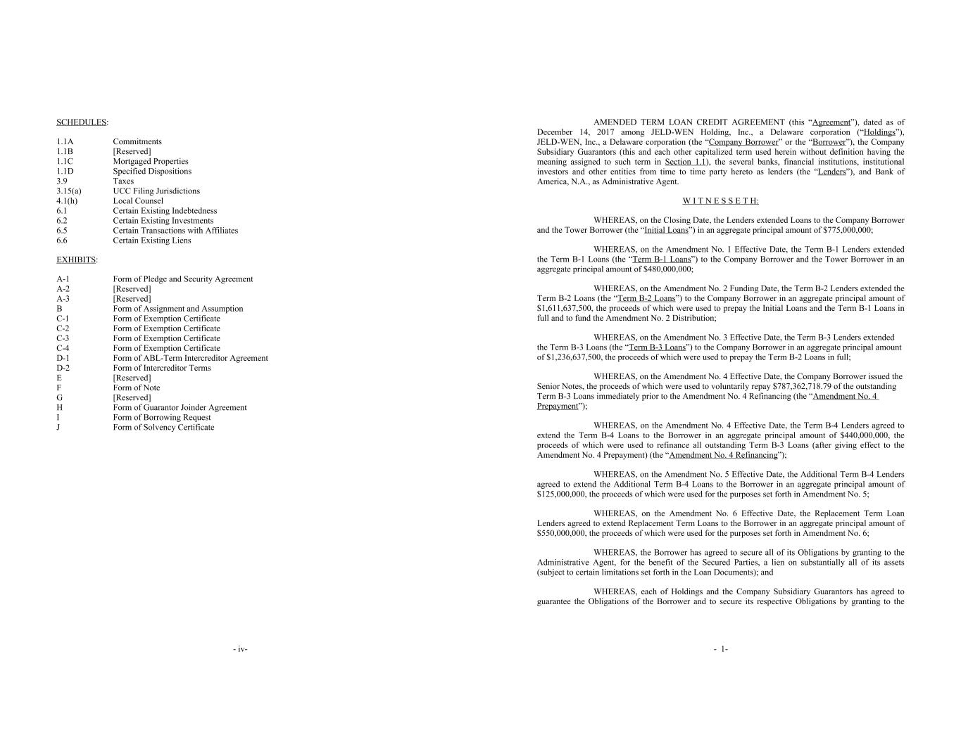 SCHEDULES: 1.1A Commitments 1.1B [Reserved] 1.1C Mortgaged Properties 1.1D Specified Dispositions 3.9 Taxes 3.15(a) UCC Filing Jurisdictions 4.1(h) Local Counsel 6.1 Certain Existing Indebtedness 6.2 Certain Existing Investments 6.5 Certain Transactions with Affiliates 6.6 Certain Existing Liens EXHIBITS: A-1 Form of Pledge and Security Agreement A-2 [Reserved] A-3 [Reserved] B Form of Assignment and Assumption C-1 Form of Exemption Certificate C-2 Form of Exemption Certificate C-3 Form of Exemption Certificate C-4 Form of Exemption Certificate D-1 Form of ABL-Term Intercreditor Agreement D-2 Form of Intercreditor Terms E [Reserved] F Form of Note G [Reserved] H Form of Guarantor Joinder Agreement I Form of Borrowing Request J Form of Solvency Certificate - iv- AMENDED TERM LOAN CREDIT AGREEMENT (this “Agreement”), dated as of December 14, 2017 among JELD-WEN Holding, Inc., a Delaware corporation (“Holdings”), JELD-WEN, Inc., a Delaware corporation (the “Company Borrower” or the “Borrower”), the Company Subsidiary Guarantors (this and each other capitalized term used herein without definition having the meaning assigned to such term in Section 1.1), the several banks, financial institutions, institutional investors and other entities from time to time party hereto as lenders (the “Lenders”), and Bank of America, N.A., as Administrative Agent. W I T N E S S E T H: WHEREAS, on the Closing Date, the Lenders extended Loans to the Company Borrower and the Tower Borrower (the “Initial Loans”) in an aggregate principal amount of $775,000,000; WHEREAS, on the Amendment No. 1 Effective Date, the Term B-1 Lenders extended the Term B-1 Loans (the “Term B-1 Loans”) to the Company Borrower and the Tower Borrower in an aggregate principal amount of $480,000,000; WHEREAS, on the Amendment No. 2 Funding Date, the Term B-2 Lenders extended the Term B-2 Loans (the “Term B-2 Loans”) to the Company Borrower in an aggregate principal amount of $1,611,637,500, the proceeds of which were used to prepay the Initial Loans and the Term B-1 Loans in full and to fund the Amendment No. 2 Distribution; WHEREAS, on the Amendment No. 3 Effective Date, the Term B-3 Lenders extended the Term B-3 Loans (the “Term B-3 Loans”) to the Company Borrower in an aggregate principal amount of $1,236,637,500, the proceeds of which were used to prepay the Term B-2 Loans in full; WHEREAS, on the Amendment No. 4 Effective Date, the Company Borrower issued the Senior Notes, the proceeds of which were used to voluntarily repay $787,362,718.79 of the outstanding Term B-3 Loans immediately prior to the Amendment No. 4 Refinancing (the “Amendment No. 4 Prepayment”); WHEREAS, on the Amendment No. 4 Effective Date, the Term B-4 Lenders agreed to extend the Term B-4 Loans to the Borrower in an aggregate principal amount of $440,000,000, the proceeds of which were used to refinance all outstanding Term B-3 Loans (after giving effect to the Amendment No. 4 Prepayment) (the “Amendment No. 4 Refinancing”); WHEREAS, on the Amendment No. 5 Effective Date, the Additional Term B-4 Lenders agreed to extend the Additional Term B-4 Loans to the Borrower in an aggregate principal amount of $125,000,000, the proceeds of which were used for the purposes set forth in Amendment No. 5; WHEREAS, on the Amendment No. 6 Effective Date, the Replacement Term Loan Lenders agreed to extend Replacement Term Loans to the Borrower in an aggregate principal amount of $550,000,000, the proceeds of which were used for the purposes set forth in Amendment No. 6; WHEREAS, the Borrower has agreed to secure all of its Obligations by granting to the Administrative Agent, for the benefit of the Secured Parties, a lien on substantially all of its assets (subject to certain limitations set forth in the Loan Documents); and WHEREAS, each of Holdings and the Company Subsidiary Guarantors has agreed to guarantee the Obligations of the Borrower and to secure its respective Obligations by granting to the - 1-