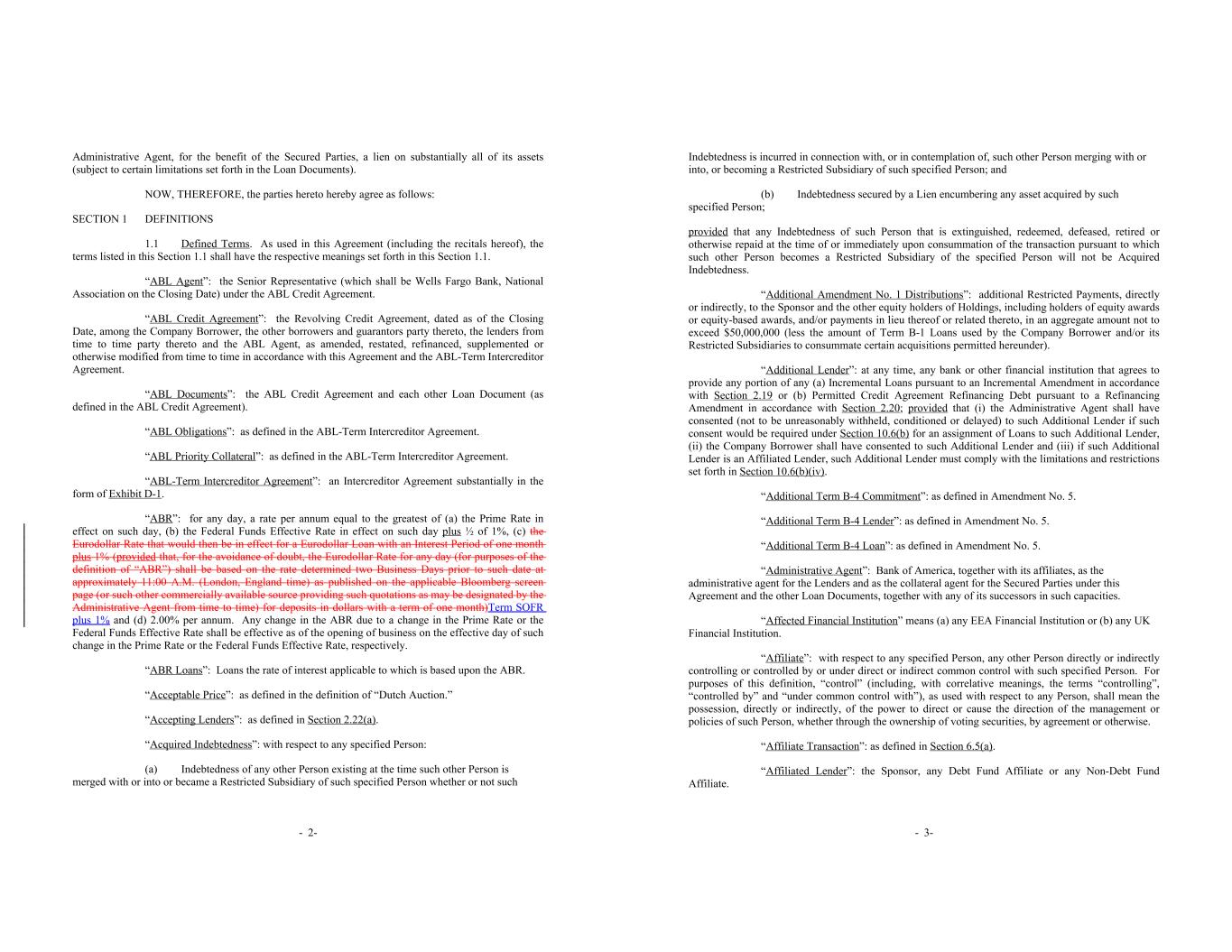Administrative Agent, for the benefit of the Secured Parties, a lien on substantially all of its assets (subject to certain limitations set forth in the Loan Documents). NOW, THEREFORE, the parties hereto hereby agree as follows: DEFINITIONSSECTION 1 Defined Terms. As used in this Agreement (including the recitals hereof), the1.1 terms listed in this Section 1.1 shall have the respective meanings set forth in this Section 1.1. “ABL Agent”: the Senior Representative (which shall be Wells Fargo Bank, National Association on the Closing Date) under the ABL Credit Agreement. “ABL Credit Agreement”: the Revolving Credit Agreement, dated as of the Closing Date, among the Company Borrower, the other borrowers and guarantors party thereto, the lenders from time to time party thereto and the ABL Agent, as amended, restated, refinanced, supplemented or otherwise modified from time to time in accordance with this Agreement and the ABL-Term Intercreditor Agreement. “ABL Documents”: the ABL Credit Agreement and each other Loan Document (as defined in the ABL Credit Agreement). “ABL Obligations”: as defined in the ABL-Term Intercreditor Agreement. “ABL Priority Collateral”: as defined in the ABL-Term Intercreditor Agreement. “ABL-Term Intercreditor Agreement”: an Intercreditor Agreement substantially in the form of Exhibit D-1. “ABR”: for any day, a rate per annum equal to the greatest of (a) the Prime Rate in effect on such day, (b) the Federal Funds Effective Rate in effect on such day plus ½ of 1%, (c) the Eurodollar Rate that would then be in effect for a Eurodollar Loan with an Interest Period of one month plus 1% (provided that, for the avoidance of doubt, the Eurodollar Rate for any day (for purposes of the definition of “ABR”) shall be based on the rate determined two Business Days prior to such date at approximately 11:00 A.M. (London, England time) as published on the applicable Bloomberg screen page (or such other commercially available source providing such quotations as may be designated by the Administrative Agent from time to time) for deposits in dollars with a term of one month)Term SOFR plus 1% and (d) 2.00% per annum. Any change in the ABR due to a change in the Prime Rate or the Federal Funds Effective Rate shall be effective as of the opening of business on the effective day of such change in the Prime Rate or the Federal Funds Effective Rate, respectively. “ABR Loans”: Loans the rate of interest applicable to which is based upon the ABR. “Acceptable Price”: as defined in the definition of “Dutch Auction.” “Accepting Lenders”: as defined in Section 2.22(a). “Acquired Indebtedness”: with respect to any specified Person: (a) Indebtedness of any other Person existing at the time such other Person is merged with or into or became a Restricted Subsidiary of such specified Person whether or not such - 2- Indebtedness is incurred in connection with, or in contemplation of, such other Person merging with or into, or becoming a Restricted Subsidiary of such specified Person; and (b) Indebtedness secured by a Lien encumbering any asset acquired by such specified Person; provided that any Indebtedness of such Person that is extinguished, redeemed, defeased, retired or otherwise repaid at the time of or immediately upon consummation of the transaction pursuant to which such other Person becomes a Restricted Subsidiary of the specified Person will not be Acquired Indebtedness. “Additional Amendment No. 1 Distributions”: additional Restricted Payments, directly or indirectly, to the Sponsor and the other equity holders of Holdings, including holders of equity awards or equity-based awards, and/or payments in lieu thereof or related thereto, in an aggregate amount not to exceed $50,000,000 (less the amount of Term B-1 Loans used by the Company Borrower and/or its Restricted Subsidiaries to consummate certain acquisitions permitted hereunder). “Additional Lender”: at any time, any bank or other financial institution that agrees to provide any portion of any (a) Incremental Loans pursuant to an Incremental Amendment in accordance with Section 2.19 or (b) Permitted Credit Agreement Refinancing Debt pursuant to a Refinancing Amendment in accordance with Section 2.20; provided that (i) the Administrative Agent shall have consented (not to be unreasonably withheld, conditioned or delayed) to such Additional Lender if such consent would be required under Section 10.6(b) for an assignment of Loans to such Additional Lender, (ii) the Company Borrower shall have consented to such Additional Lender and (iii) if such Additional Lender is an Affiliated Lender, such Additional Lender must comply with the limitations and restrictions set forth in Section 10.6(b)(iv). “Additional Term B-4 Commitment”: as defined in Amendment No. 5. “Additional Term B-4 Lender”: as defined in Amendment No. 5. “Additional Term B-4 Loan”: as defined in Amendment No. 5. “Administrative Agent”: Bank of America, together with its affiliates, as the administrative agent for the Lenders and as the collateral agent for the Secured Parties under this Agreement and the other Loan Documents, together with any of its successors in such capacities. “Affected Financial Institution” means (a) any EEA Financial Institution or (b) any UK Financial Institution. “Affiliate”: with respect to any specified Person, any other Person directly or indirectly controlling or controlled by or under direct or indirect common control with such specified Person. For purposes of this definition, “control” (including, with correlative meanings, the terms “controlling”, “controlled by” and “under common control with”), as used with respect to any Person, shall mean the possession, directly or indirectly, of the power to direct or cause the direction of the management or policies of such Person, whether through the ownership of voting securities, by agreement or ot