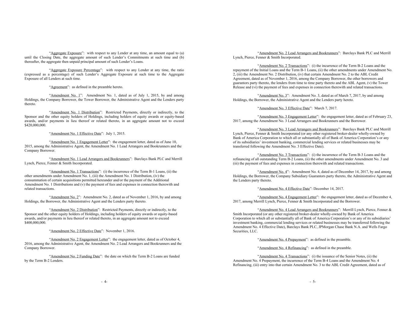 “Aggregate Exposure”: with respect to any Lender at any time, an amount equal to (a) until the Closing Date, the aggregate amount of such Lender’s Commitments at such time and (b) thereafter, the aggregate then unpaid principal amount of such Lender’s Loans. “Aggregate Exposure Percentage”: with respect to any Lender at any time, the ratio (expressed as a percentage) of such Lender’s Aggregate Exposure at such time to the Aggregate Exposure of all Lenders at such time. “Agreement”: as defined in the preamble hereto. “Amendment No. 1”: Amendment No. 1, dated as of July 1, 2015, by and among Holdings, the Company Borrower, the Tower Borrower, the Administrative Agent and the Lenders party thereto. “Amendment No. 1 Distribution”: Restricted Payments, directly or indirectly, to the Sponsor and the other equity holders of Holdings, including holders of equity awards or equity-based awards, and/or payments in lieu thereof or related thereto, in an aggregate amount not to exceed $420,000,000. “Amendment No. 1 Effective Date”: July 1, 2015. “Amendment No. 1 Engagement Letter”: the engagement letter, dated as of June 10, 2015, among the Administrative Agent, the Amendment No. 1 Lead Arrangers and Bookrunners and the Company Borrower. “Amendment No. 1 Lead Arrangers and Bookrunners”: Barclays Bank PLC and Merrill Lynch, Pierce, Fenner & Smith Incorporated. “Amendment No. 1 Transactions”: (i) the incurrence of the Term B-1 Loans, (ii) the other amendments under Amendment No. 1, (iii) the Amendment No. 1 Distribution, (iv) the consummation of certain acquisitions permitted hereunder and/or the payment of the Additional Amendment No. 1 Distributions and (v) the payment of fees and expenses in connection therewith and related transactions. “Amendment No. 2”: Amendment No. 2, dated as of November 1, 2016, by and among Holdings, the Borrower, the Administrative Agent and the Lenders party thereto. “Amendment No. 2 Distribution”: Restricted Payments, directly or indirectly, to the Sponsor and the other equity holders of Holdings, including holders of equity awards or equity-based awards, and/or payments in lieu thereof or related thereto, in an aggregate amount not to exceed $400,000,000. “Amendment No. 2 Effective Date”: November 1, 2016. “Amendment No. 2 Engagement Letter”: the engagement letter, dated as of October 4, 2016, among the Administrative Agent, the Amendment No. 2 Lead Arrangers and Bookrunners and the Company Borrower. “Amendment No. 2 Funding Date”: the date on which the Term B-2 Loans are funded by the Term B-2 Lenders. - 4- “Amendment No. 2 Lead Arrangers and Bookrunners”: Barclays Bank PLC and Merrill Lynch, Pierce, Fenner & Smith Incorporated. “Amendment No. 2 Transactions”: (i) the incurrence of the Term B-2 Loans and the repayment of the Initial Loans and the Term B-1 Loans, (ii) the other amendments under Amendment No. 2, (iii) the Amendment No. 2 Distribution, (iv) that certain Amendment No. 2 to the ABL Credit Agreement, dated as of November 1, 2016, among the Company Borrower, the other borrowers and guarantors party thereto, the lenders from time to time party thereto and the ABL Agent, (v) the Tower Release and (vi) the payment of fees and expenses in connection therewith and related transactions. “Amendment No. 3”: Amendment No. 3, dated as of March 7, 2017, by and among Holdings, the Borrower, the Administrative Agent and the Lenders party hereto. “Amendment No. 3 Effective Date”: March 7, 2017. “Amendment No. 3 Engagement Letter”: the engagement letter, dated as of February 23, 2017, among the Amendment No. 3 Lead Arrangers and Bookrunners and the Borrower. “Amendment No. 3 Lead Arrangers and Bookrunners”: Barclays Bank PLC and Merrill Lynch, Pierce, Fenner & Smith Incorporated (or any other registered broker-dealer wholly-owned by Bank of America Corporation to which all or substantially all of Bank of America Corporation’s or any of its subsidiaries’ investment banking, commercial lending services or related businesses may be transferred following the Amendment No. 3 Effective Date). “Amendment No. 3 Transactions”: (i) the incurrence of the Term B-3 Loans and the refinancing of all outstanding Term B-2 Loans, (ii) the other amendments under Amendment No. 3 and (iii) the payment of fees and expenses in connection therewith and related transactions. “Amendment No. 4”: Amendment No. 4, dated as of December 14, 2017, by and among Holdings, the Borrower, the Company Subsidiary Guarantors party thereto, the Administrative Agent and the Lenders party thereto. “Amendment No. 4 Effective Date”: December 14, 2017. “Amendment No. 4 Engagement Letter”: the engagement letter, dated as of December 4, 2017, among Merrill Lynch, Pierce, Fenner & Smith Incorporated and the Borrower. “Amendment No. 4 Lead Arrangers and Bookrunners”: Merrill Lynch, Pierce, Fenner & Smith Incorporated (or any other registered broker-dealer wholly-owned by Bank of America Corporation to which all or substantially all of Bank of America Corporation’s or any of its subsidiaries’ investment banking, commercial lending services or related businesses may be transferred following the Amendment No. 4 Effective Date), Barclays Bank PLC, JPMorgan Chase Bank N.A. and Wells Fargo Securities, LLC. “Amendment No. 4 Prepayment”: as defined in the preamble. “Amendment No. 4 Refinancing”: as defined in the preamble. “Amendment No. 4 Transactions”: (i) the issuance of the Senior Notes, (ii) the Amendment No. 4 Prepayment, the incurrence of the Term B-4 Loans and the Amendment No. 4 Refinancing, (iii) entry into that certain Amendment No. 3 to the ABL Credit Agreement, dated as of - 5-