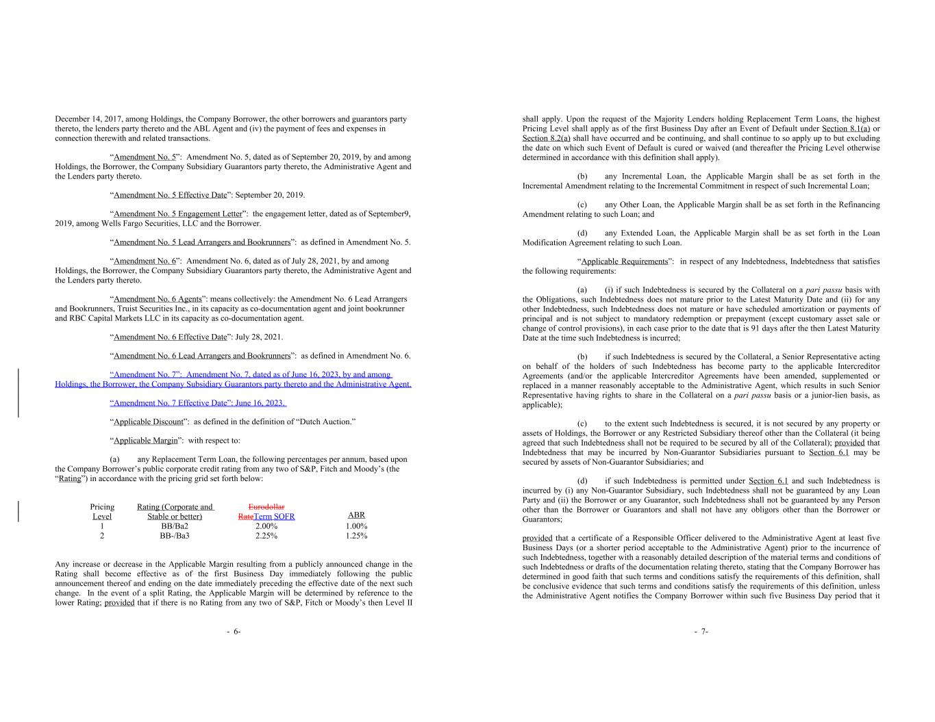 December 14, 2017, among Holdings, the Company Borrower, the other borrowers and guarantors party thereto, the lenders party thereto and the ABL Agent and (iv) the payment of fees and expenses in connection therewith and related transactions. “Amendment No. 5”: Amendment No. 5, dated as of September 20, 2019, by and among Holdings, the Borrower, the Company Subsidiary Guarantors party thereto, the Administrative Agent and the Lenders party thereto. “Amendment No. 5 Effective Date”: September 20, 2019. “Amendment No. 5 Engagement Letter”: the engagement letter, dated as of September9, 2019, among Wells Fargo Securities, LLC and the Borrower. “Amendment No. 5 Lead Arrangers and Bookrunners”: as defined in Amendment No. 5. “Amendment No. 6”: Amendment No. 6, dated as of July 28, 2021, by and among Holdings, the Borrower, the Company Subsidiary Guarantors party thereto, the Administrative Agent and the Lenders party thereto. “Amendment No. 6 Agents”: means collectively: the Amendment No. 6 Lead Arrangers and Bookrunners, Truist Securities Inc., in its capacity as co-documentation agent and joint bookrunner and RBC Capital Markets LLC in its capacity as co-documentation agent. “Amendment No. 6 Effective Date”: July 28, 2021. “Amendment No. 6 Lead Arrangers and Bookrunners”: as defined in Amendment No. 6. “Amendment No. 7”: Amendment No. 7, dated as of June 16, 2023, by and among Holdings, the Borrower, the Company Subsidiary Guarantors party thereto and the Administrative Agent. “Amendment No. 7 Effective Date”: June 16, 2023. “Applicable Discount”: as defined in the definition of “Dutch Auction.” “Applicable Margin”: with respect to: (a) any Replacement Term Loan, the following percentages per annum, based upon the Company Borrower’s public corporate credit rating from any two of S&P, Fitch and Moody’s (the “Rating”) in accordance with the pricing grid set forth below: Pricing Level Rating (Corporate and Stable or better) Eurodollar RateTerm SOFR ABR 1 BB/Ba2 2.00% 1.00% 2 BB-/Ba3 2.25% 1.25% Any increase or decrease in the Applicable Margin resulting from a publicly announced change in the Rating shall become effective as of the first Business Day immediately following the public announcement thereof and ending on the date immediately preceding the effective date of the next such change. In the event of a split Rating, the Applicable Margin will be determined by reference to the lower Rating; provided that if there is no Rating from any two of S&P, Fitch or Moody’s then Level II - 6- shall apply. Upon the request of the Majority Lenders holding Replacement Term Loans, the highest Pricing Level shall apply as of the first Business Day after an Event of Default under Section 8.1(a) or Section 8.2(a) shall have occurred and be continuing, and shall continue to so apply up to but excluding the date on which such Event of Default is cured or waived (and thereafter the Pricing Level otherwise determined in accordance with this definition shall apply). (b) any Incremental Loan, the Applicable Margin shall be as set forth in the Incremental Amendment relating to the Incremental Commitment in respect of such Incremental Loan; (c) any Other Loan, the Applicable Margin shall be as set forth in the Refinancing Amendment relating to such Loan; and (d) any Extended Loan, the Applicable Margin shall be as set forth in the Loan Modification Agreement relating to such Loan. “Applicable Requirements”: in respect of any Indebtedness, Indebtedness that satisfies the following requirements: (a) (i) if such Indebtedness is secured by the Collateral on a pari passu basis with the Obligations, such Indebtedness does not mature prior to the Latest Maturity Date and (ii) for any other Indebtedness, such Indebtedness does not mature or have scheduled amortization or payments of principal and is not subject to mandatory redemption or prepayment (except customary asset sale or change of control provisions), in each case prior to the date that is 91 days after the then Latest Maturity Date at the time such Indebtedness is incurred; (b) if such Indebtedness is secured by the Collateral, a Senior Representative acting on behalf of the holders of such Indebtedness has become party to the applicable Intercreditor Agreements (and/or the applicable Intercreditor Agreements have been amended, supplemented or replaced in a manner reasonably acceptable to the Administrative Agent, which results in such Senior Representative having rights to share in the Collateral on a pari passu basis or a junior-lien basis, as applicable); (c) to the extent such Indebtedness is secured, it is not secured by any property or assets of Holdings, the Borrower or any Restricted Subsidiary thereof other than the Collateral (it being agreed that such Indebtedness shall not be required to be secured by all of the Collateral); provided that Indebtedness that may be incurred by Non-Guarantor Subsidiaries pursuant to Section 6.1 may be secured by assets of Non-Guarantor Subsidiaries; and (d) if such Indebtedness is permitted under Section 6.1 and such Indebtedness is incurred by (i) any Non-Guarantor Subsidiary, such Indebtedness shall not be guaranteed by any Loan Party and (ii) the Borrower or any Guarantor, such Indebtedness shall not be guaranteed by any Person other than the Borrower or Guarantors and shall not have any obligors other than the Borrower or Guarantors; provided that a certificate of a Responsible Officer delivered to the Administrative Agent at least five Business Days (or a shorter period acceptable to the Administrative Agent) prior to the incurrence of such Indebtedness, together with a reasonably detailed description of the material terms and conditions of such Indebtedness or drafts of the documentation relating thereto, stating that the Company Borrower has determined in good faith that such terms and conditions satisfy the requirements of this definition, shall b
