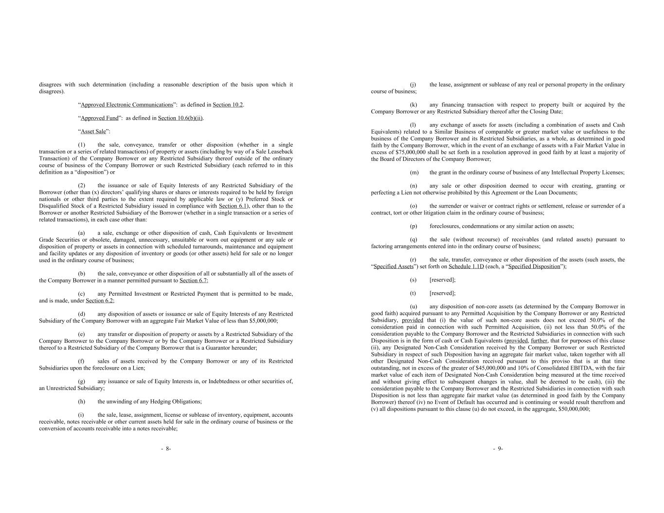 disagrees with such determination (including a reasonable description of the basis upon which it disagrees). “Approved Electronic Communications”: as defined in Section 10.2. “Approved Fund”: as defined in Section 10.6(b)(ii). “Asset Sale”: (1) the sale, conveyance, transfer or other disposition (whether in a single transaction or a series of related transactions) of property or assets (including by way of a Sale Leaseback Transaction) of the Company Borrower or any Restricted Subsidiary thereof outside of the ordinary course of business of the Company Borrower or such Restricted Subsidiary (each referred to in this definition as a “disposition”) or (2) the issuance or sale of Equity Interests of any Restricted Subsidiary of the Borrower (other than (x) directors’ qualifying shares or shares or interests required to be held by foreign nationals or other third parties to the extent required by applicable law or (y) Preferred Stock or Disqualified Stock of a Restricted Subsidiary issued in compliance with Section 6.1), other than to the Borrower or another Restricted Subsidiary of the Borrower (whether in a single transaction or a series of related transactions), in each case other than: (a) a sale, exchange or other disposition of cash, Cash Equivalents or Investment Grade Securities or obsolete, damaged, unnecessary, unsuitable or worn out equipment or any sale or disposition of property or assets in connection with scheduled turnarounds, maintenance and equipment and facility updates or any disposition of inventory or goods (or other assets) held for sale or no longer used in the ordinary course of business; (b) the sale, conveyance or other disposition of all or substantially all of the assets of the Company Borrower in a manner permitted pursuant to Section 6.7; (c) any Permitted Investment or Restricted Payment that is permitted to be made, and is made, under Section 6.2; (d) any disposition of assets or issuance or sale of Equity Interests of any Restricted Subsidiary of the Company Borrower with an aggregate Fair Market Value of less than $5,000,000; (e) any transfer or disposition of property or assets by a Restricted Subsidiary of the Company Borrower to the Company Borrower or by the Company Borrower or a Restricted Subsidiary thereof to a Restricted Subsidiary of the Company Borrower that is a Guarantor hereunder; (f) sales of assets received by the Company Borrower or any of its Restricted Subsidiaries upon the foreclosure on a Lien; (g) any issuance or sale of Equity Interests in, or Indebtedness or other securities of, an Unrestricted Subsidiary; (h) the unwinding of any Hedging Obligations; (i) the sale, lease, assignment, license or sublease of inventory, equipment, accounts receivable, notes receivable or other current assets held for sale in the ordinary course of business or the conversion of accounts receivable into a notes receivable; - 8- (j) the lease, assignment or sublease of any real or personal property in the ordinary course of business; (k) any financing transaction with respect to property built or acquired by the Company Borrower or any Restricted Subsidiary thereof after the Closing Date; (l) any exchange of assets for assets (including a combination of assets and Cash Equivalents) related to a Similar Business of comparable or greater market value or usefulness to the business of the Company Borrower and its Restricted Subsidiaries, as a whole, as determined in good faith by the Company Borrower, which in the event of an exchange of assets with a Fair Market Value in excess of $75,000,000 shall be set forth in a resolution approved in good faith by at least a majority of the Board of Directors of the Company Borrower; (m) the grant in the ordinary course of business of any Intellectual Property Licenses; (n) any sale or other disposition deemed to occur with creating, granting or perfecting a Lien not otherwise prohibited by this Agreement or the Loan Documents; (o) the surrender or waiver or contract rights or settlement, release or surrender of a contract, tort or other litigation claim in the ordinary course of business; (p) foreclosures, condemnations or any similar action on assets; (q) the sale (without recourse) of receivables (and related assets) pursuant to factoring arrangements entered into in the ordinary course of business; (r) the sale, transfer, conveyance or other disposition of the assets (such assets, the “Specified Assets”) set forth on Schedule 1.1D (each, a “Specified Disposition”); (s) [reserved]; (t) [reserved]; (u) any disposition of non-core assets (as determined by the Company Borrower in good faith) acquired pursuant to any Permitted Acquisition by the Company Borrower or any Restricted Subsidiary, provided that (i) the value of such non-core assets does not exceed 50.0% of the consideration paid in connection with such Permitted Acquisition, (ii) not less than 50.0% of the consideration payable to the Company Borrower and the Restricted Subsidiaries in connection with such Disposition is in the form of cash or Cash Equivalents (provided, further, that for purposes of this clause (ii), any Designated Non-Cash Consideration received by the Company Borrower or such Restricted Subsidiary in respect of such Disposition having an aggregate fair market value, taken together with all other Designated Non-Cash Consideration received pursuant to this proviso that is at that time outstanding, not in excess of the greater of $45,000,000 and 10% of Consolidated EBITDA, with the fair market value of each item of Designated Non-Cash Consideration being measured at the time received and without giving effect to subsequent changes in value, shall be deemed to be cash), (iii) the consideration payable to the Company Borrower and the Restricted Subsidiaries in connection with such Disposition is not less than aggregate fair market value (as determined in good faith by the Company Borrower) thereof (iv) no Event of Default
