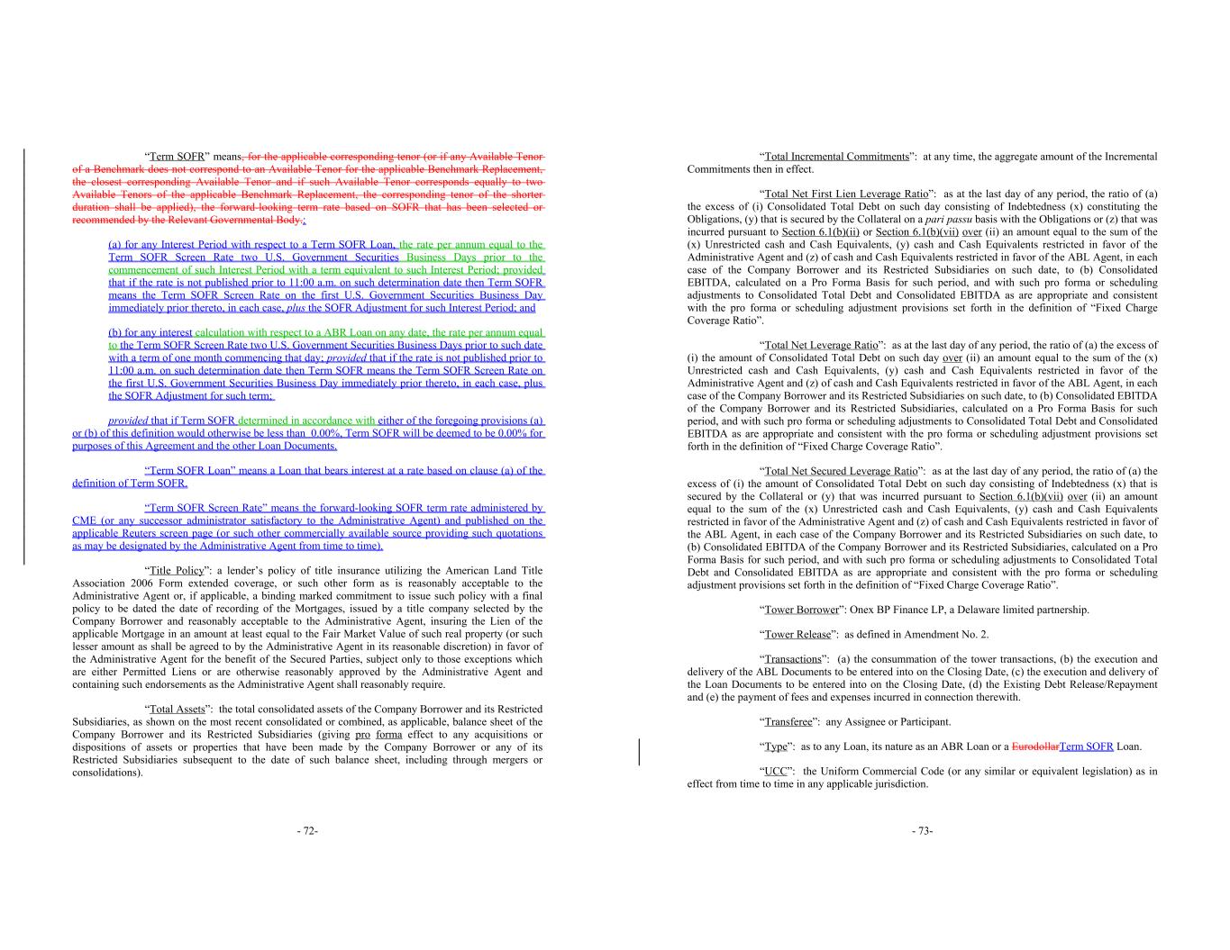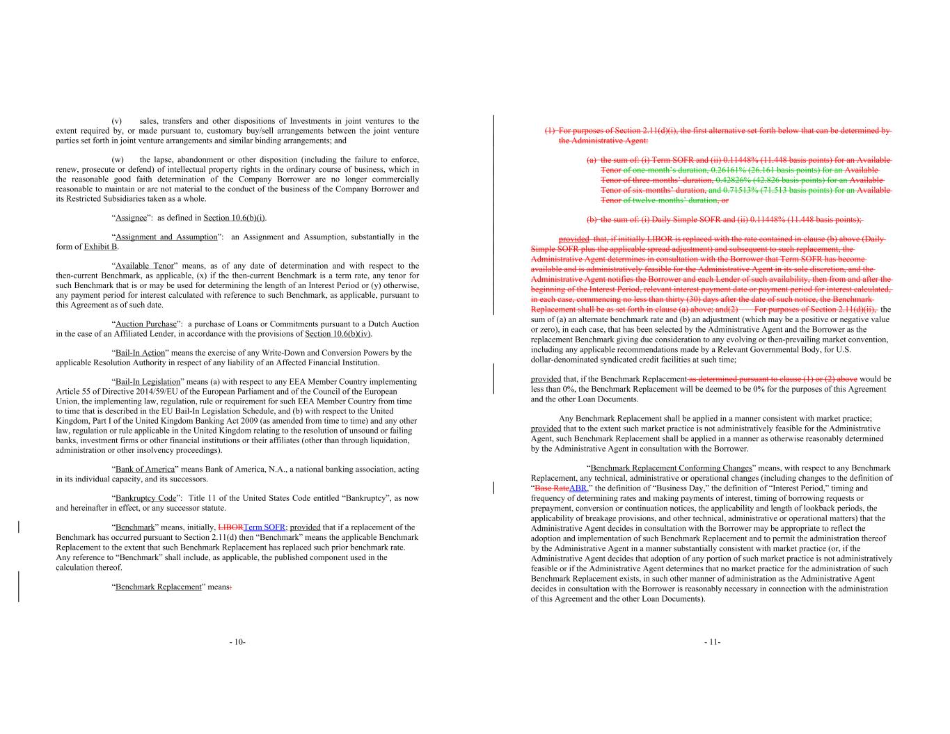 (v) sales, transfers and other dispositions of Investments in joint ventures to the extent required by, or made pursuant to, customary buy/sell arrangements between the joint venture parties set forth in joint venture arrangements and similar binding arrangements; and (w) the lapse, abandonment or other disposition (including the failure to enforce, renew, prosecute or defend) of intellectual property rights in the ordinary course of business, which in the reasonable good faith determination of the Company Borrower are no longer commercially reasonable to maintain or are not material to the conduct of the business of the Company Borrower and its Restricted Subsidiaries taken as a whole. “Assignee”: as defined in Section 10.6(b)(i). “Assignment and Assumption”: an Assignment and Assumption, substantially in the form of Exhibit B. “Available Tenor” means, as of any date of determination and with respect to the then-current Benchmark, as applicable, (x) if the then-current Benchmark is a term rate, any tenor for such Benchmark that is or may be used for determining the length of an Interest Period or (y) otherwise, any payment period for interest calculated with reference to such Benchmark, as applicable, pursuant to this Agreement as of such date. “Auction Purchase”: a purchase of Loans or Commitments pursuant to a Dutch Auction in the case of an Affiliated Lender, in accordance with the provisions of Section 10.6(b)(iv). “Bail-In Action” means the exercise of any Write-Down and Conversion Powers by the applicable Resolution Authority in respect of any liability of an Affected Financial Institution. “Bail-In Legislation” means (a) with respect to any EEA Member Country implementing Article 55 of Directive 2014/59/EU of the European Parliament and of the Council of the European Union, the implementing law, regulation, rule or requirement for such EEA Member Country from time to time that is described in the EU Bail-In Legislation Schedule, and (b) with respect to the United Kingdom, Part I of the United Kingdom Banking Act 2009 (as amended from time to time) and any other law, regulation or rule applicable in the United Kingdom relating to the resolution of unsound or failing banks, investment firms or other financial institutions or their affiliates (other than through liquidation, administration or other insolvency proceedings). “Bank of America” means Bank of America, N.A., a national banking association, acting in its individual capacity, and its successors. “Bankruptcy Code”: Title 11 of the United States Code entitled “Bankruptcy”, as now and hereinafter in effect, or any successor statute. “Benchmark” means, initially, LIBORTerm SOFR; provided that if a replacement of the Benchmark has occurred pursuant to Section 2.11(d) then “Benchmark” means the applicable Benchmark Replacement to the extent that such Benchmark Replacement has replaced such prior benchmark rate. Any reference to “Benchmark” shall include, as applicable, the published component used in the calculation thereof. “Benchmark Replacement” means: - 10- (1) For purposes of Section 2.11(d)(i), the first alternative set forth below that can be determined by the Administrative Agent: (a) the sum of: (i) Term SOFR and (ii) 0.11448% (11.448 basis points) for an Available Tenor of one-month’s duration, 0.26161% (26.161 basis points) for an Available Tenor of three-months’ duration, 0.42826% (42.826 basis points) for an Available Tenor of six-months’ duration, and 0.71513% (71.513 basis points) for an Available Tenor of twelve-months’ duration, or (b) the sum of: (i) Daily Simple SOFR and (ii) 0.11448% (11.448 basis points); provided that, if initially LIBOR is replaced with the rate contained in clause (b) above (Daily Simple SOFR plus the applicable spread adjustment) and subsequent to such replacement, the Administrative Agent determines in consultation with the Borrower that Term SOFR has become available and is administratively feasible for the Administrative Agent in its sole discretion, and the Administrative Agent notifies the Borrower and each Lender of such availability, then from and after the beginning of the Interest Period, relevant interest payment date or payment period for interest calculated, in each case, commencing no less than thirty (30) days after the date of such notice, the Benchmark Replacement shall be as set forth in clause (a) above; and(2) For purposes of Section 2.11(d)(ii), the sum of (a) an alternate benchmark rate and (b) an adjustment (which may be a positive or negative value or zero), in each case, that has been selected by the Administrative Agent and the Borrower as the replacement Benchmark giving due consideration to any evolving or then-prevailing market convention, including any applicable recommendations made by a Relevant Governmental Body, for U.S. dollar-denominated syndicated credit facilities at such time; provided that, if the Benchmark Replacement as determined pursuant to clause (1) or (2) above would be less than 0%, the Benchmark Replacement will be deemed to be 0% for the purposes of this Agreement and the other Loan Documents. Any Benchmark Replacement shall be applied in a manner consistent with market practice; provided that to the extent such market practice is not administratively feasible for the Administrative Agent, such Benchmark Replacement shall be applied in a manner as otherwise reasonably determined by the Administrative Agent in consultation with the Borrower. “Benchmark Replacement Conforming Changes” means, with respect to any Benchmark Replacement, any technical, administrative or operational changes (including changes to the definition of “Base RateABR,” the definition of “Business Day,” the definition of “Interest Period,” timing and frequency of determining rates and making payments of interest, timing of borrowing requests or prepayment, conversion or continuation notices, the a