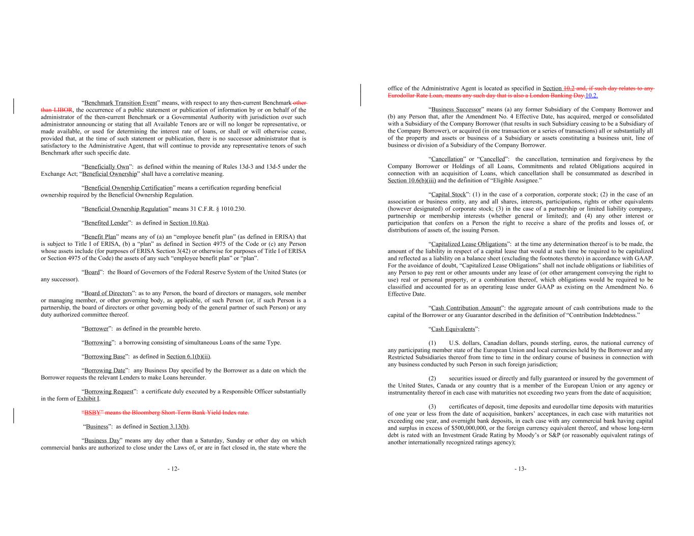 “Benchmark Transition Event” means, with respect to any then-current Benchmark other than LIBOR, the occurrence of a public statement or publication of information by or on behalf of the administrator of the then-current Benchmark or a Governmental Authority with jurisdiction over such administrator announcing or stating that all Available Tenors are or will no longer be representative, or made available, or used for determining the interest rate of loans, or shall or will otherwise cease, provided that, at the time of such statement or publication, there is no successor administrator that is satisfactory to the Administrative Agent, that will continue to provide any representative tenors of such Benchmark after such specific date. “Beneficially Own”: as defined within the meaning of Rules 13d-3 and 13d-5 under the Exchange Act; “Beneficial Ownership” shall have a correlative meaning. “Beneficial Ownership Certification” means a certification regarding beneficial ownership required by the Beneficial Ownership Regulation. “Beneficial Ownership Regulation” means 31 C.F.R. § 1010.230. “Benefited Lender”: as defined in Section 10.8(a). “Benefit Plan” means any of (a) an “employee benefit plan” (as defined in ERISA) that is subject to Title I of ERISA, (b) a “plan” as defined in Section 4975 of the Code or (c) any Person whose assets include (for purposes of ERISA Section 3(42) or otherwise for purposes of Title I of ERISA or Section 4975 of the Code) the assets of any such “employee benefit plan” or “plan”. “Board”: the Board of Governors of the Federal Reserve System of the United States (or any successor). “Board of Directors”: as to any Person, the board of directors or managers, sole member or managing member, or other governing body, as applicable, of such Person (or, if such Person is a partnership, the board of directors or other governing body of the general partner of such Person) or any duty authorized committee thereof. “Borrower”: as defined in the preamble hereto. “Borrowing”: a borrowing consisting of simultaneous Loans of the same Type. “Borrowing Base”: as defined in Section 6.1(b)(ii). “Borrowing Date”: any Business Day specified by the Borrower as a date on which the Borrower requests the relevant Lenders to make Loans hereunder. “Borrowing Request”: a certificate duly executed by a Responsible Officer substantially in the form of Exhibit I. “BSBY” means the Bloomberg Short-Term Bank Yield Index rate. “Business”: as defined in Section 3.13(b). “Business Day” means any day other than a Saturday, Sunday or other day on which commercial banks are authorized to close under the Laws of, or are in fact closed in, the state where the - 12- office of the Administrative Agent is located as specified in Section 10.2 and, if such day relates to any Eurodollar Rate Loan, means any such day that is also a London Banking Day.10.2. “Business Successor” means (a) any former Subsidiary of the Company Borrower and (b) any Person that, after the Amendment No. 4 Effective Date, has acquired, merged or consolidated with a Subsidiary of the Company Borrower (that results in such Subsidiary ceasing to be a Subsidiary of the Company Borrower), or acquired (in one transaction or a series of transactions) all or substantially all of the property and assets or business of a Subsidiary or assets constituting a business unit, line of business or division of a Subsidiary of the Company Borrower. “Cancellation” or “Cancelled”: the cancellation, termination and forgiveness by the Company Borrower or Holdings of all Loans, Commitments and related Obligations acquired in connection with an acquisition of Loans, which cancellation shall be consummated as described in Section 10.6(b)(iii) and the definition of “Eligible Assignee.” “Capital Stock”: (1) in the case of a corporation, corporate stock; (2) in the case of an association or business entity, any and all shares, interests, participations, rights or other equivalents (however designated) of corporate stock; (3) in the case of a partnership or limited liability company, partnership or membership interests (whether general or limited); and (4) any other interest or participation that confers on a Person the right to receive a share of the profits and losses of, or distributions of assets of, the issuing Person. “Capitalized Lease Obligations”: at the time any determination thereof is to be made, the amount of the liability in respect of a capital lease that would at such time be required to be capitalized and reflected as a liability on a balance sheet (excluding the footnotes thereto) in accordance with GAAP. For the avoidance of doubt, “Capitalized Lease Obligations” shall not include obligations or liabilities of any Person to pay rent or other amounts under any lease of (or other arrangement conveying the right to use) real or personal property, or a combination thereof, which obligations would be required to be classified and accounted for as an operating lease under GAAP as existing on the Amendment No. 6 Effective Date. “Cash Contribution Amount”: the aggregate amount of cash contributions made to the capital of the Borrower or any Guarantor described in the definition of “Contribution Indebtedness.” “Cash Equivalents”: (1) U.S. dollars, Canadian dollars, pounds sterling, euros, the national currency of any participating member state of the European Union and local currencies held by the Borrower and any Restricted Subsidiaries thereof from time to time in the ordinary course of business in connection with any business conducted by such Person in such foreign jurisdiction; (2) securities issued or directly and fully guaranteed or insured by the government of the United States, Canada or any country that is a member of the European Union or any agency or instrumentality thereof in each case with maturities not exceeding two y