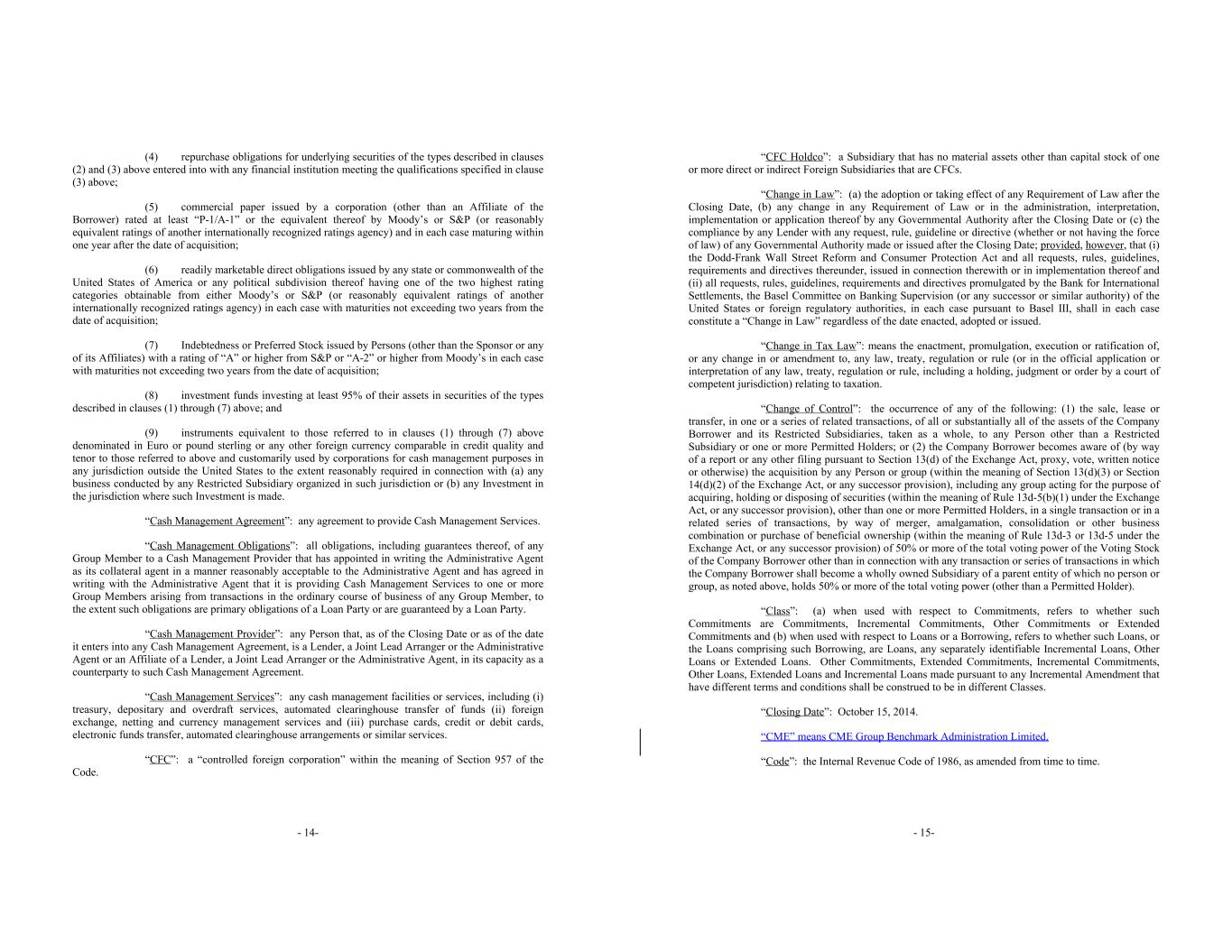 (4) repurchase obligations for underlying securities of the types described in clauses (2) and (3) above entered into with any financial institution meeting the qualifications specified in clause (3) above; (5) commercial paper issued by a corporation (other than an Affiliate of the Borrower) rated at least “P-1/A-1” or the equivalent thereof by Moody’s or S&P (or reasonably equivalent ratings of another internationally recognized ratings agency) and in each case maturing within one year after the date of acquisition; (6) readily marketable direct obligations issued by any state or commonwealth of the United States of America or any political subdivision thereof having one of the two highest rating categories obtainable from either Moody’s or S&P (or reasonably equivalent ratings of another internationally recognized ratings agency) in each case with maturities not exceeding two years from the date of acquisition; (7) Indebtedness or Preferred Stock issued by Persons (other than the Sponsor or any of its Affiliates) with a rating of “A” or higher from S&P or “A-2” or higher from Moody’s in each case with maturities not exceeding two years from the date of acquisition; (8) investment funds investing at least 95% of their assets in securities of the types described in clauses (1) through (7) above; and (9) instruments equivalent to those referred to in clauses (1) through (7) above denominated in Euro or pound sterling or any other foreign currency comparable in credit quality and tenor to those referred to above and customarily used by corporations for cash management purposes in any jurisdiction outside the United States to the extent reasonably required in connection with (a) any business conducted by any Restricted Subsidiary organized in such jurisdiction or (b) any Investment in the jurisdiction where such Investment is made. “Cash Management Agreement”: any agreement to provide Cash Management Services. “Cash Management Obligations”: all obligations, including guarantees thereof, of any Group Member to a Cash Management Provider that has appointed in writing the Administrative Agent as its collateral agent in a manner reasonably acceptable to the Administrative Agent and has agreed in writing with the Administrative Agent that it is providing Cash Management Services to one or more Group Members arising from transactions in the ordinary course of business of any Group Member, to the extent such obligations are primary obligations of a Loan Party or are guaranteed by a Loan Party. “Cash Management Provider”: any Person that, as of the Closing Date or as of the date it enters into any Cash Management Agreement, is a Lender, a Joint Lead Arranger or the Administrative Agent or an Affiliate of a Lender, a Joint Lead Arranger or the Administrative Agent, in its capacity as a counterparty to such Cash Management Agreement. “Cash Management Services”: any cash management facilities or services, including (i) treasury, depositary and overdraft services, automated clearinghouse transfer of funds (ii) foreign exchange, netting and currency management services and (iii) purchase cards, credit or debit cards, electronic funds transfer, automated clearinghouse arrangements or similar services. “CFC”: a “controlled foreign corporation” within the meaning of Section 957 of the Code. - 14- “CFC Holdco”: a Subsidiary that has no material assets other than capital stock of one or more direct or indirect Foreign Subsidiaries that are CFCs. “Change in Law”: (a) the adoption or taking effect of any Requirement of Law after the Closing Date, (b) any change in any Requirement of Law or in the administration, interpretation, implementation or application thereof by any Governmental Authority after the Closing Date or (c) the compliance by any Lender with any request, rule, guideline or directive (whether or not having the force of law) of any Governmental Authority made or issued after the Closing Date; provided, however, that (i) the Dodd-Frank Wall Street Reform and Consumer Protection Act and all requests, rules, guidelines, requirements and directives thereunder, issued in connection therewith or in implementation thereof and (ii) all requests, rules, guidelines, requirements and directives promulgated by the Bank for International Settlements, the Basel Committee on Banking Supervision (or any successor or similar authority) of the United States or foreign regulatory authorities, in each case pursuant to Basel III, shall in each case constitute a “Change in Law” regardless of the date enacted, adopted or issued. “Change in Tax Law”: means the enactment, promulgation, execution or ratification of, or any change in or amendment to, any law, treaty, regulation or rule (or in the official application or interpretation of any law, treaty, regulation or rule, including a holding, judgment or order by a court of competent jurisdiction) relating to taxation. “Change of Control”: the occurrence of any of the following: (1) the sale, lease or transfer, in one or a series of related transactions, of all or substantially all of the assets of the Company Borrower and its Restricted Subsidiaries, taken as a whole, to any Person other than a Restricted Subsidiary or one or more Permitted Holders; or (2) the Company Borrower becomes aware of (by way of a report or any other filing pursuant to Section 13(d) of the Exchange Act, proxy, vote, written notice or otherwise) the acquisition by any Person or group (within the meaning of Section 13(d)(3) or Section 14(d)(2) of the Exchange Act, or any successor provision), including any group acting for the purpose of acquiring, holding or disposing of securities (within the meaning of Rule 13d-5(b)(1) under the Exchange Act, or any successor provision), other than one or more Permitted Holders, in a single transaction or in a related series of transactions, by way of merger, amalgamation, consolidation or other bu