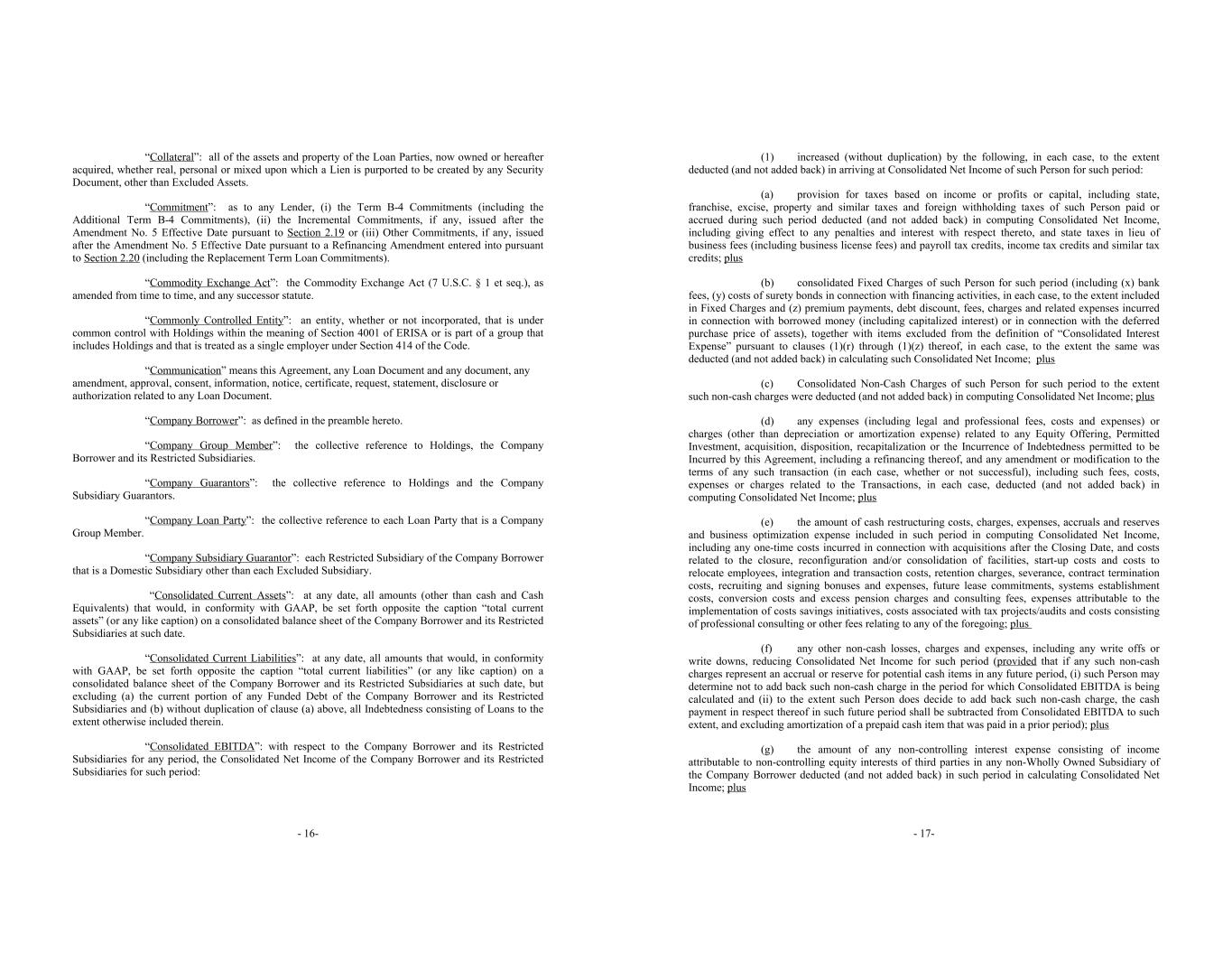 “Collateral”: all of the assets and property of the Loan Parties, now owned or hereafter acquired, whether real, personal or mixed upon which a Lien is purported to be created by any Security Document, other than Excluded Assets. “Commitment”: as to any Lender, (i) the Term B-4 Commitments (including the Additional Term B-4 Commitments), (ii) the Incremental Commitments, if any, issued after the Amendment No. 5 Effective Date pursuant to Section 2.19 or (iii) Other Commitments, if any, issued after the Amendment No. 5 Effective Date pursuant to a Refinancing Amendment entered into pursuant to Section 2.20 (including the Replacement Term Loan Commitments). “Commodity Exchange Act”: the Commodity Exchange Act (7 U.S.C. § 1 et seq.), as amended from time to time, and any successor statute. “Commonly Controlled Entity”: an entity, whether or not incorporated, that is under common control with Holdings within the meaning of Section 4001 of ERISA or is part of a group that includes Holdings and that is treated as a single employer under Section 414 of the Code. “Communication” means this Agreement, any Loan Document and any document, any amendment, approval, consent, information, notice, certificate, request, statement, disclosure or authorization related to any Loan Document. “Company Borrower”: as defined in the preamble hereto. “Company Group Member”: the collective reference to Holdings, the Company Borrower and its Restricted Subsidiaries. “Company Guarantors”: the collective reference to Holdings and the Company Subsidiary Guarantors. “Company Loan Party”: the collective reference to each Loan Party that is a Company Group Member. “Company Subsidiary Guarantor”: each Restricted Subsidiary of the Company Borrower that is a Domestic Subsidiary other than each Excluded Subsidiary. “Consolidated Current Assets”: at any date, all amounts (other than cash and Cash Equivalents) that would, in conformity with GAAP, be set forth opposite the caption “total current assets” (or any like caption) on a consolidated balance sheet of the Company Borrower and its Restricted Subsidiaries at such date. “Consolidated Current Liabilities”: at any date, all amounts that would, in conformity with GAAP, be set forth opposite the caption “total current liabilities” (or any like caption) on a consolidated balance sheet of the Company Borrower and its Restricted Subsidiaries at such date, but excluding (a) the current portion of any Funded Debt of the Company Borrower and its Restricted Subsidiaries and (b) without duplication of clause (a) above, all Indebtedness consisting of Loans to the extent otherwise included therein. “Consolidated EBITDA”: with respect to the Company Borrower and its Restricted Subsidiaries for any period, the Consolidated Net Income of the Company Borrower and its Restricted Subsidiaries for such period: - 16- (1) increased (without duplication) by the following, in each case, to the extent deducted (and not added back) in arriving at Consolidated Net Income of such Person for such period: (a) provision for taxes based on income or profits or capital, including state, franchise, excise, property and similar taxes and foreign withholding taxes of such Person paid or accrued during such period deducted (and not added back) in computing Consolidated Net Income, including giving effect to any penalties and interest with respect thereto, and state taxes in lieu of business fees (including business license fees) and payroll tax credits, income tax credits and similar tax credits; plus (b) consolidated Fixed Charges of such Person for such period (including (x) bank fees, (y) costs of surety bonds in connection with financing activities, in each case, to the extent included in Fixed Charges and (z) premium payments, debt discount, fees, charges and related expenses incurred in connection with borrowed money (including capitalized interest) or in connection with the deferred purchase price of assets), together with items excluded from the definition of “Consolidated Interest Expense” pursuant to clauses (1)(r) through (1)(z) thereof, in each case, to the extent the same was deducted (and not added back) in calculating such Consolidated Net Income; plus (c) Consolidated Non-Cash Charges of such Person for such period to the extent such non-cash charges were deducted (and not added back) in computing Consolidated Net Income; plus (d) any expenses (including legal and professional fees, costs and expenses) or charges (other than depreciation or amortization expense) related to any Equity Offering, Permitted Investment, acquisition, disposition, recapitalization or the Incurrence of Indebtedness permitted to be Incurred by this Agreement, including a refinancing thereof, and any amendment or modification to the terms of any such transaction (in each case, whether or not successful), including such fees, costs, expenses or charges related to the Transactions, in each case, deducted (and not added back) in computing Consolidated Net Income; plus (e) the amount of cash restructuring costs, charges, expenses, accruals and reserves and business optimization expense included in such period in computing Consolidated Net Income, including any one-time costs incurred in connection with acquisitions after the Closing Date, and costs related to the closure, reconfiguration and/or consolidation of facilities, start-up costs and costs to relocate employees, integration and transaction costs, retention charges, severance, contract termination costs, recruiting and signing bonuses and expenses, future lease commitments, systems establishment costs, conversion costs and excess pension charges and consulting fees, expenses attributable to the implementation of costs savings initiatives, costs associated with tax projects/audits and costs consisting of professional consulting or other fees relating to any of the foregoing; plus (f) any other non-cash lo