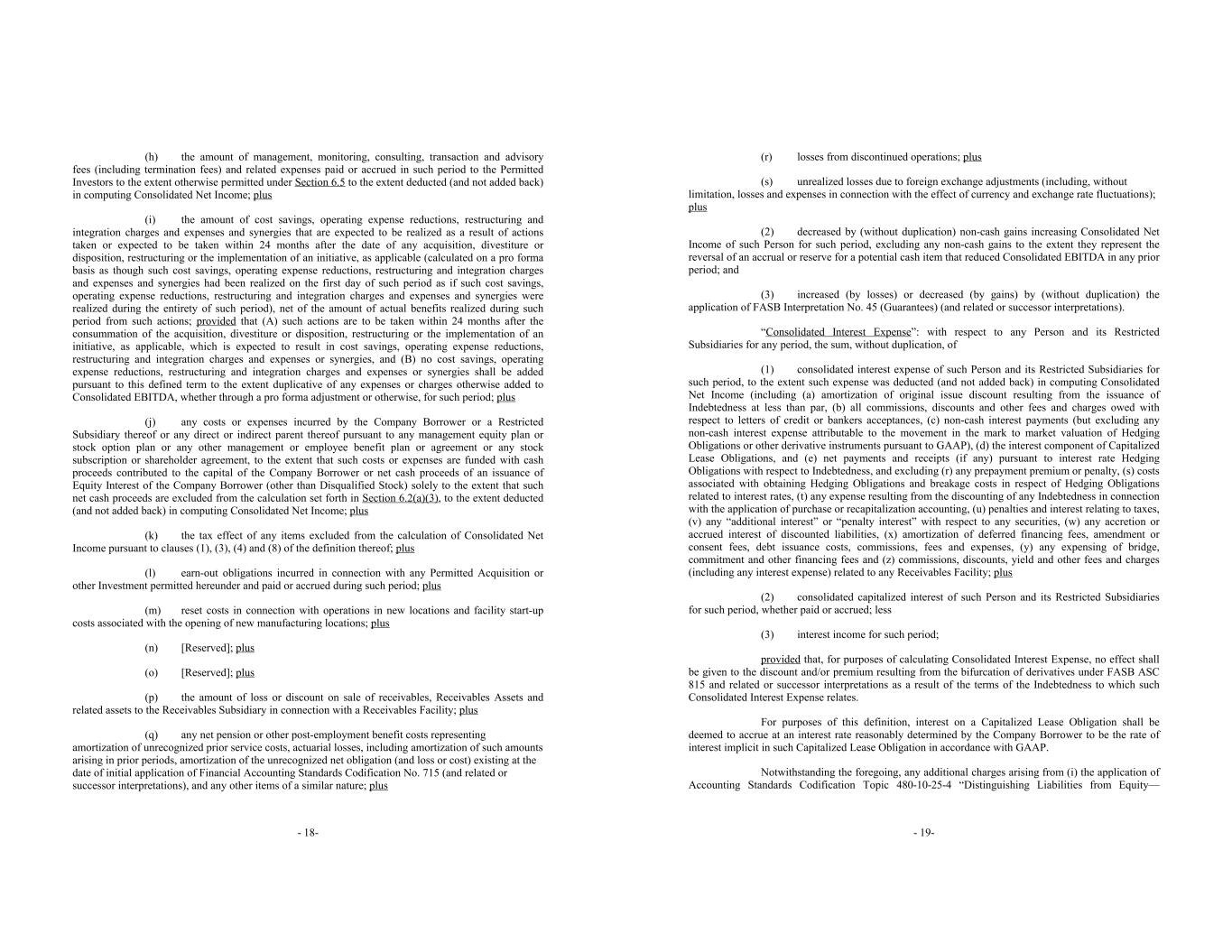 (h) the amount of management, monitoring, consulting, transaction and advisory fees (including termination fees) and related expenses paid or accrued in such period to the Permitted Investors to the extent otherwise permitted under Section 6.5 to the extent deducted (and not added back) in computing Consolidated Net Income; plus (i) the amount of cost savings, operating expense reductions, restructuring and integration charges and expenses and synergies that are expected to be realized as a result of actions taken or expected to be taken within 24 months after the date of any acquisition, divestiture or disposition, restructuring or the implementation of an initiative, as applicable (calculated on a pro forma basis as though such cost savings, operating expense reductions, restructuring and integration charges and expenses and synergies had been realized on the first day of such period as if such cost savings, operating expense reductions, restructuring and integration charges and expenses and synergies were realized during the entirety of such period), net of the amount of actual benefits realized during such period from such actions; provided that (A) such actions are to be taken within 24 months after the consummation of the acquisition, divestiture or disposition, restructuring or the implementation of an initiative, as applicable, which is expected to result in cost savings, operating expense reductions, restructuring and integration charges and expenses or synergies, and (B) no cost savings, operating expense reductions, restructuring and integration charges and expenses or synergies shall be added pursuant to this defined term to the extent duplicative of any expenses or charges otherwise added to Consolidated EBITDA, whether through a pro forma adjustment or otherwise, for such period; plus (j) any costs or expenses incurred by the Company Borrower or a Restricted Subsidiary thereof or any direct or indirect parent thereof pursuant to any management equity plan or stock option plan or any other management or employee benefit plan or agreement or any stock subscription or shareholder agreement, to the extent that such costs or expenses are funded with cash proceeds contributed to the capital of the Company Borrower or net cash proceeds of an issuance of Equity Interest of the Company Borrower (other than Disqualified Stock) solely to the extent that such net cash proceeds are excluded from the calculation set forth in Section 6.2(a)(3), to the extent deducted (and not added back) in computing Consolidated Net Income; plus (k) the tax effect of any items excluded from the calculation of Consolidated Net Income pursuant to clauses (1), (3), (4) and (8) of the definition thereof; plus (l) earn-out obligations incurred in connection with any Permitted Acquisition or other Investment permitted hereunder and paid or accrued during such period; plus (m) reset costs in connection with operations in new locations and facility start-up costs associated with the opening of new manufacturing locations; plus (n) [Reserved]; plus (o) [Reserved]; plus (p) the amount of loss or discount on sale of receivables, Receivables Assets and related assets to the Receivables Subsidiary in connection with a Receivables Facility; plus (q) any net pension or other post-employment benefit costs representing amortization of unrecognized prior service costs, actuarial losses, including amortization of such amounts arising in prior periods, amortization of the unrecognized net obligation (and loss or cost) existing at the date of initial application of Financial Accounting Standards Codification No. 715 (and related or successor interpretations), and any other items of a similar nature; plus - 18- (r) losses from discontinued operations; plus (s) unrealized losses due to foreign exchange adjustments (including, without limitation, losses and expenses in connection with the effect of currency and exchange rate fluctuations); plus (2) decreased by (without duplication) non-cash gains increasing Consolidated Net Income of such Person for such period, excluding any non-cash gains to the extent they represent the reversal of an accrual or reserve for a potential cash item that reduced Consolidated EBITDA in any prior period; and (3) increased (by losses) or decreased (by gains) by (without duplication) the application of FASB Interpretation No. 45 (Guarantees) (and related or successor interpretations). “Consolidated Interest Expense”: with respect to any Person and its Restricted Subsidiaries for any period, the sum, without duplication, of (1) consolidated interest expense of such Person and its Restricted Subsidiaries for such period, to the extent such expense was deducted (and not added back) in computing Consolidated Net Income (including (a) amortization of original issue discount resulting from the issuance of Indebtedness at less than par, (b) all commissions, discounts and other fees and charges owed with respect to letters of credit or bankers acceptances, (c) non-cash interest payments (but excluding any non-cash interest expense attributable to the movement in the mark to market valuation of Hedging Obligations or other derivative instruments pursuant to GAAP), (d) the interest component of Capitalized Lease Obligations, and (e) net payments and receipts (if any) pursuant to interest rate Hedging Obligations with respect to Indebtedness, and excluding (r) any prepayment premium or penalty, (s) costs associated with obtaining Hedging Obligations and breakage costs in respect of Hedging Obligations related to interest rates, (t) any expense resulting from the discounting of any Indebtedness in connection with the application of purchase or recapitalization accounting, (u) penalties and interest relating to taxes, (v) any “additional interest” or “penalty interest” with respect to any securities, (w) any accretion or accrued interest of discounted liabilities, (x) amortization of deferred financ