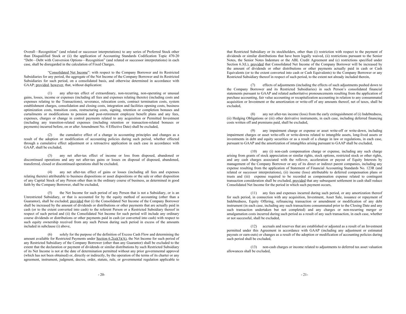 Overall—Recognition” (and related or successor interpretations) to any series of Preferred Stock other than Disqualified Stock or (ii) the application of Accounting Standards Codification Topic 470-20 “Debt—Debt with Conversion Options—Recognition” (and related or successor interpretations) in each case, shall be disregarded in the calculation of Fixed Charges. “Consolidated Net Income”: with respect to the Company Borrower and its Restricted Subsidiaries for any period, the aggregate of the Net Income of the Company Borrower and its Restricted Subsidiaries for such period, on a consolidated basis, and otherwise determined in accordance with GAAP; provided, however, that, without duplication: (1) any after-tax effect of extraordinary, non-recurring, non-operating or unusual gains, losses, income or expenses (including all fees and expenses relating thereto) (including costs and expenses relating to the Transactions), severance, relocation costs, contract termination costs, system establishment charges, consolidation and closing costs, integration and facilities opening costs, business optimization costs, transition costs, restructuring costs, signing, retention or completion bonuses and curtailments or modifications to pension and post-retirement employee benefit plans and any fees, expenses, charges or change in control payments related to any acquisition or Permitted Investment (including any transition-related expenses (including retention or transaction-related bonuses or payments) incurred before, on or after Amendment No. 4 Effective Date) shall be excluded, (2) the cumulative effect of a change in accounting principles and changes as a result of the adoption or modification of accounting policies during such period, whether effected through a cumulative effect adjustment or a retroactive application in each case in accordance with GAAP, shall be excluded, (3) any net after-tax effect of income or loss from disposed, abandoned or discontinued operations and any net after-tax gains or losses on disposal of disposed, abandoned, transferred, closed or discontinued operations shall be excluded, (4) any net after-tax effect of gains or losses (including all fees and expenses relating thereto) attributable to business dispositions or asset dispositions or the sale or other disposition of any Capital Stock of any Person other than in the ordinary course of business, as determined in good faith by the Company Borrower, shall be excluded, (5) the Net Income for such period of any Person that is not a Subsidiary, or is an Unrestricted Subsidiary, or that is accounted for by the equity method of accounting (other than a Guarantor), shall be excluded; provided that (i) the Consolidated Net Income of the Company Borrower shall be increased by the amount of dividends or distributions or other payments that are actually paid in cash (or to the extent converted into cash) to the referent Person or a Restricted Subsidiary thereof in respect of such period and (ii) the Consolidated Net Income for such period will include any ordinary course dividends or distributions or other payments paid in cash (or converted into cash) with respect to such equity ownership received from any such Person during such period in excess of the amounts included in subclause (i) above, (6) solely for the purpose of the definition of Excess Cash Flow and determining the amount available for Restricted Payments under Section 6.2(a)(3)(A), the Net Income for such period of any Restricted Subsidiary of the Company Borrower (other than any Guarantor) shall be excluded to the extent that the declaration or payment of dividends or similar distributions by such Restricted Subsidiary of its Net Income is not at the date of determination permitted without any prior governmental approval (which has not been obtained) or, directly or indirectly, by the operation of the terms of its charter or any agreement, instrument, judgment, decree, order, statute, rule, or governmental regulation applicable to - 20- that Restricted Subsidiary or its stockholders, other than (i) restriction with respect to the payment of dividends or similar distributions that have been legally waived, (ii) restrictions pursuant to the Senior Notes, the Senior Notes Indenture or the ABL Credit Agreement and (c) restrictions specified under Section 6.3(L), provided that Consolidated Net Income of the Company Borrower will be increased by the amount of dividends or other distributions or other payments actually paid in cash or Cash Equivalents (or to the extent converted into cash or Cash Equivalents) to the Company Borrower or any Restricted Subsidiary thereof in respect of such period, to the extent not already included therein, (7) effects of adjustments (including the effects of such adjustments pushed down to the Company Borrower and its Restricted Subsidiaries) in such Person’s consolidated financial statements pursuant to GAAP and related authoritative pronouncements resulting from the application of purchase accounting, fair value accounting or recapitalization accounting in relation to any consummated acquisition or Investment or the amortization or write-off of any amounts thereof, net of taxes, shall be excluded, (8) any net after-tax income (loss) from the early extinguishment of (i) Indebtedness, (ii) Hedging Obligations or (iii) other derivative instruments, in each case, including deferred financing costs written off and premiums paid, shall be excluded, (9) any impairment charge or expense or asset write-off or write-down, including impairment charges or asset write-offs or write-downs related to intangible assets, long-lived assets or investments in debt and equity securities or as a result of a change in law or regulations, in each case, pursuant to GAAP and the amortization of intangibles arising pursuant to GAAP shall be excluded, (10) any (i) non-cash compensation charge or expense, including any such charge arising from gran