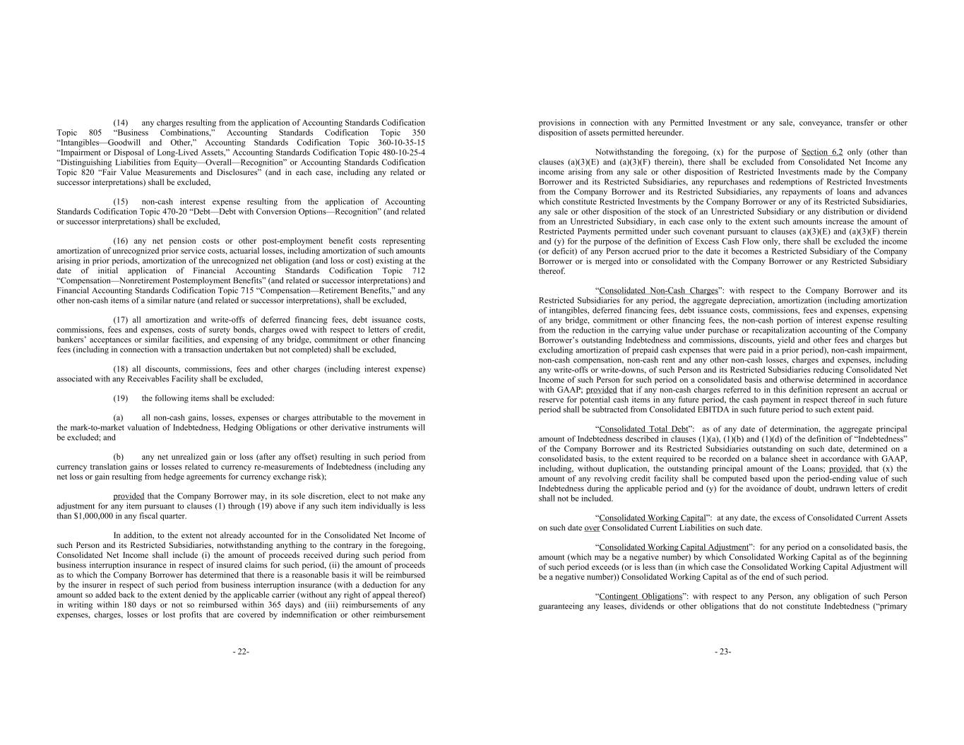 (14) any charges resulting from the application of Accounting Standards Codification Topic 805 “Business Combinations,” Accounting Standards Codification Topic 350 “Intangibles—Goodwill and Other,” Accounting Standards Codification Topic 360-10-35-15 “Impairment or Disposal of Long-Lived Assets,” Accounting Standards Codification Topic 480-10-25-4 “Distinguishing Liabilities from Equity—Overall—Recognition” or Accounting Standards Codification Topic 820 “Fair Value Measurements and Disclosures” (and in each case, including any related or successor interpretations) shall be excluded, (15) non-cash interest expense resulting from the application of Accounting Standards Codification Topic 470-20 “Debt—Debt with Conversion Options—Recognition” (and related or successor interpretations) shall be excluded, (16) any net pension costs or other post-employment benefit costs representing amortization of unrecognized prior service costs, actuarial losses, including amortization of such amounts arising in prior periods, amortization of the unrecognized net obligation (and loss or cost) existing at the date of initial application of Financial Accounting Standards Codification Topic 712 “Compensation—Nonretirement Postemployment Benefits” (and related or successor interpretations) and Financial Accounting Standards Codification Topic 715 “Compensation—Retirement Benefits,” and any other non-cash items of a similar nature (and related or successor interpretations), shall be excluded, (17) all amortization and write-offs of deferred financing fees, debt issuance costs, commissions, fees and expenses, costs of surety bonds, charges owed with respect to letters of credit, bankers’ acceptances or similar facilities, and expensing of any bridge, commitment or other financing fees (including in connection with a transaction undertaken but not completed) shall be excluded, (18) all discounts, commissions, fees and other charges (including interest expense) associated with any Receivables Facility shall be excluded, (19) the following items shall be excluded: (a) all non-cash gains, losses, expenses or charges attributable to the movement in the mark-to-market valuation of Indebtedness, Hedging Obligations or other derivative instruments will be excluded; and (b) any net unrealized gain or loss (after any offset) resulting in such period from currency translation gains or losses related to currency re-measurements of Indebtedness (including any net loss or gain resulting from hedge agreements for currency exchange risk); provided that the Company Borrower may, in its sole discretion, elect to not make any adjustment for any item pursuant to clauses (1) through (19) above if any such item individually is less than $1,000,000 in any fiscal quarter. In addition, to the extent not already accounted for in the Consolidated Net Income of such Person and its Restricted Subsidiaries, notwithstanding anything to the contrary in the foregoing, Consolidated Net Income shall include (i) the amount of proceeds received during such period from business interruption insurance in respect of insured claims for such period, (ii) the amount of proceeds as to which the Company Borrower has determined that there is a reasonable basis it will be reimbursed by the insurer in respect of such period from business interruption insurance (with a deduction for any amount so added back to the extent denied by the applicable carrier (without any right of appeal thereof) in writing within 180 days or not so reimbursed within 365 days) and (iii) reimbursements of any expenses, charges, losses or lost profits that are covered by indemnification or other reimbursement - 22- provisions in connection with any Permitted Investment or any sale, conveyance, transfer or other disposition of assets permitted hereunder. Notwithstanding the foregoing, (x) for the purpose of Section 6.2 only (other than clauses (a)(3)(E) and (a)(3)(F) therein), there shall be excluded from Consolidated Net Income any income arising from any sale or other disposition of Restricted Investments made by the Company Borrower and its Restricted Subsidiaries, any repurchases and redemptions of Restricted Investments from the Company Borrower and its Restricted Subsidiaries, any repayments of loans and advances which constitute Restricted Investments by the Company Borrower or any of its Restricted Subsidiaries, any sale or other disposition of the stock of an Unrestricted Subsidiary or any distribution or dividend from an Unrestricted Subsidiary, in each case only to the extent such amounts increase the amount of Restricted Payments permitted under such covenant pursuant to clauses (a)(3)(E) and (a)(3)(F) therein and (y) for the purpose of the definition of Excess Cash Flow only, there shall be excluded the income (or deficit) of any Person accrued prior to the date it becomes a Restricted Subsidiary of the Company Borrower or is merged into or consolidated with the Company Borrower or any Restricted Subsidiary thereof. “Consolidated Non-Cash Charges”: with respect to the Company Borrower and its Restricted Subsidiaries for any period, the aggregate depreciation, amortization (including amortization of intangibles, deferred financing fees, debt issuance costs, commissions, fees and expenses, expensing of any bridge, commitment or other financing fees, the non-cash portion of interest expense resulting from the reduction in the carrying value under purchase or recapitalization accounting of the Company Borrower’s outstanding Indebtedness and commissions, discounts, yield and other fees and charges but excluding amortization of prepaid cash expenses that were paid in a prior period), non-cash impairment, non-cash compensation, non-cash rent and any other non-cash losses, charges and expenses, including any write-offs or write-downs, of such Person and its Restricted Subsidiaries reducing Consolidated Net Income of such Person