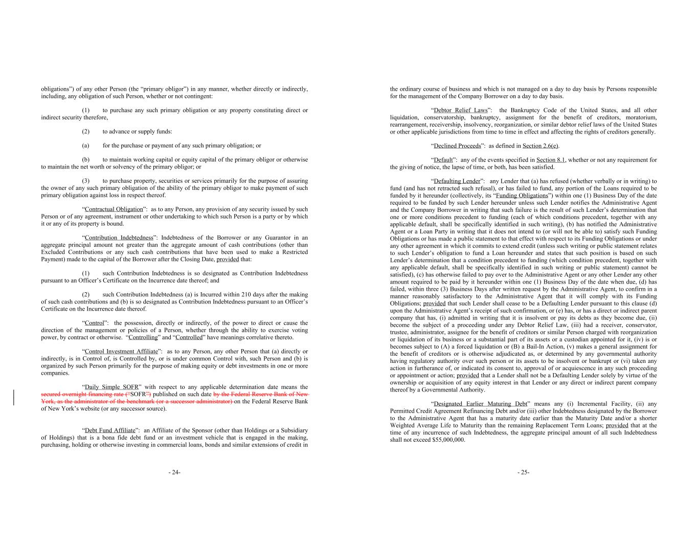 obligations”) of any other Person (the “primary obligor”) in any manner, whether directly or indirectly, including, any obligation of such Person, whether or not contingent: (1) to purchase any such primary obligation or any property constituting direct or indirect security therefore, (2) to advance or supply funds: (a) for the purchase or payment of any such primary obligation; or (b) to maintain working capital or equity capital of the primary obligor or otherwise to maintain the net worth or solvency of the primary obligor; or (3) to purchase property, securities or services primarily for the purpose of assuring the owner of any such primary obligation of the ability of the primary obligor to make payment of such primary obligation against loss in respect thereof. “Contractual Obligation”: as to any Person, any provision of any security issued by such Person or of any agreement, instrument or other undertaking to which such Person is a party or by which it or any of its property is bound. “Contribution Indebtedness”: Indebtedness of the Borrower or any Guarantor in an aggregate principal amount not greater than the aggregate amount of cash contributions (other than Excluded Contributions or any such cash contributions that have been used to make a Restricted Payment) made to the capital of the Borrower after the Closing Date, provided that: (1) such Contribution Indebtedness is so designated as Contribution Indebtedness pursuant to an Officer’s Certificate on the Incurrence date thereof; and (2) such Contribution Indebtedness (a) is Incurred within 210 days after the making of such cash contributions and (b) is so designated as Contribution Indebtedness pursuant to an Officer’s Certificate on the Incurrence date thereof. “Control”: the possession, directly or indirectly, of the power to direct or cause the direction of the management or policies of a Person, whether through the ability to exercise voting power, by contract or otherwise. “Controlling” and “Controlled” have meanings correlative thereto. “Control Investment Affiliate”: as to any Person, any other Person that (a) directly or indirectly, is in Control of, is Controlled by, or is under common Control with, such Person and (b) is organized by such Person primarily for the purpose of making equity or debt investments in one or more companies. “Daily Simple SOFR” with respect to any applicable determination date means the secured overnight financing rate (“SOFR”) published on such date by the Federal Reserve Bank of New York, as the administrator of the benchmark (or a successor administrator) on the Federal Reserve Bank of New York’s website (or any successor source). “Debt Fund Affiliate”: an Affiliate of the Sponsor (other than Holdings or a Subsidiary of Holdings) that is a bona fide debt fund or an investment vehicle that is engaged in the making, purchasing, holding or otherwise investing in commercial loans, bonds and similar extensions of credit in - 24- the ordinary course of business and which is not managed on a day to day basis by Persons responsible for the management of the Company Borrower on a day to day basis. “Debtor Relief Laws”: the Bankruptcy Code of the United States, and all other liquidation, conservatorship, bankruptcy, assignment for the benefit of creditors, moratorium, rearrangement, receivership, insolvency, reorganization, or similar debtor relief laws of the United States or other applicable jurisdictions from time to time in effect and affecting the rights of creditors generally. “Declined Proceeds”: as defined in Section 2.6(e). “Default”: any of the events specified in Section 8.1, whether or not any requirement for the giving of notice, the lapse of time, or both, has been satisfied. “Defaulting Lender”: any Lender that (a) has refused (whether verbally or in writing) to fund (and has not retracted such refusal), or has failed to fund, any portion of the Loans required to be funded by it hereunder (collectively, its “Funding Obligations”) within one (1) Business Day of the date required to be funded by such Lender hereunder unless such Lender notifies the Administrative Agent and the Company Borrower in writing that such failure is the result of such Lender’s determination that one or more conditions precedent to funding (each of which conditions precedent, together with any applicable default, shall be specifically identified in such writing), (b) has notified the Administrative Agent or a Loan Party in writing that it does not intend to (or will not be able to) satisfy such Funding Obligations or has made a public statement to that effect with respect to its Funding Obligations or under any other agreement in which it commits to extend credit (unless such writing or public statement relates to such Lender’s obligation to fund a Loan hereunder and states that such position is based on such Lender’s determination that a condition precedent to funding (which condition precedent, together with any applicable default, shall be specifically identified in such writing or public statement) cannot be satisfied), (c) has otherwise failed to pay over to the Administrative Agent or any other Lender any other amount required to be paid by it hereunder within one (1) Business Day of the date when due, (d) has failed, within three (3) Business Days after written request by the Administrative Agent, to confirm in a manner reasonably satisfactory to the Administrative Agent that it will comply with its Funding Obligations; provided that such Lender shall cease to be a Defaulting Lender pursuant to this clause (d) upon the Administrative Agent’s receipt of such confirmation, or (e) has, or has a direct or indirect parent company that has, (i) admitted in writing that it is insolvent or pay its debts as they become due, (ii) become the subject of a proceeding under any Debtor Relief Law, (iii) had a receiver, conservator, trustee, adm