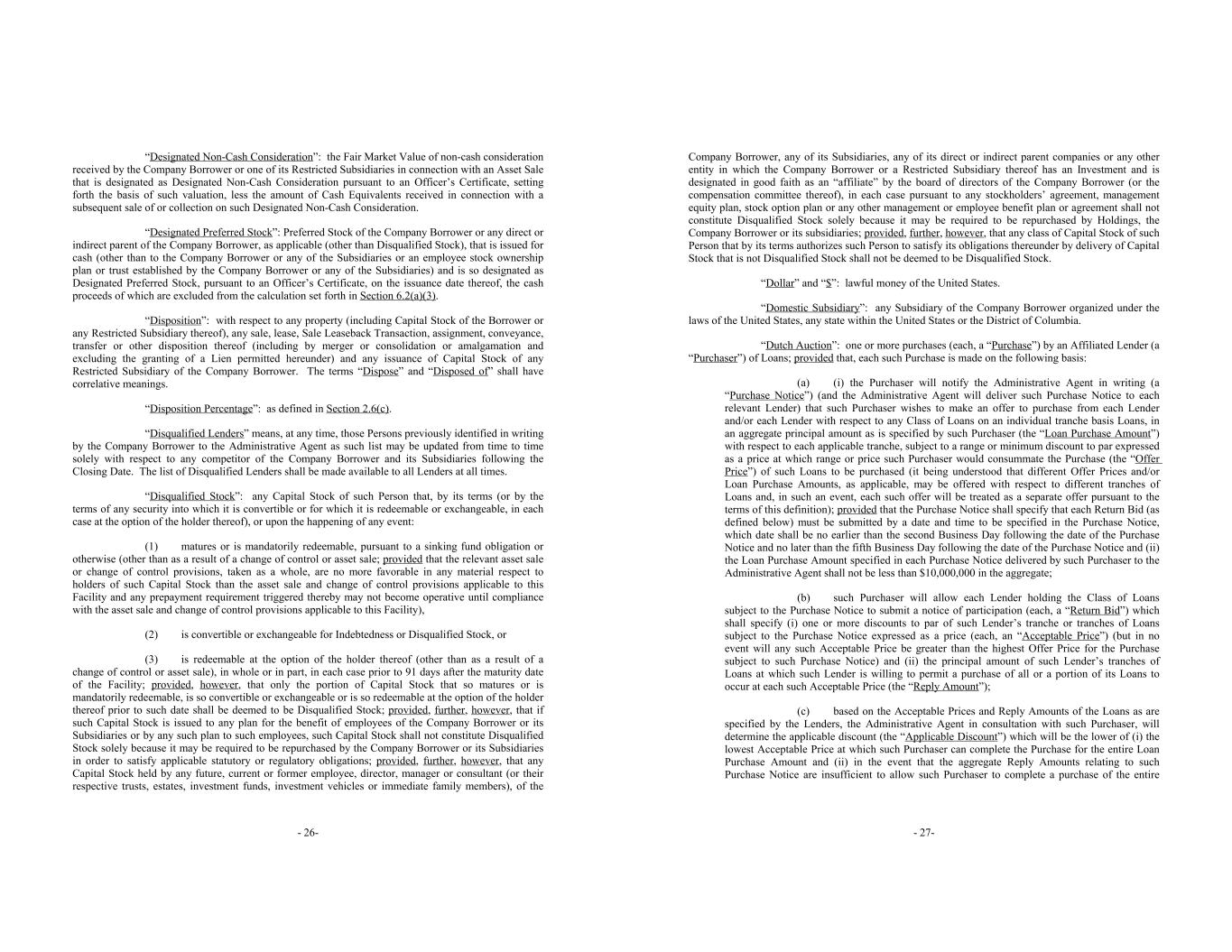 “Designated Non-Cash Consideration”: the Fair Market Value of non-cash consideration received by the Company Borrower or one of its Restricted Subsidiaries in connection with an Asset Sale that is designated as Designated Non-Cash Consideration pursuant to an Officer’s Certificate, setting forth the basis of such valuation, less the amount of Cash Equivalents received in connection with a subsequent sale of or collection on such Designated Non-Cash Consideration. “Designated Preferred Stock”: Preferred Stock of the Company Borrower or any direct or indirect parent of the Company Borrower, as applicable (other than Disqualified Stock), that is issued for cash (other than to the Company Borrower or any of the Subsidiaries or an employee stock ownership plan or trust established by the Company Borrower or any of the Subsidiaries) and is so designated as Designated Preferred Stock, pursuant to an Officer’s Certificate, on the issuance date thereof, the cash proceeds of which are excluded from the calculation set forth in Section 6.2(a)(3). “Disposition”: with respect to any property (including Capital Stock of the Borrower or any Restricted Subsidiary thereof), any sale, lease, Sale Leaseback Transaction, assignment, conveyance, transfer or other disposition thereof (including by merger or consolidation or amalgamation and excluding the granting of a Lien permitted hereunder) and any issuance of Capital Stock of any Restricted Subsidiary of the Company Borrower. The terms “Dispose” and “Disposed of” shall have correlative meanings. “Disposition Percentage”: as defined in Section 2.6(c). “Disqualified Lenders” means, at any time, those Persons previously identified in writing by the Company Borrower to the Administrative Agent as such list may be updated from time to time solely with respect to any competitor of the Company Borrower and its Subsidiaries following the Closing Date. The list of Disqualified Lenders shall be made available to all Lenders at all times. “Disqualified Stock”: any Capital Stock of such Person that, by its terms (or by the terms of any security into which it is convertible or for which it is redeemable or exchangeable, in each case at the option of the holder thereof), or upon the happening of any event: (1) matures or is mandatorily redeemable, pursuant to a sinking fund obligation or otherwise (other than as a result of a change of control or asset sale; provided that the relevant asset sale or change of control provisions, taken as a whole, are no more favorable in any material respect to holders of such Capital Stock than the asset sale and change of control provisions applicable to this Facility and any prepayment requirement triggered thereby may not become operative until compliance with the asset sale and change of control provisions applicable to this Facility), (2) is convertible or exchangeable for Indebtedness or Disqualified Stock, or (3) is redeemable at the option of the holder thereof (other than as a result of a change of control or asset sale), in whole or in part, in each case prior to 91 days after the maturity date of the Facility; provided, however, that only the portion of Capital Stock that so matures or is mandatorily redeemable, is so convertible or exchangeable or is so redeemable at the option of the holder thereof prior to such date shall be deemed to be Disqualified Stock; provided, further, however, that if such Capital Stock is issued to any plan for the benefit of employees of the Company Borrower or its Subsidiaries or by any such plan to such employees, such Capital Stock shall not constitute Disqualified Stock solely because it may be required to be repurchased by the Company Borrower or its Subsidiaries in order to satisfy applicable statutory or regulatory obligations; provided, further, however, that any Capital Stock held by any future, current or former employee, director, manager or consultant (or their respective trusts, estates, investment funds, investment vehicles or immediate family members), of the - 26- Company Borrower, any of its Subsidiaries, any of its direct or indirect parent companies or any other entity in which the Company Borrower or a Restricted Subsidiary thereof has an Investment and is designated in good faith as an “affiliate” by the board of directors of the Company Borrower (or the compensation committee thereof), in each case pursuant to any stockholders’ agreement, management equity plan, stock option plan or any other management or employee benefit plan or agreement shall not constitute Disqualified Stock solely because it may be required to be repurchased by Holdings, the Company Borrower or its subsidiaries; provided, further, however, that any class of Capital Stock of such Person that by its terms authorizes such Person to satisfy its obligations thereunder by delivery of Capital Stock that is not Disqualified Stock shall not be deemed to be Disqualified Stock. “Dollar” and “$”: lawful money of the United States. “Domestic Subsidiary”: any Subsidiary of the Company Borrower organized under the laws of the United States, any state within the United States or the District of Columbia. “Dutch Auction”: one or more purchases (each, a “Purchase”) by an Affiliated Lender (a “Purchaser”) of Loans; provided that, each such Purchase is made on the following basis: (a) (i) the Purchaser will notify the Administrative Agent in writing (a “Purchase Notice”) (and the Administrative Agent will deliver such Purchase Notice to each relevant Lender) that such Purchaser wishes to make an offer to purchase from each Lender and/or each Lender with respect to any Class of Loans on an individual tranche basis Loans, in an aggregate principal amount as is specified by such Purchaser (the “Loan Purchase Amount”) with respect to each applicable tranche, subject to a range or minimum discount to par expressed as a price at which range or price such