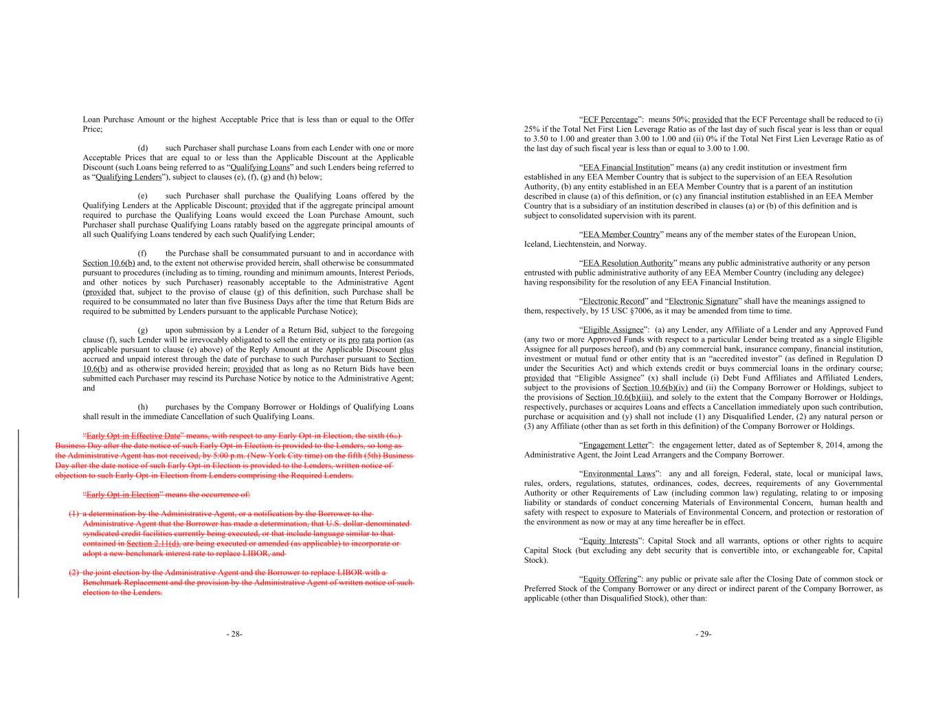 Loan Purchase Amount or the highest Acceptable Price that is less than or equal to the Offer Price; (d) such Purchaser shall purchase Loans from each Lender with one or more Acceptable Prices that are equal to or less than the Applicable Discount at the Applicable Discount (such Loans being referred to as “Qualifying Loans” and such Lenders being referred to as “Qualifying Lenders”), subject to clauses (e), (f), (g) and (h) below; (e) such Purchaser shall purchase the Qualifying Loans offered by the Qualifying Lenders at the Applicable Discount; provided that if the aggregate principal amount required to purchase the Qualifying Loans would exceed the Loan Purchase Amount, such Purchaser shall purchase Qualifying Loans ratably based on the aggregate principal amounts of all such Qualifying Loans tendered by each such Qualifying Lender; (f) the Purchase shall be consummated pursuant to and in accordance with Section 10.6(b) and, to the extent not otherwise provided herein, shall otherwise be consummated pursuant to procedures (including as to timing, rounding and minimum amounts, Interest Periods, and other notices by such Purchaser) reasonably acceptable to the Administrative Agent (provided that, subject to the proviso of clause (g) of this definition, such Purchase shall be required to be consummated no later than five Business Days after the time that Return Bids are required to be submitted by Lenders pursuant to the applicable Purchase Notice); (g) upon submission by a Lender of a Return Bid, subject to the foregoing clause (f), such Lender will be irrevocably obligated to sell the entirety or its pro rata portion (as applicable pursuant to clause (e) above) of the Reply Amount at the Applicable Discount plus accrued and unpaid interest through the date of purchase to such Purchaser pursuant to Section 10.6(b) and as otherwise provided herein; provided that as long as no Return Bids have been submitted each Purchaser may rescind its Purchase Notice by notice to the Administrative Agent; and (h) purchases by the Company Borrower or Holdings of Qualifying Loans shall result in the immediate Cancellation of such Qualifying Loans. “Early Opt-in Effective Date” means, with respect to any Early Opt-in Election, the sixth (6th) Business Day after the date notice of such Early Opt-in Election is provided to the Lenders, so long as the Administrative Agent has not received, by 5:00 p.m. (New York City time) on the fifth (5th) Business Day after the date notice of such Early Opt-in Election is provided to the Lenders, written notice of objection to such Early Opt-in Election from Lenders comprising the Required Lenders. “Early Opt-in Election” means the occurrence of: (1) a determination by the Administrative Agent, or a notification by the Borrower to the Administrative Agent that the Borrower has made a determination, that U.S. dollar-denominated syndicated credit facilities currently being executed, or that include language similar to that contained in Section 2.11(d), are being executed or amended (as applicable) to incorporate or adopt a new benchmark interest rate to replace LIBOR, and (2) the joint election by the Administrative Agent and the Borrower to replace LIBOR with a Benchmark Replacement and the provision by the Administrative Agent of written notice of such election to the Lenders. - 28- “ECF Percentage”: means 50%; provided that the ECF Percentage shall be reduced to (i) 25% if the Total Net First Lien Leverage Ratio as of the last day of such fiscal year is less than or equal to 3.50 to 1.00 and greater than 3.00 to 1.00 and (ii) 0% if the Total Net First Lien Leverage Ratio as of the last day of such fiscal year is less than or equal to 3.00 to 1.00. “EEA Financial Institution” means (a) any credit institution or investment firm established in any EEA Member Country that is subject to the supervision of an EEA Resolution Authority, (b) any entity established in an EEA Member Country that is a parent of an institution described in clause (a) of this definition, or (c) any financial institution established in an EEA Member Country that is a subsidiary of an institution described in clauses (a) or (b) of this definition and is subject to consolidated supervision with its parent. “EEA Member Country” means any of the member states of the European Union, Iceland, Liechtenstein, and Norway. “EEA Resolution Authority” means any public administrative authority or any person entrusted with public administrative authority of any EEA Member Country (including any delegee) having responsibility for the resolution of any EEA Financial Institution. “Electronic Record” and “Electronic Signature” shall have the meanings assigned to them, respectively, by 15 USC §7006, as it may be amended from time to time. “Eligible Assignee”: (a) any Lender, any Affiliate of a Lender and any Approved Fund (any two or more Approved Funds with respect to a particular Lender being treated as a single Eligible Assignee for all purposes hereof), and (b) any commercial bank, insurance company, financial institution, investment or mutual fund or other entity that is an “accredited investor” (as defined in Regulation D under the Securities Act) and which extends credit or buys commercial loans in the ordinary course; provided that “Eligible Assignee” (x) shall include (i) Debt Fund Affiliates and Affiliated Lenders, subject to the provisions of Section 10.6(b)(iv) and (ii) the Company Borrower or Holdings, subject to the provisions of Section 10.6(b)(iii), and solely to the extent that the Company Borrower or Holdings, respectively, purchases or acquires Loans and effects a Cancellation immediately upon such contribution, purchase or acquisition and (y) shall not include (1) any Disqualified Lender, (2) any natural person or (3) any Affiliate (other than as set forth in this definition) of the Company Borrower or Holdings. “Engagement Letter”: the engageme