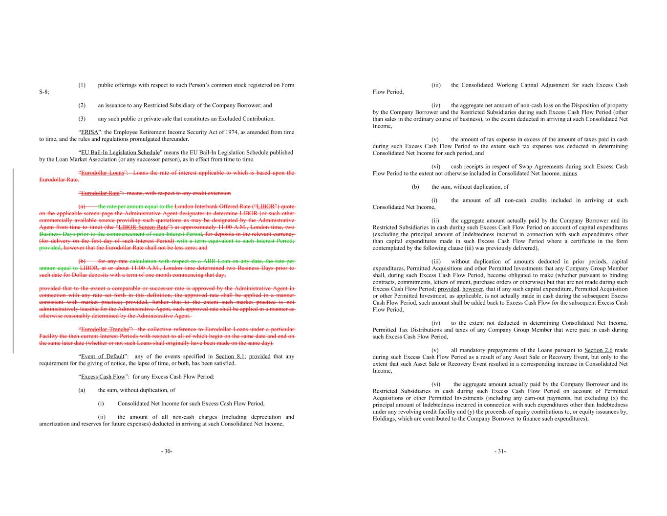 (1) public offerings with respect to such Person’s common stock registered on Form S-8; (2) an issuance to any Restricted Subsidiary of the Company Borrower; and (3) any such public or private sale that constitutes an Excluded Contribution. “ERISA”: the Employee Retirement Income Security Act of 1974, as amended from time to time, and the rules and regulations promulgated thereunder. “EU Bail-In Legislation Schedule” means the EU Bail-In Legislation Schedule published by the Loan Market Association (or any successor person), as in effect from time to time. “Eurodollar Loans”: Loans the rate of interest applicable to which is based upon the Eurodollar Rate. “Eurodollar Rate”: means, with respect to any credit extension (a) the rate per annum equal to the London Interbank Offered Rate (“LIBOR”) quote on the applicable screen page the Administrative Agent designates to determine LIBOR (or such other commercially available source providing such quotations as may be designated by the Administrative Agent from time to time) (the “LIBOR Screen Rate”) at approximately 11:00 A.M., London time, two Business Days prior to the commencement of such Interest Period, for deposits in the relevant currency (for delivery on the first day of such Interest Period) with a term equivalent to such Interest Period; provided, however that the Eurodollar Rate shall not be less zero; and (b) for any rate calculation with respect to a ABR Loan on any date, the rate per annum equal to LIBOR, at or about 11:00 A.M., London time determined two Business Days prior to such date for Dollar deposits with a term of one month commencing that day; provided that to the extent a comparable or successor rate is approved by the Administrative Agent in connection with any rate set forth in this definition, the approved rate shall be applied in a manner consistent with market practice; provided, further that to the extent such market practice is not administratively feasible for the Administrative Agent, such approved rate shall be applied in a manner as otherwise reasonably determined by the Administrative Agent. “Eurodollar Tranche”: the collective reference to Eurodollar Loans under a particular Facility the then current Interest Periods with respect to all of which begin on the same date and end on the same later date (whether or not such Loans shall originally have been made on the same day). “Event of Default”: any of the events specified in Section 8.1; provided that any requirement for the giving of notice, the lapse of time, or both, has been satisfied. “Excess Cash Flow”: for any Excess Cash Flow Period: (a) the sum, without duplication, of (i) Consolidated Net Income for such Excess Cash Flow Period, (ii) the amount of all non-cash charges (including depreciation and amortization and reserves for future expenses) deducted in arriving at such Consolidated Net Income, - 30- (iii) the Consolidated Working Capital Adjustment for such Excess Cash Flow Period, (iv) the aggregate net amount of non-cash loss on the Disposition of property by the Company Borrower and the Restricted Subsidiaries during such Excess Cash Flow Period (other than sales in the ordinary course of business), to the extent deducted in arriving at such Consolidated Net Income, (v) the amount of tax expense in excess of the amount of taxes paid in cash during such Excess Cash Flow Period to the extent such tax expense was deducted in determining Consolidated Net Income for such period, and (vi) cash receipts in respect of Swap Agreements during such Excess Cash Flow Period to the extent not otherwise included in Consolidated Net Income, minus (b) the sum, without duplication, of (i) the amount of all non-cash credits included in arriving at such Consolidated Net Income, (ii) the aggregate amount actually paid by the Company Borrower and its Restricted Subsidiaries in cash during such Excess Cash Flow Period on account of capital expenditures (excluding the principal amount of Indebtedness incurred in connection with such expenditures other than capital expenditures made in such Excess Cash Flow Period where a certificate in the form contemplated by the following clause (iii) was previously delivered), (iii) without duplication of amounts deducted in prior periods, capital expenditures, Permitted Acquisitions and other Permitted Investments that any Company Group Member shall, during such Excess Cash Flow Period, become obligated to make (whether pursuant to binding contracts, commitments, letters of intent, purchase orders or otherwise) but that are not made during such Excess Cash Flow Period; provided, however, that if any such capital expenditure, Permitted Acquisition or other Permitted Investment, as applicable, is not actually made in cash during the subsequent Excess Cash Flow Period, such amount shall be added back to Excess Cash Flow for the subsequent Excess Cash Flow Period, (iv) to the extent not deducted in determining Consolidated Net Income, Permitted Tax Distributions and taxes of any Company Group Member that were paid in cash during such Excess Cash Flow Period, (v) all mandatory prepayments of the Loans pursuant to Section 2.6 made during such Excess Cash Flow Period as a result of any Asset Sale or Recovery Event, but only to the extent that such Asset Sale or Recovery Event resulted in a corresponding increase in Consolidated Net Income, (vi) the aggregate amount actually paid by the Company Borrower and its Restricted Subsidiaries in cash during such Excess Cash Flow Period on account of Permitted Acquisitions or other Permitted Investments (including any earn-out payments, but excluding (x) the principal amount of Indebtedness incurred in connection with such expenditures other than Indebtedness under any revolving credit facility and (y) the proceeds of equity contributions to, or equity issuances by, Holdings, which are contributed to the Company Borrower to finance such expenditures), - 31-