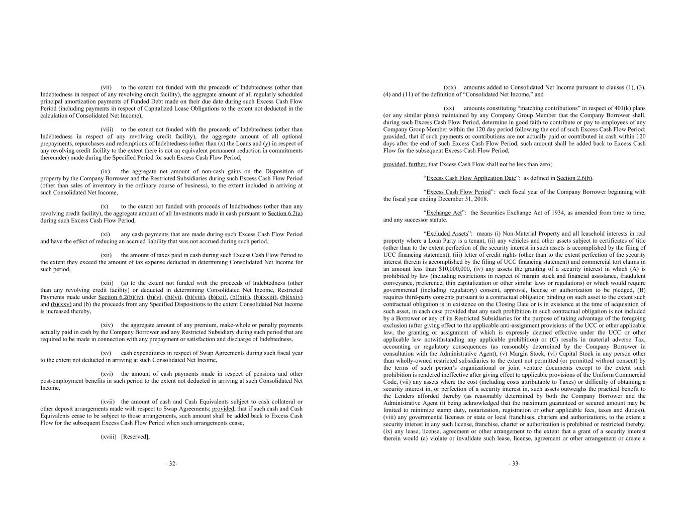 (vii) to the extent not funded with the proceeds of Indebtedness (other than Indebtedness in respect of any revolving credit facility), the aggregate amount of all regularly scheduled principal amortization payments of Funded Debt made on their due date during such Excess Cash Flow Period (including payments in respect of Capitalized Lease Obligations to the extent not deducted in the calculation of Consolidated Net Income), (viii) to the extent not funded with the proceeds of Indebtedness (other than Indebtedness in respect of any revolving credit facility), the aggregate amount of all optional prepayments, repurchases and redemptions of Indebtedness (other than (x) the Loans and (y) in respect of any revolving credit facility to the extent there is not an equivalent permanent reduction in commitments thereunder) made during the Specified Period for such Excess Cash Flow Period, (ix) the aggregate net amount of non-cash gains on the Disposition of property by the Company Borrower and the Restricted Subsidiaries during such Excess Cash Flow Period (other than sales of inventory in the ordinary course of business), to the extent included in arriving at such Consolidated Net Income, (x) to the extent not funded with proceeds of Indebtedness (other than any revolving credit facility), the aggregate amount of all Investments made in cash pursuant to Section 6.2(a) during such Excess Cash Flow Period, (xi) any cash payments that are made during such Excess Cash Flow Period and have the effect of reducing an accrued liability that was not accrued during such period, (xii) the amount of taxes paid in cash during such Excess Cash Flow Period to the extent they exceed the amount of tax expense deducted in determining Consolidated Net Income for such period, (xiii) (a) to the extent not funded with the proceeds of Indebtedness (other than any revolving credit facility) or deducted in determining Consolidated Net Income, Restricted Payments made under Section 6.2(b)(iv), (b)(v), (b)(vi), (b)(viii), (b)(xii), (b)(xiii), (b)(xxiii), (b)(xxiv) and (b)(xxv) and (b) the proceeds from any Specified Dispositions to the extent Consolidated Net Income is increased thereby, (xiv) the aggregate amount of any premium, make-whole or penalty payments actually paid in cash by the Company Borrower and any Restricted Subsidiary during such period that are required to be made in connection with any prepayment or satisfaction and discharge of Indebtedness, (xv) cash expenditures in respect of Swap Agreements during such fiscal year to the extent not deducted in arriving at such Consolidated Net Income, (xvi) the amount of cash payments made in respect of pensions and other post-employment benefits in such period to the extent not deducted in arriving at such Consolidated Net Income, (xvii) the amount of cash and Cash Equivalents subject to cash collateral or other deposit arrangements made with respect to Swap Agreements; provided, that if such cash and Cash Equivalents cease to be subject to those arrangements, such amount shall be added back to Excess Cash Flow for the subsequent Excess Cash Flow Period when such arrangements cease, (xviii) [Reserved], - 32- (xix) amounts added to Consolidated Net Income pursuant to clauses (1), (3), (4) and (11) of the definition of “Consolidated Net Income,” and (xx) amounts constituting “matching contributions” in respect of 401(k) plans (or any similar plans) maintained by any Company Group Member that the Company Borrower shall, during such Excess Cash Flow Period, determine in good faith to contribute or pay to employees of any Company Group Member within the 120 day period following the end of such Excess Cash Flow Period; provided, that if such payments or contributions are not actually paid or contributed in cash within 120 days after the end of such Excess Cash Flow Period, such amount shall be added back to Excess Cash Flow for the subsequent Excess Cash Flow Period; provided, further, that Excess Cash Flow shall not be less than zero; “Excess Cash Flow Application Date”: as defined in Section 2.6(b). “Excess Cash Flow Period”: each fiscal year of the Company Borrower beginning with the fiscal year ending December 31, 2018. “Exchange Act”: the Securities Exchange Act of 1934, as amended from time to time, and any successor statute. “Excluded Assets”: means (i) Non-Material Property and all leasehold interests in real property where a Loan Party is a tenant, (ii) any vehicles and other assets subject to certificates of title (other than to the extent perfection of the security interest in such assets is accomplished by the filing of UCC financing statement), (iii) letter of credit rights (other than to the extent perfection of the security interest therein is accomplished by the filing of UCC financing statement) and commercial tort claims in an amount less than $10,000,000, (iv) any assets the granting of a security interest in which (A) is prohibited by law (including restrictions in respect of margin stock and financial assistance, fraudulent conveyance, preference, thin capitalization or other similar laws or regulations) or which would require governmental (including regulatory) consent, approval, license or authorization to be pledged, (B) requires third-party consents pursuant to a contractual obligation binding on such asset to the extent such contractual obligation is in existence on the Closing Date or is in existence at the time of acquisition of such asset, in each case provided that any such prohibition in such contractual obligation is not included by a Borrower or any of its Restricted Subsidiaries for the purpose of taking advantage of the foregoing exclusion (after giving effect to the applicable anti-assignment provisions of the UCC or other applicable law, the granting or assignment of which is expressly deemed effective under the UCC or other applicable law notwithstanding any applicable prohibition) or (C) results in material a