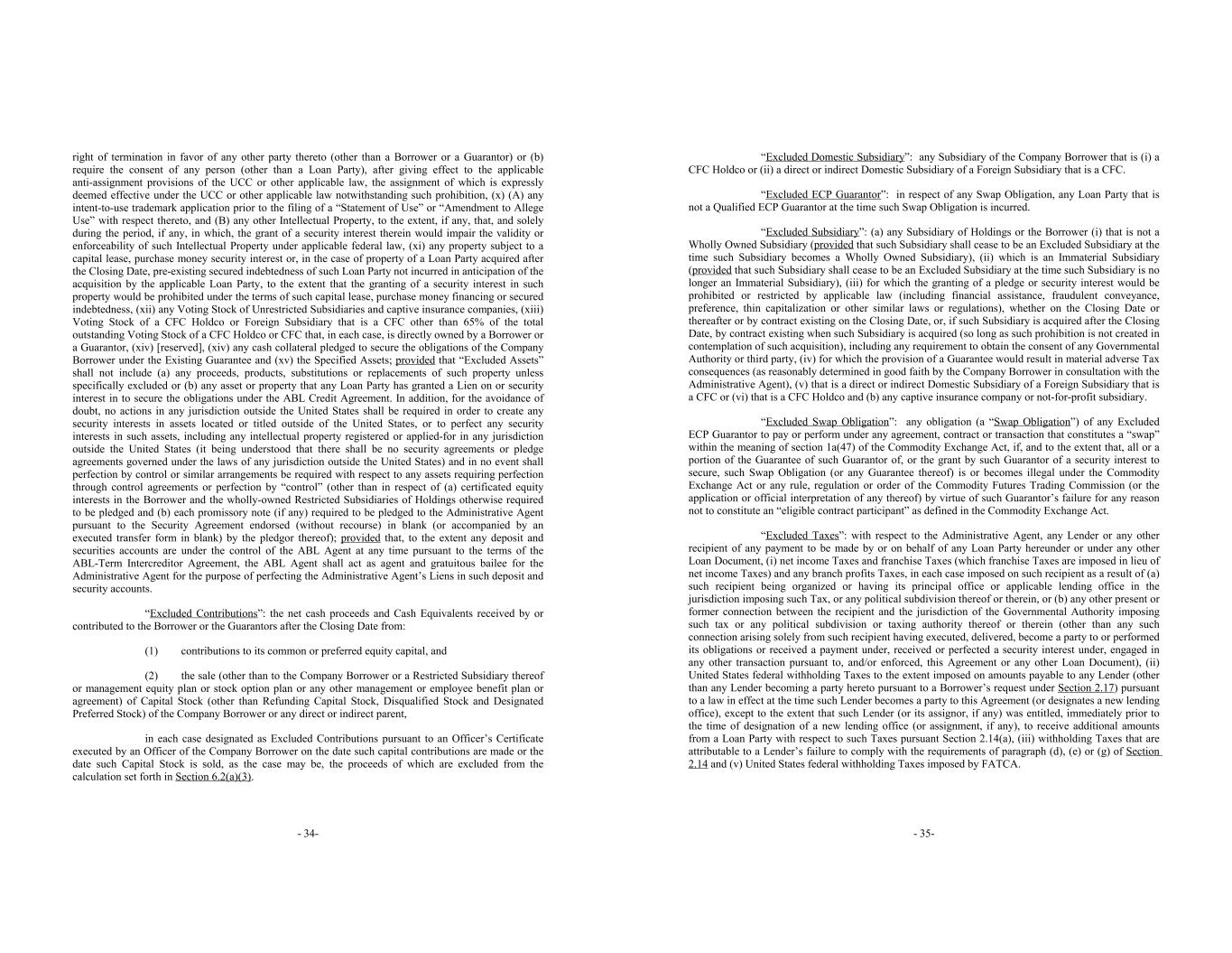 right of termination in favor of any other party thereto (other than a Borrower or a Guarantor) or (b) require the consent of any person (other than a Loan Party), after giving effect to the applicable anti-assignment provisions of the UCC or other applicable law, the assignment of which is expressly deemed effective under the UCC or other applicable law notwithstanding such prohibition, (x) (A) any intent-to-use trademark application prior to the filing of a “Statement of Use” or “Amendment to Allege Use” with respect thereto, and (B) any other Intellectual Property, to the extent, if any, that, and solely during the period, if any, in which, the grant of a security interest therein would impair the validity or enforceability of such Intellectual Property under applicable federal law, (xi) any property subject to a capital lease, purchase money security interest or, in the case of property of a Loan Party acquired after the Closing Date, pre-existing secured indebtedness of such Loan Party not incurred in anticipation of the acquisition by the applicable Loan Party, to the extent that the granting of a security interest in such property would be prohibited under the terms of such capital lease, purchase money financing or secured indebtedness, (xii) any Voting Stock of Unrestricted Subsidiaries and captive insurance companies, (xiii) Voting Stock of a CFC Holdco or Foreign Subsidiary that is a CFC other than 65% of the total outstanding Voting Stock of a CFC Holdco or CFC that, in each case, is directly owned by a Borrower or a Guarantor, (xiv) [reserved], (xiv) any cash collateral pledged to secure the obligations of the Company Borrower under the Existing Guarantee and (xv) the Specified Assets; provided that “Excluded Assets” shall not include (a) any proceeds, products, substitutions or replacements of such property unless specifically excluded or (b) any asset or property that any Loan Party has granted a Lien on or security interest in to secure the obligations under the ABL Credit Agreement. In addition, for the avoidance of doubt, no actions in any jurisdiction outside the United States shall be required in order to create any security interests in assets located or titled outside of the United States, or to perfect any security interests in such assets, including any intellectual property registered or applied-for in any jurisdiction outside the United States (it being understood that there shall be no security agreements or pledge agreements governed under the laws of any jurisdiction outside the United States) and in no event shall perfection by control or similar arrangements be required with respect to any assets requiring perfection through control agreements or perfection by “control” (other than in respect of (a) certificated equity interests in the Borrower and the wholly-owned Restricted Subsidiaries of Holdings otherwise required to be pledged and (b) each promissory note (if any) required to be pledged to the Administrative Agent pursuant to the Security Agreement endorsed (without recourse) in blank (or accompanied by an executed transfer form in blank) by the pledgor thereof); provided that, to the extent any deposit and securities accounts are under the control of the ABL Agent at any time pursuant to the terms of the ABL-Term Intercreditor Agreement, the ABL Agent shall act as agent and gratuitous bailee for the Administrative Agent for the purpose of perfecting the Administrative Agent’s Liens in such deposit and security accounts. “Excluded Contributions”: the net cash proceeds and Cash Equivalents received by or contributed to the Borrower or the Guarantors after the Closing Date from: (1) contributions to its common or preferred equity capital, and (2) the sale (other than to the Company Borrower or a Restricted Subsidiary thereof or management equity plan or stock option plan or any other management or employee benefit plan or agreement) of Capital Stock (other than Refunding Capital Stock, Disqualified Stock and Designated Preferred Stock) of the Company Borrower or any direct or indirect parent, in each case designated as Excluded Contributions pursuant to an Officer’s Certificate executed by an Officer of the Company Borrower on the date such capital contributions are made or the date such Capital Stock is sold, as the case may be, the proceeds of which are excluded from the calculation set forth in Section 6.2(a)(3). - 34- “Excluded Domestic Subsidiary”: any Subsidiary of the Company Borrower that is (i) a CFC Holdco or (ii) a direct or indirect Domestic Subsidiary of a Foreign Subsidiary that is a CFC. “Excluded ECP Guarantor”: in respect of any Swap Obligation, any Loan Party that is not a Qualified ECP Guarantor at the time such Swap Obligation is incurred. “Excluded Subsidiary”: (a) any Subsidiary of Holdings or the Borrower (i) that is not a Wholly Owned Subsidiary (provided that such Subsidiary shall cease to be an Excluded Subsidiary at the time such Subsidiary becomes a Wholly Owned Subsidiary), (ii) which is an Immaterial Subsidiary (provided that such Subsidiary shall cease to be an Excluded Subsidiary at the time such Subsidiary is no longer an Immaterial Subsidiary), (iii) for which the granting of a pledge or security interest would be prohibited or restricted by applicable law (including financial assistance, fraudulent conveyance, preference, thin capitalization or other similar laws or regulations), whether on the Closing Date or thereafter or by contract existing on the Closing Date, or, if such Subsidiary is acquired after the Closing Date, by contract existing when such Subsidiary is acquired (so long as such prohibition is not created in contemplation of such acquisition), including any requirement to obtain the consent of any Governmental Authority or third party, (iv) for which the provision of a Guarantee would result in material adverse Tax consequences (as reasonably determined in good faith by
