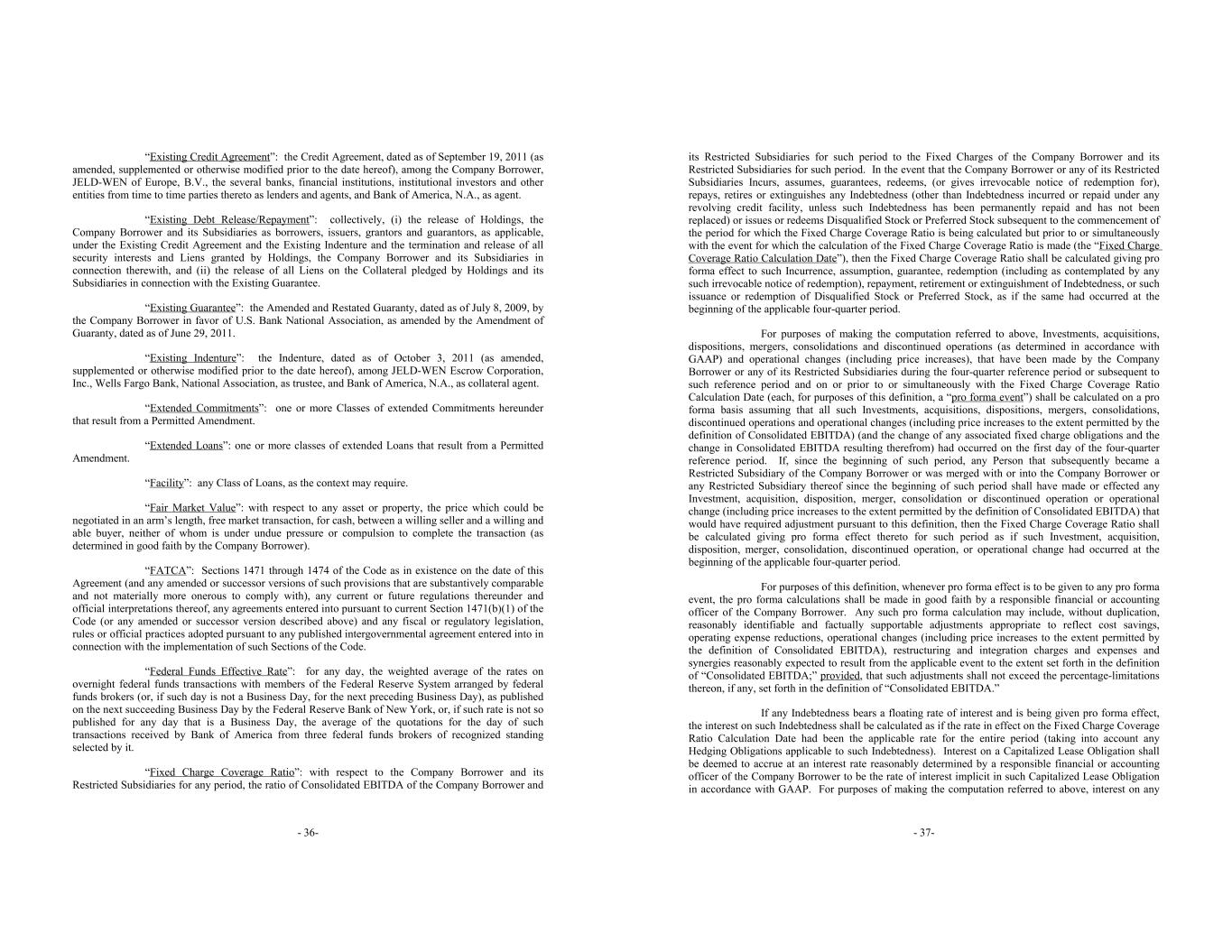 “Existing Credit Agreement”: the Credit Agreement, dated as of September 19, 2011 (as amended, supplemented or otherwise modified prior to the date hereof), among the Company Borrower, JELD-WEN of Europe, B.V., the several banks, financial institutions, institutional investors and other entities from time to time parties thereto as lenders and agents, and Bank of America, N.A., as agent. “Existing Debt Release/Repayment”: collectively, (i) the release of Holdings, the Company Borrower and its Subsidiaries as borrowers, issuers, grantors and guarantors, as applicable, under the Existing Credit Agreement and the Existing Indenture and the termination and release of all security interests and Liens granted by Holdings, the Company Borrower and its Subsidiaries in connection therewith, and (ii) the release of all Liens on the Collateral pledged by Holdings and its Subsidiaries in connection with the Existing Guarantee. “Existing Guarantee”: the Amended and Restated Guaranty, dated as of July 8, 2009, by the Company Borrower in favor of U.S. Bank National Association, as amended by the Amendment of Guaranty, dated as of June 29, 2011. “Existing Indenture”: the Indenture, dated as of October 3, 2011 (as amended, supplemented or otherwise modified prior to the date hereof), among JELD-WEN Escrow Corporation, Inc., Wells Fargo Bank, National Association, as trustee, and Bank of America, N.A., as collateral agent. “Extended Commitments”: one or more Classes of extended Commitments hereunder that result from a Permitted Amendment. “Extended Loans”: one or more classes of extended Loans that result from a Permitted Amendment. “Facility”: any Class of Loans, as the context may require. “Fair Market Value”: with respect to any asset or property, the price which could be negotiated in an arm’s length, free market transaction, for cash, between a willing seller and a willing and able buyer, neither of whom is under undue pressure or compulsion to complete the transaction (as determined in good faith by the Company Borrower). “FATCA”: Sections 1471 through 1474 of the Code as in existence on the date of this Agreement (and any amended or successor versions of such provisions that are substantively comparable and not materially more onerous to comply with), any current or future regulations thereunder and official interpretations thereof, any agreements entered into pursuant to current Section 1471(b)(1) of the Code (or any amended or successor version described above) and any fiscal or regulatory legislation, rules or official practices adopted pursuant to any published intergovernmental agreement entered into in connection with the implementation of such Sections of the Code. “Federal Funds Effective Rate”: for any day, the weighted average of the rates on overnight federal funds transactions with members of the Federal Reserve System arranged by federal funds brokers (or, if such day is not a Business Day, for the next preceding Business Day), as published on the next succeeding Business Day by the Federal Reserve Bank of New York, or, if such rate is not so published for any day that is a Business Day, the average of the quotations for the day of such transactions received by Bank of America from three federal funds brokers of recognized standing selected by it. “Fixed Charge Coverage Ratio”: with respect to the Company Borrower and its Restricted Subsidiaries for any period, the ratio of Consolidated EBITDA of the Company Borrower and - 36- its Restricted Subsidiaries for such period to the Fixed Charges of the Company Borrower and its Restricted Subsidiaries for such period. In the event that the Company Borrower or any of its Restricted Subsidiaries Incurs, assumes, guarantees, redeems, (or gives irrevocable notice of redemption for), repays, retires or extinguishes any Indebtedness (other than Indebtedness incurred or repaid under any revolving credit facility, unless such Indebtedness has been permanently repaid and has not been replaced) or issues or redeems Disqualified Stock or Preferred Stock subsequent to the commencement of the period for which the Fixed Charge Coverage Ratio is being calculated but prior to or simultaneously with the event for which the calculation of the Fixed Charge Coverage Ratio is made (the “Fixed Charge Coverage Ratio Calculation Date”), then the Fixed Charge Coverage Ratio shall be calculated giving pro forma effect to such Incurrence, assumption, guarantee, redemption (including as contemplated by any such irrevocable notice of redemption), repayment, retirement or extinguishment of Indebtedness, or such issuance or redemption of Disqualified Stock or Preferred Stock, as if the same had occurred at the beginning of the applicable four-quarter period. For purposes of making the computation referred to above, Investments, acquisitions, dispositions, mergers, consolidations and discontinued operations (as determined in accordance with GAAP) and operational changes (including price increases), that have been made by the Company Borrower or any of its Restricted Subsidiaries during the four-quarter reference period or subsequent to such reference period and on or prior to or simultaneously with the Fixed Charge Coverage Ratio Calculation Date (each, for purposes of this definition, a “pro forma event”) shall be calculated on a pro forma basis assuming that all such Investments, acquisitions, dispositions, mergers, consolidations, discontinued operations and operational changes (including price increases to the extent permitted by the definition of Consolidated EBITDA) (and the change of any associated fixed charge obligations and the change in Consolidated EBITDA resulting therefrom) had occurred on the first day of the four-quarter reference period. If, since the beginning of such period, any Person that subsequently became a Restricted Subsidiary of the Company Borrower or was merged with or into the Company Borro