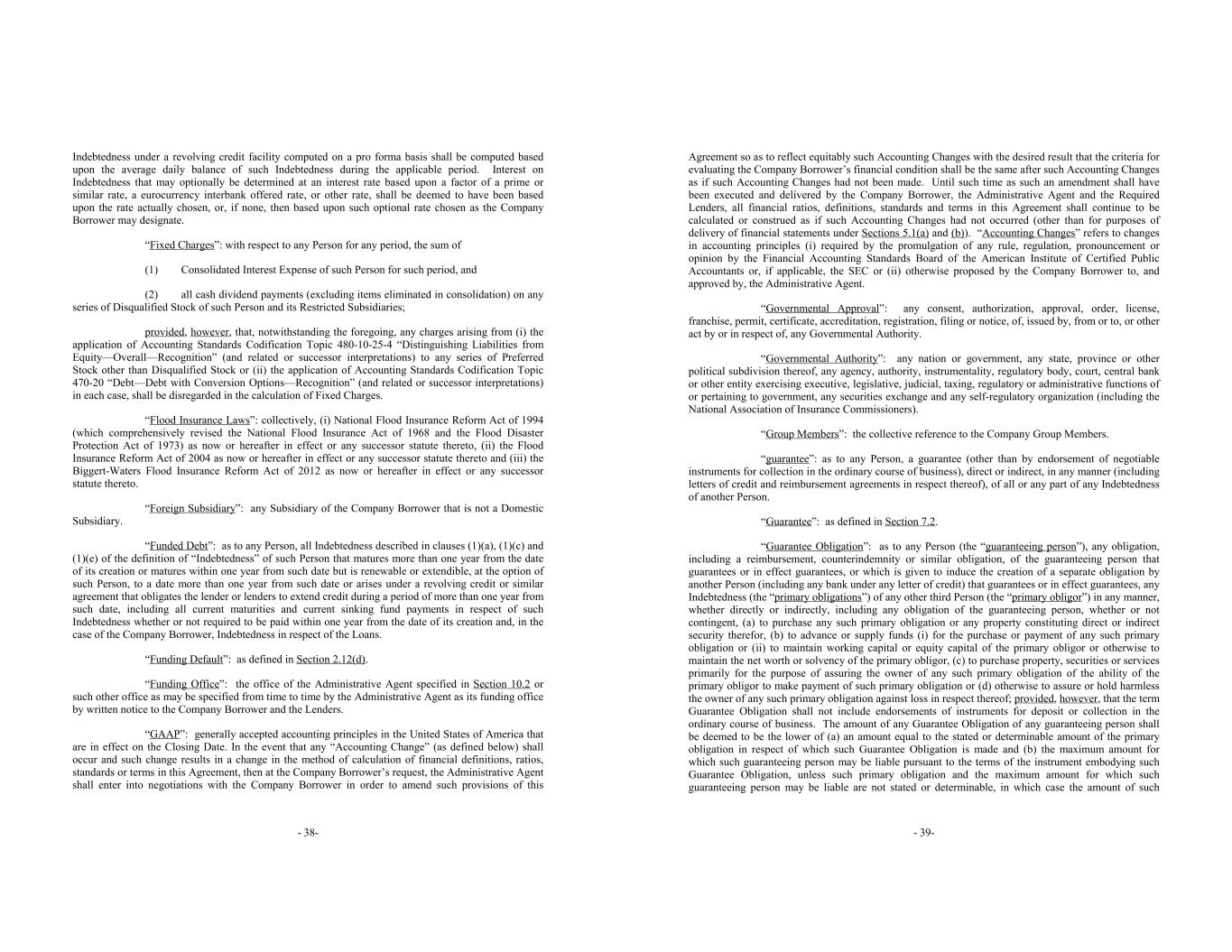 Indebtedness under a revolving credit facility computed on a pro forma basis shall be computed based upon the average daily balance of such Indebtedness during the applicable period. Interest on Indebtedness that may optionally be determined at an interest rate based upon a factor of a prime or similar rate, a eurocurrency interbank offered rate, or other rate, shall be deemed to have been based upon the rate actually chosen, or, if none, then based upon such optional rate chosen as the Company Borrower may designate. “Fixed Charges”: with respect to any Person for any period, the sum of (1) Consolidated Interest Expense of such Person for such period, and (2) all cash dividend payments (excluding items eliminated in consolidation) on any series of Disqualified Stock of such Person and its Restricted Subsidiaries; provided, however, that, notwithstanding the foregoing, any charges arising from (i) the application of Accounting Standards Codification Topic 480-10-25-4 “Distinguishing Liabilities from Equity—Overall—Recognition” (and related or successor interpretations) to any series of Preferred Stock other than Disqualified Stock or (ii) the application of Accounting Standards Codification Topic 470-20 “Debt—Debt with Conversion Options—Recognition” (and related or successor interpretations) in each case, shall be disregarded in the calculation of Fixed Charges. “Flood Insurance Laws”: collectively, (i) National Flood Insurance Reform Act of 1994 (which comprehensively revised the National Flood Insurance Act of 1968 and the Flood Disaster Protection Act of 1973) as now or hereafter in effect or any successor statute thereto, (ii) the Flood Insurance Reform Act of 2004 as now or hereafter in effect or any successor statute thereto and (iii) the Biggert-Waters Flood Insurance Reform Act of 2012 as now or hereafter in effect or any successor statute thereto. “Foreign Subsidiary”: any Subsidiary of the Company Borrower that is not a Domestic Subsidiary. “Funded Debt”: as to any Person, all Indebtedness described in clauses (1)(a), (1)(c) and (1)(e) of the definition of “Indebtedness” of such Person that matures more than one year from the date of its creation or matures within one year from such date but is renewable or extendible, at the option of such Person, to a date more than one year from such date or arises under a revolving credit or similar agreement that obligates the lender or lenders to extend credit during a period of more than one year from such date, including all current maturities and current sinking fund payments in respect of such Indebtedness whether or not required to be paid within one year from the date of its creation and, in the case of the Company Borrower, Indebtedness in respect of the Loans. “Funding Default”: as defined in Section 2.12(d). “Funding Office”: the office of the Administrative Agent specified in Section 10.2 or such other office as may be specified from time to time by the Administrative Agent as its funding office by written notice to the Company Borrower and the Lenders. “GAAP”: generally accepted accounting principles in the United States of America that are in effect on the Closing Date. In the event that any “Accounting Change” (as defined below) shall occur and such change results in a change in the method of calculation of financial definitions, ratios, standards or terms in this Agreement, then at the Company Borrower’s request, the Administrative Agent shall enter into negotiations with the Company Borrower in order to amend such provisions of this - 38- Agreement so as to reflect equitably such Accounting Changes with the desired result that the criteria for evaluating the Company Borrower’s financial condition shall be the same after such Accounting Changes as if such Accounting Changes had not been made. Until such time as such an amendment shall have been executed and delivered by the Company Borrower, the Administrative Agent and the Required Lenders, all financial ratios, definitions, standards and terms in this Agreement shall continue to be calculated or construed as if such Accounting Changes had not occurred (other than for purposes of delivery of financial statements under Sections 5.1(a) and (b)). “Accounting Changes” refers to changes in accounting principles (i) required by the promulgation of any rule, regulation, pronouncement or opinion by the Financial Accounting Standards Board of the American Institute of Certified Public Accountants or, if applicable, the SEC or (ii) otherwise proposed by the Company Borrower to, and approved by, the Administrative Agent. “Governmental Approval”: any consent, authorization, approval, order, license, franchise, permit, certificate, accreditation, registration, filing or notice, of, issued by, from or to, or other act by or in respect of, any Governmental Authority. “Governmental Authority”: any nation or government, any state, province or other political subdivision thereof, any agency, authority, instrumentality, regulatory body, court, central bank or other entity exercising executive, legislative, judicial, taxing, regulatory or administrative functions of or pertaining to government, any securities exchange and any self-regulatory organization (including the National Association of Insurance Commissioners). “Group Members”: the collective reference to the Company Group Members. “guarantee”: as to any Person, a guarantee (other than by endorsement of negotiable instruments for collection in the ordinary course of business), direct or indirect, in any manner (including letters of credit and reimbursement agreements in respect thereof), of all or any part of any Indebtedness of another Person. “Guarantee”: as defined in Section 7.2. “Guarantee Obligation”: as to any Person (the “guaranteeing person”), any obligation, including a reimbursement, counterindemnity or similar obligation, of the guarante