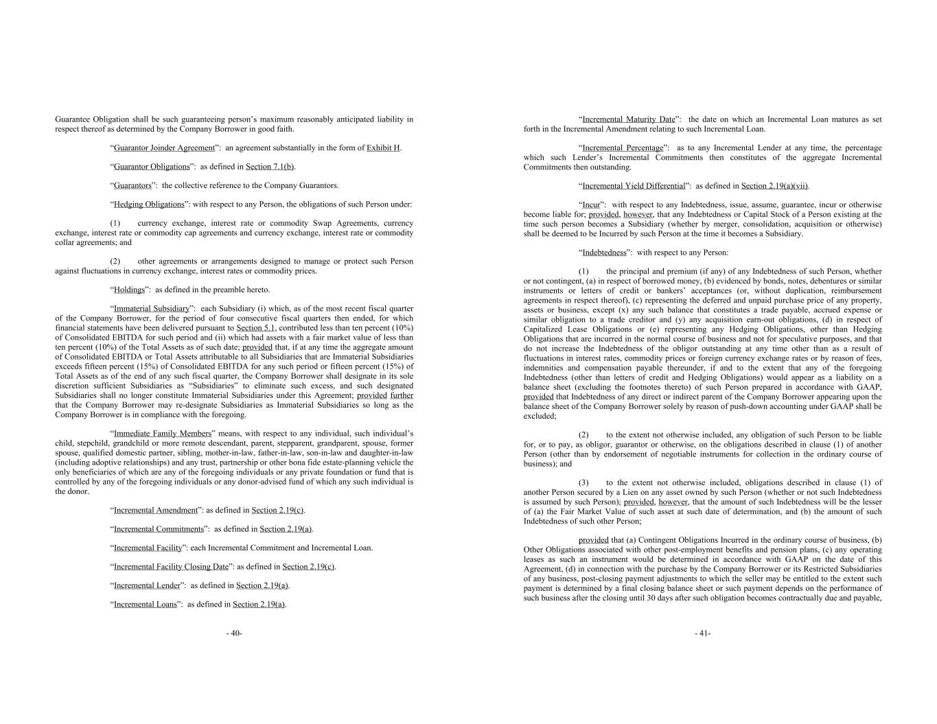 Guarantee Obligation shall be such guaranteeing person’s maximum reasonably anticipated liability in respect thereof as determined by the Company Borrower in good faith. “Guarantor Joinder Agreement”: an agreement substantially in the form of Exhibit H. “Guarantor Obligations”: as defined in Section 7.1(b). “Guarantors”: the collective reference to the Company Guarantors. “Hedging Obligations”: with respect to any Person, the obligations of such Person under: (1) currency exchange, interest rate or commodity Swap Agreements, currency exchange, interest rate or commodity cap agreements and currency exchange, interest rate or commodity collar agreements; and (2) other agreements or arrangements designed to manage or protect such Person against fluctuations in currency exchange, interest rates or commodity prices. “Holdings”: as defined in the preamble hereto. “Immaterial Subsidiary”: each Subsidiary (i) which, as of the most recent fiscal quarter of the Company Borrower, for the period of four consecutive fiscal quarters then ended, for which financial statements have been delivered pursuant to Section 5.1, contributed less than ten percent (10%) of Consolidated EBITDA for such period and (ii) which had assets with a fair market value of less than ten percent (10%) of the Total Assets as of such date; provided that, if at any time the aggregate amount of Consolidated EBITDA or Total Assets attributable to all Subsidiaries that are Immaterial Subsidiaries exceeds fifteen percent (15%) of Consolidated EBITDA for any such period or fifteen percent (15%) of Total Assets as of the end of any such fiscal quarter, the Company Borrower shall designate in its sole discretion sufficient Subsidiaries as “Subsidiaries” to eliminate such excess, and such designated Subsidiaries shall no longer constitute Immaterial Subsidiaries under this Agreement; provided further that the Company Borrower may re-designate Subsidiaries as Immaterial Subsidiaries so long as the Company Borrower is in compliance with the foregoing. “Immediate Family Members” means, with respect to any individual, such individual’s child, stepchild, grandchild or more remote descendant, parent, stepparent, grandparent, spouse, former spouse, qualified domestic partner, sibling, mother-in-law, father-in-law, son-in-law and daughter-in-law (including adoptive relationships) and any trust, partnership or other bona fide estate-planning vehicle the only beneficiaries of which are any of the foregoing individuals or any private foundation or fund that is controlled by any of the foregoing individuals or any donor-advised fund of which any such individual is the donor. “Incremental Amendment”: as defined in Section 2.19(c). “Incremental Commitments”: as defined in Section 2.19(a). “Incremental Facility”: each Incremental Commitment and Incremental Loan. “Incremental Facility Closing Date”: as defined in Section 2.19(c). “Incremental Lender”: as defined in Section 2.19(a). “Incremental Loans”: as defined in Section 2.19(a). - 40- “Incremental Maturity Date”: the date on which an Incremental Loan matures as set forth in the Incremental Amendment relating to such Incremental Loan. “Incremental Percentage”: as to any Incremental Lender at any time, the percentage which such Lender’s Incremental Commitments then constitutes of the aggregate Incremental Commitments then outstanding. “Incremental Yield Differential”: as defined in Section 2.19(a)(vii). “Incur”: with respect to any Indebtedness, issue, assume, guarantee, incur or otherwise become liable for; provided, however, that any Indebtedness or Capital Stock of a Person existing at the time such person becomes a Subsidiary (whether by merger, consolidation, acquisition or otherwise) shall be deemed to be Incurred by such Person at the time it becomes a Subsidiary. “Indebtedness”: with respect to any Person: (1) the principal and premium (if any) of any Indebtedness of such Person, whether or not contingent, (a) in respect of borrowed money, (b) evidenced by bonds, notes, debentures or similar instruments or letters of credit or bankers’ acceptances (or, without duplication, reimbursement agreements in respect thereof), (c) representing the deferred and unpaid purchase price of any property, assets or business, except (x) any such balance that constitutes a trade payable, accrued expense or similar obligation to a trade creditor and (y) any acquisition earn-out obligations, (d) in respect of Capitalized Lease Obligations or (e) representing any Hedging Obligations, other than Hedging Obligations that are incurred in the normal course of business and not for speculative purposes, and that do not increase the Indebtedness of the obligor outstanding at any time other than as a result of fluctuations in interest rates, commodity prices or foreign currency exchange rates or by reason of fees, indemnities and compensation payable thereunder, if and to the extent that any of the foregoing Indebtedness (other than letters of credit and Hedging Obligations) would appear as a liability on a balance sheet (excluding the footnotes thereto) of such Person prepared in accordance with GAAP, provided that Indebtedness of any direct or indirect parent of the Company Borrower appearing upon the balance sheet of the Company Borrower solely by reason of push-down accounting under GAAP shall be excluded; (2) to the extent not otherwise included, any obligation of such Person to be liable for, or to pay, as obligor, guarantor or otherwise, on the obligations described in clause (1) of another Person (other than by endorsement of negotiable instruments for collection in the ordinary course of business); and (3) to the extent not otherwise included, obligations described in clause (1) of another Person secured by a Lien on any asset owned by such Person (whether or not such Indebtedness is assumed by such Person); provided, however, th