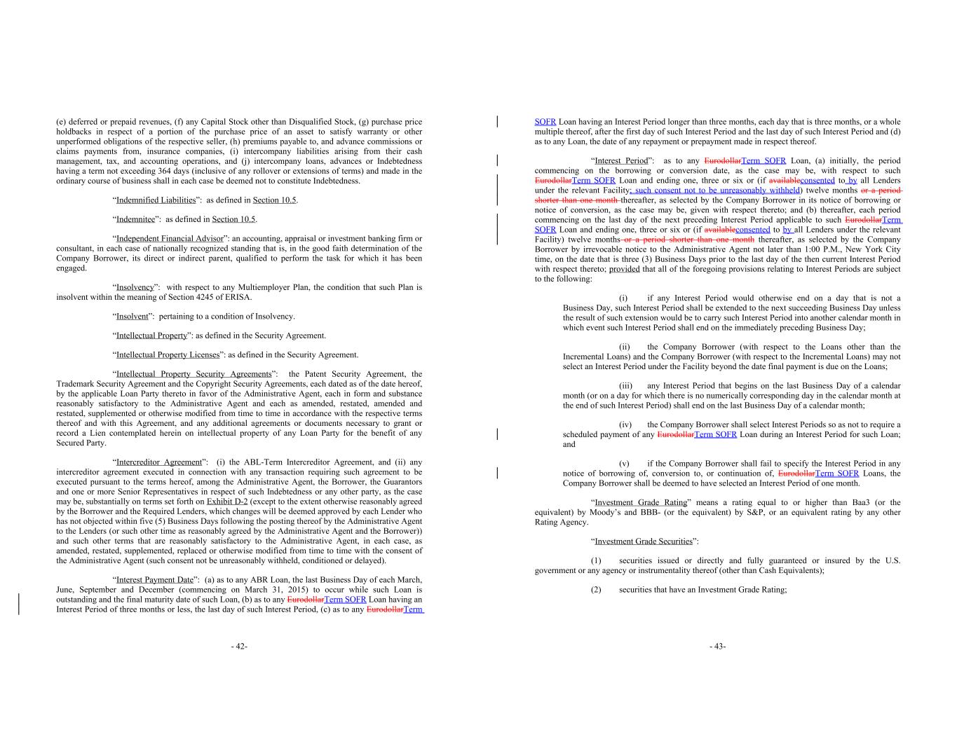 (e) deferred or prepaid revenues, (f) any Capital Stock other than Disqualified Stock, (g) purchase price holdbacks in respect of a portion of the purchase price of an asset to satisfy warranty or other unperformed obligations of the respective seller, (h) premiums payable to, and advance commissions or claims payments from, insurance companies, (i) intercompany liabilities arising from their cash management, tax, and accounting operations, and (j) intercompany loans, advances or Indebtedness having a term not exceeding 364 days (inclusive of any rollover or extensions of terms) and made in the ordinary course of business shall in each case be deemed not to constitute Indebtedness. “Indemnified Liabilities”: as defined in Section 10.5. “Indemnitee”: as defined in Section 10.5. “Independent Financial Advisor”: an accounting, appraisal or investment banking firm or consultant, in each case of nationally recognized standing that is, in the good faith determination of the Company Borrower, its direct or indirect parent, qualified to perform the task for which it has been engaged. “Insolvency”: with respect to any Multiemployer Plan, the condition that such Plan is insolvent within the meaning of Section 4245 of ERISA. “Insolvent”: pertaining to a condition of Insolvency. “Intellectual Property”: as defined in the Security Agreement. “Intellectual Property Licenses”: as defined in the Security Agreement. “Intellectual Property Security Agreements”: the Patent Security Agreement, the Trademark Security Agreement and the Copyright Security Agreements, each dated as of the date hereof, by the applicable Loan Party thereto in favor of the Administrative Agent, each in form and substance reasonably satisfactory to the Administrative Agent and each as amended, restated, amended and restated, supplemented or otherwise modified from time to time in accordance with the respective terms thereof and with this Agreement, and any additional agreements or documents necessary to grant or record a Lien contemplated herein on intellectual property of any Loan Party for the benefit of any Secured Party. “Intercreditor Agreement”: (i) the ABL-Term Intercreditor Agreement, and (ii) any intercreditor agreement executed in connection with any transaction requiring such agreement to be executed pursuant to the terms hereof, among the Administrative Agent, the Borrower, the Guarantors and one or more Senior Representatives in respect of such Indebtedness or any other party, as the case may be, substantially on terms set forth on Exhibit D-2 (except to the extent otherwise reasonably agreed by the Borrower and the Required Lenders, which changes will be deemed approved by each Lender who has not objected within five (5) Business Days following the posting thereof by the Administrative Agent to the Lenders (or such other time as reasonably agreed by the Administrative Agent and the Borrower)) and such other terms that are reasonably satisfactory to the Administrative Agent, in each case, as amended, restated, supplemented, replaced or otherwise modified from time to time with the consent of the Administrative Agent (such consent not be unreasonably withheld, conditioned or delayed). “Interest Payment Date”: (a) as to any ABR Loan, the last Business Day of each March, June, September and December (commencing on March 31, 2015) to occur while such Loan is outstanding and the final maturity date of such Loan, (b) as to any EurodollarTerm SOFR Loan having an Interest Period of three months or less, the last day of such Interest Period, (c) as to any EurodollarTerm - 42- SOFR Loan having an Interest Period longer than three months, each day that is three months, or a whole multiple thereof, after the first day of such Interest Period and the last day of such Interest Period and (d) as to any Loan, the date of any repayment or prepayment made in respect thereof. “Interest Period”: as to any EurodollarTerm SOFR Loan, (a) initially, the period commencing on the borrowing or conversion date, as the case may be, with respect to such EurodollarTerm SOFR Loan and ending one, three or six or (if availableconsented to by all Lenders under the relevant Facility; such consent not to be unreasonably withheld) twelve months or a period shorter than one month thereafter, as selected by the Company Borrower in its notice of borrowing or notice of conversion, as the case may be, given with respect thereto; and (b) thereafter, each period commencing on the last day of the next preceding Interest Period applicable to such EurodollarTerm SOFR Loan and ending one, three or six or (if availableconsented to by all Lenders under the relevant Facility) twelve months or a period shorter than one month thereafter, as selected by the Company Borrower by irrevocable notice to the Administrative Agent not later than 1:00 P.M., New York City time, on the date that is three (3) Business Days prior to the last day of the then current Interest Period with respect thereto; provided that all of the foregoing provisions relating to Interest Periods are subject to the following: (i) if any Interest Period would otherwise end on a day that is not a Business Day, such Interest Period shall be extended to the next succeeding Business Day unless the result of such extension would be to carry such Interest Period into another calendar month in which event such Interest Period shall end on the immediately preceding Business Day; (ii) the Company Borrower (with respect to the Loans other than the Incremental Loans) and the Company Borrower (with respect to the Incremental Loans) may not select an Interest Period under the Facility beyond the date final payment is due on the Loans; (iii) any Interest Period that begins on the last Business Day of a calendar month (or on a day for which there is no numerically corresponding day in the calendar month at the end of such Interest Period) shall end on the last Business Day of a 