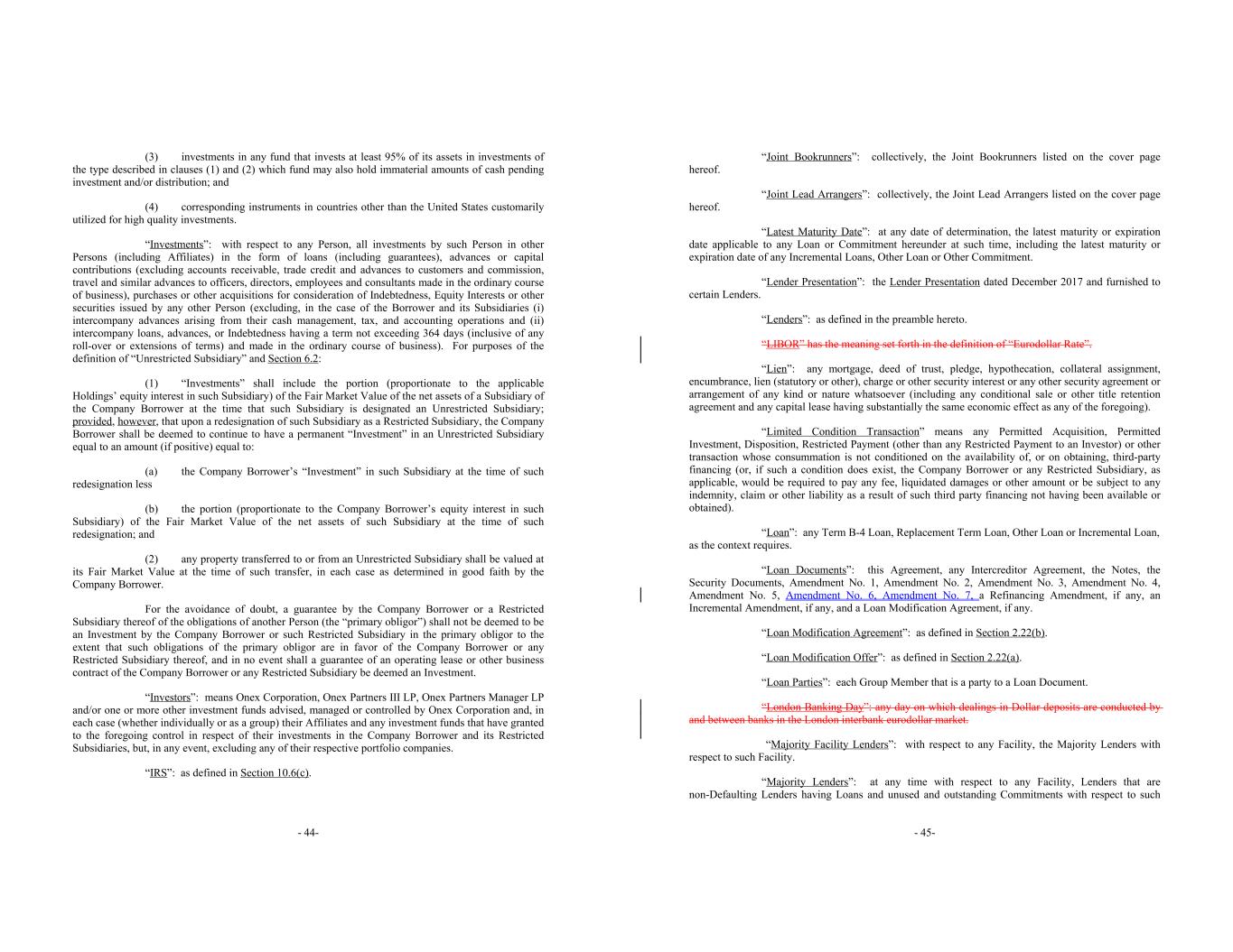 (3) investments in any fund that invests at least 95% of its assets in investments of the type described in clauses (1) and (2) which fund may also hold immaterial amounts of cash pending investment and/or distribution; and (4) corresponding instruments in countries other than the United States customarily utilized for high quality investments. “Investments”: with respect to any Person, all investments by such Person in other Persons (including Affiliates) in the form of loans (including guarantees), advances or capital contributions (excluding accounts receivable, trade credit and advances to customers and commission, travel and similar advances to officers, directors, employees and consultants made in the ordinary course of business), purchases or other acquisitions for consideration of Indebtedness, Equity Interests or other securities issued by any other Person (excluding, in the case of the Borrower and its Subsidiaries (i) intercompany advances arising from their cash management, tax, and accounting operations and (ii) intercompany loans, advances, or Indebtedness having a term not exceeding 364 days (inclusive of any roll-over or extensions of terms) and made in the ordinary course of business). For purposes of the definition of “Unrestricted Subsidiary” and Section 6.2: (1) “Investments” shall include the portion (proportionate to the applicable Holdings’ equity interest in such Subsidiary) of the Fair Market Value of the net assets of a Subsidiary of the Company Borrower at the time that such Subsidiary is designated an Unrestricted Subsidiary; provided, however, that upon a redesignation of such Subsidiary as a Restricted Subsidiary, the Company Borrower shall be deemed to continue to have a permanent “Investment” in an Unrestricted Subsidiary equal to an amount (if positive) equal to: (a) the Company Borrower’s “Investment” in such Subsidiary at the time of such redesignation less (b) the portion (proportionate to the Company Borrower’s equity interest in such Subsidiary) of the Fair Market Value of the net assets of such Subsidiary at the time of such redesignation; and (2) any property transferred to or from an Unrestricted Subsidiary shall be valued at its Fair Market Value at the time of such transfer, in each case as determined in good faith by the Company Borrower. For the avoidance of doubt, a guarantee by the Company Borrower or a Restricted Subsidiary thereof of the obligations of another Person (the “primary obligor”) shall not be deemed to be an Investment by the Company Borrower or such Restricted Subsidiary in the primary obligor to the extent that such obligations of the primary obligor are in favor of the Company Borrower or any Restricted Subsidiary thereof, and in no event shall a guarantee of an operating lease or other business contract of the Company Borrower or any Restricted Subsidiary be deemed an Investment. “Investors”: means Onex Corporation, Onex Partners III LP, Onex Partners Manager LP and/or one or more other investment funds advised, managed or controlled by Onex Corporation and, in each case (whether individually or as a group) their Affiliates and any investment funds that have granted to the foregoing control in respect of their investments in the Company Borrower and its Restricted Subsidiaries, but, in any event, excluding any of their respective portfolio companies. “IRS”: as defined in Section 10.6(c). - 44- “Joint Bookrunners”: collectively, the Joint Bookrunners listed on the cover page hereof. “Joint Lead Arrangers”: collectively, the Joint Lead Arrangers listed on the cover page hereof. “Latest Maturity Date”: at any date of determination, the latest maturity or expiration date applicable to any Loan or Commitment hereunder at such time, including the latest maturity or expiration date of any Incremental Loans, Other Loan or Other Commitment. “Lender Presentation”: the Lender Presentation dated December 2017 and furnished to certain Lenders. “Lenders”: as defined in the preamble hereto. “LIBOR” has the meaning set forth in the definition of “Eurodollar Rate”. “Lien”: any mortgage, deed of trust, pledge, hypothecation, collateral assignment, encumbrance, lien (statutory or other), charge or other security interest or any other security agreement or arrangement of any kind or nature whatsoever (including any conditional sale or other title retention agreement and any capital lease having substantially the same economic effect as any of the foregoing). “Limited Condition Transaction” means any Permitted Acquisition, Permitted Investment, Disposition, Restricted Payment (other than any Restricted Payment to an Investor) or other transaction whose consummation is not conditioned on the availability of, or on obtaining, third-party financing (or, if such a condition does exist, the Company Borrower or any Restricted Subsidiary, as applicable, would be required to pay any fee, liquidated damages or other amount or be subject to any indemnity, claim or other liability as a result of such third party financing not having been available or obtained). “Loan”: any Term B-4 Loan, Replacement Term Loan, Other Loan or Incremental Loan, as the context requires. “Loan Documents”: this Agreement, any Intercreditor Agreement, the Notes, the Security Documents, Amendment No. 1, Amendment No. 2, Amendment No. 3, Amendment No. 4, Amendment No. 5, Amendment No. 6, Amendment No. 7, a Refinancing Amendment, if any, an Incremental Amendment, if any, and a Loan Modification Agreement, if any. “Loan Modification Agreement”: as defined in Section 2.22(b). “Loan Modification Offer”: as defined in Section 2.22(a). “Loan Parties”: each Group Member that is a party to a Loan Document. “London Banking Day”: any day on which dealings in Dollar deposits are conducted by and between banks in the London interbank eurodollar market. “Majority Facility Lenders”: with respect