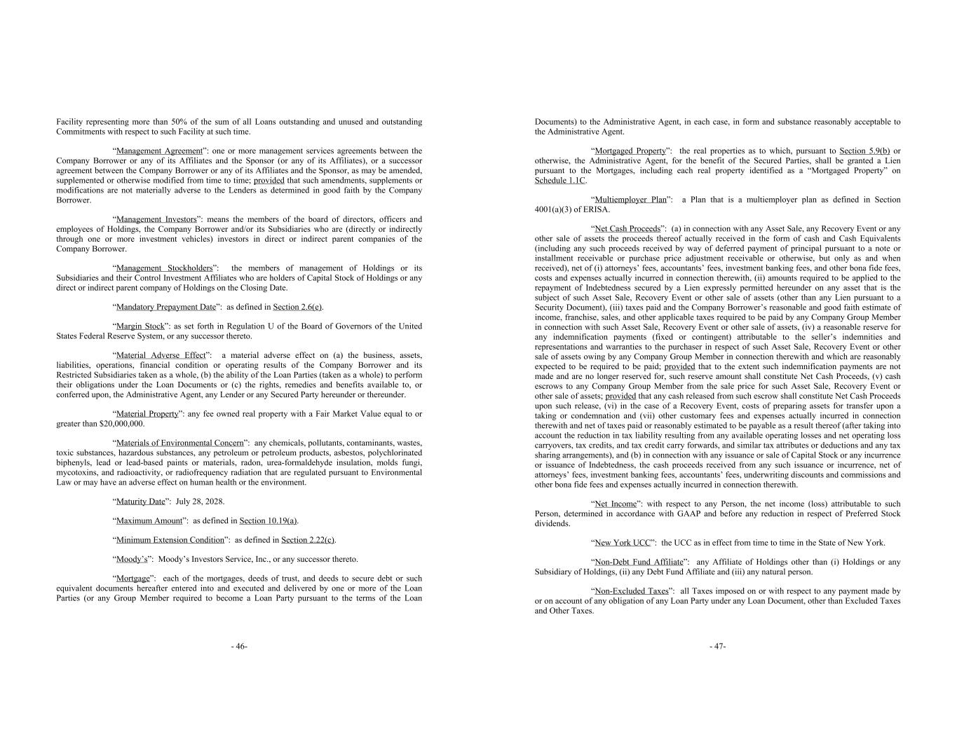 Facility representing more than 50% of the sum of all Loans outstanding and unused and outstanding Commitments with respect to such Facility at such time. “Management Agreement”: one or more management services agreements between the Company Borrower or any of its Affiliates and the Sponsor (or any of its Affiliates), or a successor agreement between the Company Borrower or any of its Affiliates and the Sponsor, as may be amended, supplemented or otherwise modified from time to time; provided that such amendments, supplements or modifications are not materially adverse to the Lenders as determined in good faith by the Company Borrower. “Management Investors”: means the members of the board of directors, officers and employees of Holdings, the Company Borrower and/or its Subsidiaries who are (directly or indirectly through one or more investment vehicles) investors in direct or indirect parent companies of the Company Borrower. “Management Stockholders”: the members of management of Holdings or its Subsidiaries and their Control Investment Affiliates who are holders of Capital Stock of Holdings or any direct or indirect parent company of Holdings on the Closing Date. “Mandatory Prepayment Date”: as defined in Section 2.6(e). “Margin Stock”: as set forth in Regulation U of the Board of Governors of the United States Federal Reserve System, or any successor thereto. “Material Adverse Effect”: a material adverse effect on (a) the business, assets, liabilities, operations, financial condition or operating results of the Company Borrower and its Restricted Subsidiaries taken as a whole, (b) the ability of the Loan Parties (taken as a whole) to perform their obligations under the Loan Documents or (c) the rights, remedies and benefits available to, or conferred upon, the Administrative Agent, any Lender or any Secured Party hereunder or thereunder. “Material Property”: any fee owned real property with a Fair Market Value equal to or greater than $20,000,000. “Materials of Environmental Concern”: any chemicals, pollutants, contaminants, wastes, toxic substances, hazardous substances, any petroleum or petroleum products, asbestos, polychlorinated biphenyls, lead or lead-based paints or materials, radon, urea-formaldehyde insulation, molds fungi, mycotoxins, and radioactivity, or radiofrequency radiation that are regulated pursuant to Environmental Law or may have an adverse effect on human health or the environment. “Maturity Date”: July 28, 2028. “Maximum Amount”: as defined in Section 10.19(a). “Minimum Extension Condition”: as defined in Section 2.22(c). “Moody’s”: Moody’s Investors Service, Inc., or any successor thereto. “Mortgage”: each of the mortgages, deeds of trust, and deeds to secure debt or such equivalent documents hereafter entered into and executed and delivered by one or more of the Loan Parties (or any Group Member required to become a Loan Party pursuant to the terms of the Loan - 46- Documents) to the Administrative Agent, in each case, in form and substance reasonably acceptable to the Administrative Agent. “Mortgaged Property”: the real properties as to which, pursuant to Section 5.9(b) or otherwise, the Administrative Agent, for the benefit of the Secured Parties, shall be granted a Lien pursuant to the Mortgages, including each real property identified as a “Mortgaged Property” on Schedule 1.1C. “Multiemployer Plan”: a Plan that is a multiemployer plan as defined in Section 4001(a)(3) of ERISA. “Net Cash Proceeds”: (a) in connection with any Asset Sale, any Recovery Event or any other sale of assets the proceeds thereof actually received in the form of cash and Cash Equivalents (including any such proceeds received by way of deferred payment of principal pursuant to a note or installment receivable or purchase price adjustment receivable or otherwise, but only as and when received), net of (i) attorneys’ fees, accountants’ fees, investment banking fees, and other bona fide fees, costs and expenses actually incurred in connection therewith, (ii) amounts required to be applied to the repayment of Indebtedness secured by a Lien expressly permitted hereunder on any asset that is the subject of such Asset Sale, Recovery Event or other sale of assets (other than any Lien pursuant to a Security Document), (iii) taxes paid and the Company Borrower’s reasonable and good faith estimate of income, franchise, sales, and other applicable taxes required to be paid by any Company Group Member in connection with such Asset Sale, Recovery Event or other sale of assets, (iv) a reasonable reserve for any indemnification payments (fixed or contingent) attributable to the seller’s indemnities and representations and warranties to the purchaser in respect of such Asset Sale, Recovery Event or other sale of assets owing by any Company Group Member in connection therewith and which are reasonably expected to be required to be paid; provided that to the extent such indemnification payments are not made and are no longer reserved for, such reserve amount shall constitute Net Cash Proceeds, (v) cash escrows to any Company Group Member from the sale price for such Asset Sale, Recovery Event or other sale of assets; provided that any cash released from such escrow shall constitute Net Cash Proceeds upon such release, (vi) in the case of a Recovery Event, costs of preparing assets for transfer upon a taking or condemnation and (vii) other customary fees and expenses actually incurred in connection therewith and net of taxes paid or reasonably estimated to be payable as a result thereof (after taking into account the reduction in tax liability resulting from any available operating losses and net operating loss carryovers, tax credits, and tax credit carry forwards, and similar tax attributes or deductions and any tax sharing arrangements), and (b) in connection with any issuance or sale of Capital Stock or any incurrence or