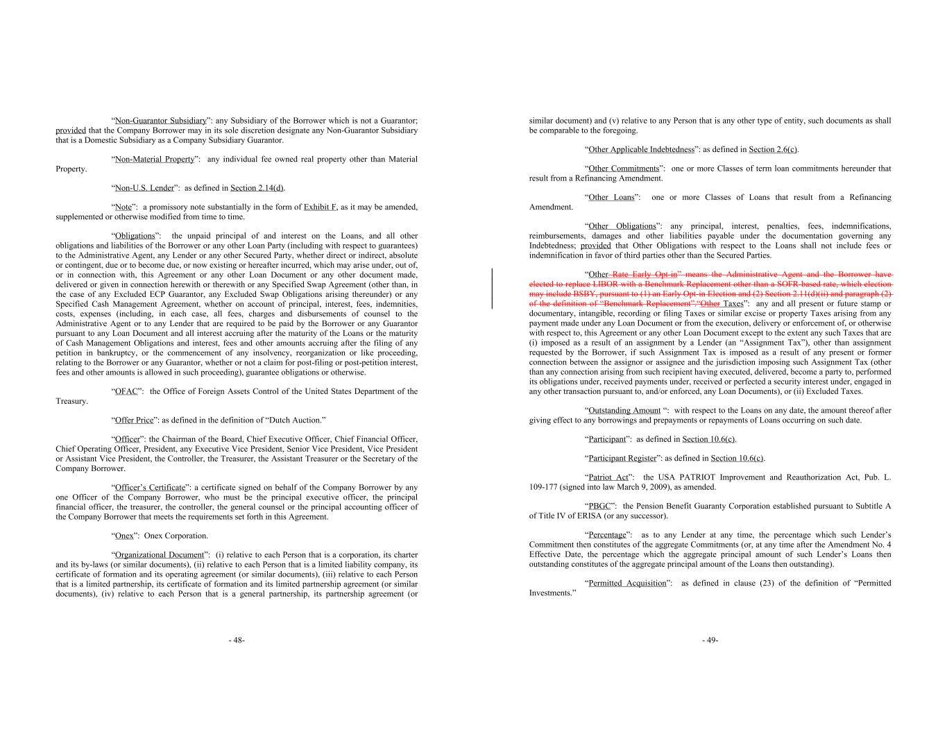 “Non-Guarantor Subsidiary”: any Subsidiary of the Borrower which is not a Guarantor; provided that the Company Borrower may in its sole discretion designate any Non-Guarantor Subsidiary that is a Domestic Subsidiary as a Company Subsidiary Guarantor. “Non-Material Property”: any individual fee owned real property other than Material Property. “Non-U.S. Lender”: as defined in Section 2.14(d). “Note”: a promissory note substantially in the form of Exhibit F, as it may be amended, supplemented or otherwise modified from time to time. “Obligations”: the unpaid principal of and interest on the Loans, and all other obligations and liabilities of the Borrower or any other Loan Party (including with respect to guarantees) to the Administrative Agent, any Lender or any other Secured Party, whether direct or indirect, absolute or contingent, due or to become due, or now existing or hereafter incurred, which may arise under, out of, or in connection with, this Agreement or any other Loan Document or any other document made, delivered or given in connection herewith or therewith or any Specified Swap Agreement (other than, in the case of any Excluded ECP Guarantor, any Excluded Swap Obligations arising thereunder) or any Specified Cash Management Agreement, whether on account of principal, interest, fees, indemnities, costs, expenses (including, in each case, all fees, charges and disbursements of counsel to the Administrative Agent or to any Lender that are required to be paid by the Borrower or any Guarantor pursuant to any Loan Document and all interest accruing after the maturity of the Loans or the maturity of Cash Management Obligations and interest, fees and other amounts accruing after the filing of any petition in bankruptcy, or the commencement of any insolvency, reorganization or like proceeding, relating to the Borrower or any Guarantor, whether or not a claim for post-filing or post-petition interest, fees and other amounts is allowed in such proceeding), guarantee obligations or otherwise. “OFAC”: the Office of Foreign Assets Control of the United States Department of the Treasury. “Offer Price”: as defined in the definition of “Dutch Auction.” “Officer”: the Chairman of the Board, Chief Executive Officer, Chief Financial Officer, Chief Operating Officer, President, any Executive Vice President, Senior Vice President, Vice President or Assistant Vice President, the Controller, the Treasurer, the Assistant Treasurer or the Secretary of the Company Borrower. “Officer’s Certificate”: a certificate signed on behalf of the Company Borrower by any one Officer of the Company Borrower, who must be the principal executive officer, the principal financial officer, the treasurer, the controller, the general counsel or the principal accounting officer of the Company Borrower that meets the requirements set forth in this Agreement. “Onex”: Onex Corporation. “Organizational Document”: (i) relative to each Person that is a corporation, its charter and its by-laws (or similar documents), (ii) relative to each Person that is a limited liability company, its certificate of formation and its operating agreement (or similar documents), (iii) relative to each Person that is a limited partnership, its certificate of formation and its limited partnership agreement (or similar documents), (iv) relative to each Person that is a general partnership, its partnership agreement (or - 48- similar document) and (v) relative to any Person that is any other type of entity, such documents as shall be comparable to the foregoing. “Other Applicable Indebtedness”: as defined in Section 2.6(c). “Other Commitments”: one or more Classes of term loan commitments hereunder that result from a Refinancing Amendment. “Other Loans”: one or more Classes of Loans that result from a Refinancing Amendment. “Other Obligations”: any principal, interest, penalties, fees, indemnifications, reimbursements, damages and other liabilities payable under the documentation governing any Indebtedness; provided that Other Obligations with respect to the Loans shall not include fees or indemnification in favor of third parties other than the Secured Parties. “Other Rate Early Opt-in” means the Administrative Agent and the Borrower have elected to replace LIBOR with a Benchmark Replacement other than a SOFR-based rate, which election may include BSBY, pursuant to (1) an Early Opt-in Election and (2) Section 2.11(d)(ii) and paragraph (2) of the definition of “Benchmark Replacement”.“Other Taxes”: any and all present or future stamp or documentary, intangible, recording or filing Taxes or similar excise or property Taxes arising from any payment made under any Loan Document or from the execution, delivery or enforcement of, or otherwise with respect to, this Agreement or any other Loan Document except to the extent any such Taxes that are (i) imposed as a result of an assignment by a Lender (an “Assignment Tax”), other than assignment requested by the Borrower, if such Assignment Tax is imposed as a result of any present or former connection between the assignor or assignee and the jurisdiction imposing such Assignment Tax (other than any connection arising from such recipient having executed, delivered, become a party to, performed its obligations under, received payments under, received or perfected a security interest under, engaged in any other transaction pursuant to, and/or enforced, any Loan Documents), or (ii) Excluded Taxes. “Outstanding Amount “: with respect to the Loans on any date, the amount thereof after giving effect to any borrowings and prepayments or repayments of Loans occurring on such date. “Participant”: as defined in Section 10.6(c). “Participant Register”: as defined in Section 10.6(c). “Patriot Act”: the USA PATRIOT Improvement and Reauthorization Act, Pub. L. 109-177 (signed into law March 9, 2009), as amended. “PBGC”: the P