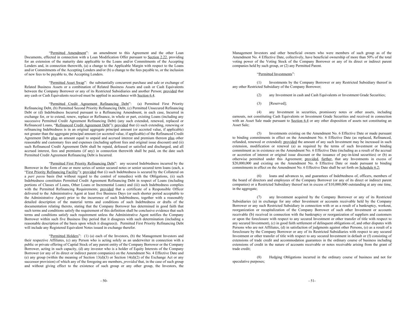 “Permitted Amendment”: an amendment to this Agreement and the other Loan Documents, effected in connection with a Loan Modification Offer pursuant to Section 2.22, providing for an extension of the maturity date applicable to the Loans and/or Commitments of the Accepting Lenders and, in connection therewith, (a) a change to the Applicable Margin with respect to the Loans and/or Commitments of the Accepting Lenders and/or (b) a change to the fees payable to, or the inclusion of new fees to be payable to, the Accepting Lenders. “Permitted Asset Swap”: the substantially concurrent purchase and sale or exchange of Related Business Assets or a combination of Related Business Assets and cash or Cash Equivalents between the Company Borrower or any of its Restricted Subsidiaries and another Person; provided that any cash or Cash Equivalents received must be applied in accordance with Section 6.4. “Permitted Credit Agreement Refinancing Debt”: (a) Permitted First Priority Refinancing Debt, (b) Permitted Second Priority Refinancing Debt, (c) Permitted Unsecured Refinancing Debt or (d) Indebtedness Incurred pursuant to a Refinancing Amendment, in each case, Incurred in exchange for, or to extend, renew, replace or Refinance, in whole or part, existing Loans (including any successive Permitted Credit Agreement Refinancing Debt) (any such extended, renewed, replaced or Refinanced Loans, “Refinanced Credit Agreement Debt”); provided that (i) such extending, renewing or refinancing Indebtedness is in an original aggregate principal amount (or accreted value, if applicable) not greater than the aggregate principal amount (or accreted value, if applicable) of the Refinanced Credit Agreement Debt plus an amount equal to unpaid and accrued interest and premium thereon plus other reasonable and customary fees and expenses (including upfront fees and original issue discount) and (ii) such Refinanced Credit Agreement Debt shall be repaid, defeased or satisfied and discharged, and all accrued interest, fees and premiums (if any) in connection therewith shall be paid, on the date such Permitted Credit Agreement Refinancing Debt is Incurred. “Permitted First Priority Refinancing Debt”: any secured Indebtedness incurred by the Borrower in the form of one or more series of senior secured notes or senior secured term loans (each, a “First Priority Refinancing Facility”); provided that (i) such Indebtedness is secured by the Collateral on a pari passu basis (but without regard to the control of remedies) with the Obligations, (ii) such Indebtedness constitutes Permitted Credit Agreement Refinancing Debt in respect of Loans (including portions of Classes of Loans, Other Loans or Incremental Loans) and (iii) such Indebtedness complies with the Permitted Refinancing Requirements; provided that a certificate of a Responsible Officer delivered to the Administrative Agent at least five Business Days (or such shorter period acceptable to the Administrative Agent) prior to the incurrence of such Indebtedness, together with a reasonably detailed description of the material terms and conditions of such Indebtedness or drafts of the documentation relating thereto, stating that the Company Borrower has determined in good faith that such terms and conditions satisfy the requirement of this definition shall be conclusive evidence that such terms and conditions satisfy such requirement unless the Administrative Agent notifies the Company Borrower within such five Business Day period that it disagrees with such determination (including a reasonable description of the basis upon which it disagrees)). Permitted First Priority Refinancing Debt will include any Registered Equivalent Notes issued in exchange therefor. “Permitted Holders”: (1) (a) each of the Investors, (b) the Management Investors and their respective Affiliates, (c) any Person who is acting solely as an underwriter in connection with a public or private offering of Capital Stock of any parent entity of the Company Borrower or the Company Borrower, acting in such capacity, (d) any investor who is a holder of Equity Interests of the Company Borrower (or any of its direct or indirect parent companies) on the Amendment No. 4 Effective Date and (e) any group (within the meaning of Section 13(d)(3) or Section 14(d)(2) of the Exchange Act or any successor provision) of which any of the foregoing are members, provided that, in the case of such group and without giving effect to the existence of such group or any other group, the Investors, the - 50- Management Investors and other beneficial owners who were members of such group as of the Amendment No. 4 Effective Date, collectively, have beneficial ownership of more than 50% of the total voting power of the Voting Stock of the Company Borrower or any of its direct or indirect parent companies held by such group, or (2) any Permitted Parent. “Permitted Investments”: (1) Investments by the Company Borrower or any Restricted Subsidiary thereof in any other Restricted Subsidiary of the Company Borrower; (2) any Investment in cash and Cash Equivalents or Investment Grade Securities; (3) [Reserved]; (4) any Investment in securities, promissory notes or other assets, including earnouts, not constituting Cash Equivalents or Investment Grade Securities and received in connection with an Asset Sale made pursuant to Section 6.4 or any other disposition of assets not constituting an Asset Sale; (5) Investments existing on the Amendment No. 6 Effective Date or made pursuant to binding commitments in effect on the Amendment No. 6 Effective Date (as replaced, Refinanced, refunded, renewed or extended); provided the amount of any such Investment may be increased in such extension, modification or renewal (a) as required by the terms of such Investment or binding commitment as in existence on the Amendment No. 6 Effective Date (including as a result of the accrual or accretion of interest or original issue disco
