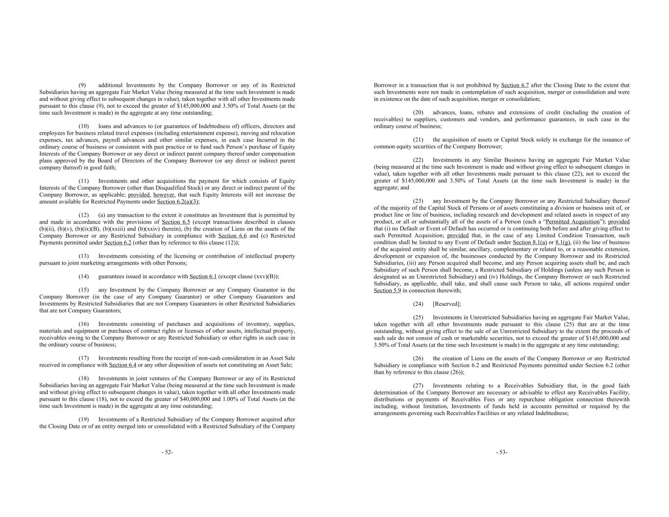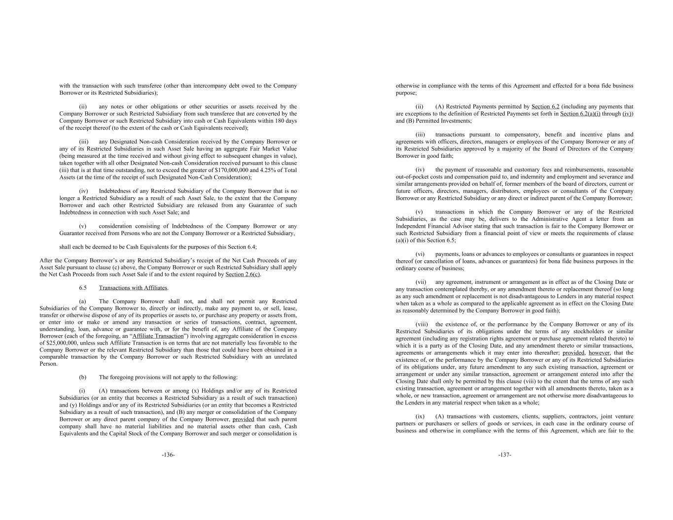 with the transaction with such transferee (other than intercompany debt owed to the Company Borrower or its Restricted Subsidiaries); any notes or other obligations or other securities or assets received by the(ii) Company Borrower or such Restricted Subsidiary from such transferee that are converted by the Company Borrower or such Restricted Subsidiary into cash or Cash Equivalents within 180 days of the receipt thereof (to the extent of the cash or Cash Equivalents received); any Designated Non-cash Consideration received by the Company Borrower or(iii) any of its Restricted Subsidiaries in such Asset Sale having an aggregate Fair Market Value (being measured at the time received and without giving effect to subsequent changes in value), taken together with all other Designated Non-cash Consideration received pursuant to this clause (iii) that is at that time outstanding, not to exceed the greater of $170,000,000 and 4.25% of Total Assets (at the time of the receipt of such Designated Non-Cash Consideration); Indebtedness of any Restricted Subsidiary of the Company Borrower that is no(iv) longer a Restricted Subsidiary as a result of such Asset Sale, to the extent that the Company Borrower and each other Restricted Subsidiary are released from any Guarantee of such Indebtedness in connection with such Asset Sale; and consideration consisting of Indebtedness of the Company Borrower or any(v) Guarantor received from Persons who are not the Company Borrower or a Restricted Subsidiary, shall each be deemed to be Cash Equivalents for the purposes of this Section 6.4; After the Company Borrower’s or any Restricted Subsidiary’s receipt of the Net Cash Proceeds of any Asset Sale pursuant to clause (c) above, the Company Borrower or such Restricted Subsidiary shall apply the Net Cash Proceeds from such Asset Sale if and to the extent required by Section 2.6(c). Transactions with Affiliates.6.5 The Company Borrower shall not, and shall not permit any Restricted(a) Subsidiaries of the Company Borrower to, directly or indirectly, make any payment to, or sell, lease, transfer or otherwise dispose of any of its properties or assets to, or purchase any property or assets from, or enter into or make or amend any transaction or series of transactions, contract, agreement, understanding, loan, advance or guarantee with, or for the benefit of, any Affiliate of the Company Borrower (each of the foregoing, an “Affiliate Transaction”) involving aggregate consideration in excess of $25,000,000, unless such Affiliate Transaction is on terms that are not materially less favorable to the Company Borrower or the relevant Restricted Subsidiary than those that could have been obtained in a comparable transaction by the Company Borrower or such Restricted Subsidiary with an unrelated Person. The foregoing provisions will not apply to the following:(b) (A) transactions between or among (x) Holdings and/or any of its Restricted(i) Subsidiaries (or an entity that becomes a Restricted Subsidiary as a result of such transaction) and (y) Holdings and/or any of its Restricted Subsidiaries (or an entity that becomes a Restricted Subsidiary as a result of such transaction), and (B) any merger or consolidation of the Company Borrower or any direct parent company of the Company Borrower, provided that such parent company shall have no material liabilities and no material assets other than cash, Cash Equivalents and the Capital Stock of the Company Borrower and such merger or consolidation is -136- otherwise in compliance with the terms of this Agreement and effected for a bona fide business purpose; (A) Restricted Payments permitted by Section 6.2 (including any payments that(ii) are exceptions to the definition of Restricted Payments set forth in Section 6.2(a)(i) through (iv)) and (B) Permitted Investments; transactions pursuant to compensatory, benefit and incentive plans and(iii) agreements with officers, directors, managers or employees of the Company Borrower or any of its Restricted Subsidiaries approved by a majority of the Board of Directors of the Company Borrower in good faith; the payment of reasonable and customary fees and reimbursements, reasonable(iv) out-of-pocket costs and compensation paid to, and indemnity and employment and severance and similar arrangements provided on behalf of, former members of the board of directors, current or future officers, directors, managers, distributors, employees or consultants of the Company Borrower or any Restricted Subsidiary or any direct or indirect parent of the Company Borrower; transactions in which the Company Borrower or any of the Restricted(v) Subsidiaries, as the case may be, delivers to the Administrative Agent a letter from an Independent Financial Advisor stating that such transaction is fair to the Company Borrower or such Restricted Subsidiary from a financial point of view or meets the requirements of clause (a)(i) of this Section 6.5; payments, loans or advances to employees or consultants or guarantees in respect(vi) thereof (or cancellation of loans, advances or guarantees) for bona fide business purposes in the ordinary course of business; any agreement, instrument or arrangement as in effect as of the Closing Date or(vii) any transaction contemplated thereby, or any amendment thereto or replacement thereof (so long as any such amendment or replacement is not disadvantageous to Lenders in any material respect when taken as a whole as compared to the applicable agreement as in effect on the Closing Date as reasonably determined by the Company Borrower in good faith); the existence of, or the performance by the Company Borrower or any of its(viii) Restricted Subsidiaries of its obligations under the terms of any stockholders or similar agreement (including any registration rights agreement or purchase agreement related thereto) to which it is a party as of the Closing Date, and any amendment thereto or similar transactions, agreements or arrange