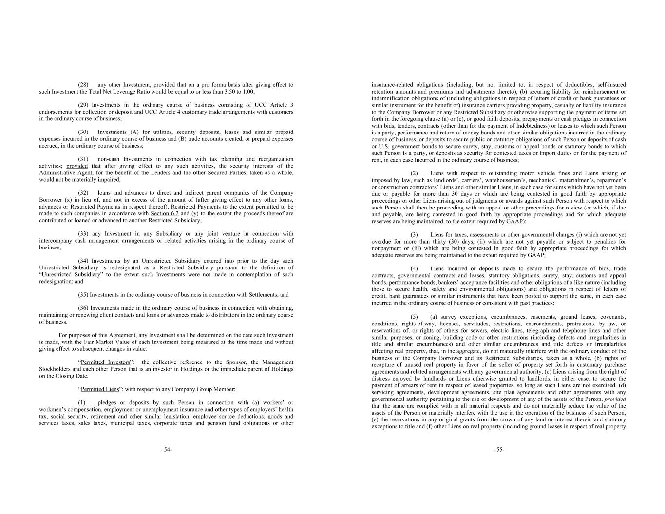 (28) any other Investment; provided that on a pro forma basis after giving effect to such Investment the Total Net Leverage Ratio would be equal to or less than 3.50 to 1.00; (29) Investments in the ordinary course of business consisting of UCC Article 3 endorsements for collection or deposit and UCC Article 4 customary trade arrangements with customers in the ordinary course of business; (30) Investments (A) for utilities, security deposits, leases and similar prepaid expenses incurred in the ordinary course of business and (B) trade accounts created, or prepaid expenses accrued, in the ordinary course of business; (31) non-cash Investments in connection with tax planning and reorganization activities; provided that after giving effect to any such activities, the security interests of the Administrative Agent, for the benefit of the Lenders and the other Secured Parties, taken as a whole, would not be materially impaired; (32) loans and advances to direct and indirect parent companies of the Company Borrower (x) in lieu of, and not in excess of the amount of (after giving effect to any other loans, advances or Restricted Payments in respect thereof), Restricted Payments to the extent permitted to be made to such companies in accordance with Section 6.2 and (y) to the extent the proceeds thereof are contributed or loaned or advanced to another Restricted Subsidiary; (33) any Investment in any Subsidiary or any joint venture in connection with intercompany cash management arrangements or related activities arising in the ordinary course of business; (34) Investments by an Unrestricted Subsidiary entered into prior to the day such Unrestricted Subsidiary is redesignated as a Restricted Subsidiary pursuant to the definition of “Unrestricted Subsidiary” to the extent such Investments were not made in contemplation of such redesignation; and (35) Investments in the ordinary course of business in connection with Settlements; and (36) Investments made in the ordinary course of business in connection with obtaining, maintaining or renewing client contacts and loans or advances made to distributors in the ordinary course of business. For purposes of this Agreement, any Investment shall be determined on the date such Investment is made, with the Fair Market Value of each Investment being measured at the time made and without giving effect to subsequent changes in value. “Permitted Investors”: the collective reference to the Sponsor, the Management Stockholders and each other Person that is an investor in Holdings or the immediate parent of Holdings on the Closing Date. “Permitted Liens”: with respect to any Company Group Member: (1) pledges or deposits by such Person in connection with (a) workers’ or workmen’s compensation, employment or unemployment insurance and other types of employers’ health tax, social security, retirement and other similar legislation, employee source deductions, goods and services taxes, sales taxes, municipal taxes, corporate taxes and pension fund obligations or other - 54- insurance-related obligations (including, but not limited to, in respect of deductibles, self-insured retention amounts and premiums and adjustments thereto), (b) securing liability for reimbursement or indemnification obligations of (including obligations in respect of letters of credit or bank guarantees or similar instrument for the benefit of) insurance carriers providing property, casualty or liability insurance to the Company Borrower or any Restricted Subsidiary or otherwise supporting the payment of items set forth in the foregoing clause (a) or (c), or good faith deposits, prepayments or cash pledges in connection with bids, tenders, contracts (other than for the payment of Indebtedness) or leases to which such Person is a party, performance and return of money bonds and other similar obligations incurred in the ordinary course of business, or deposits to secure public or statutory obligations of such Person or deposits of cash or U.S. government bonds to secure surety, stay, customs or appeal bonds or statutory bonds to which such Person is a party, or deposits as security for contested taxes or import duties or for the payment of rent, in each case Incurred in the ordinary course of business; (2) Liens with respect to outstanding motor vehicle fines and Liens arising or imposed by law, such as landlords’, carriers’, warehousemen’s, mechanics’, materialmen’s, repairmen’s or construction contractors’ Liens and other similar Liens, in each case for sums which have not yet been due or payable for more than 30 days or which are being contested in good faith by appropriate proceedings or other Liens arising out of judgments or awards against such Person with respect to which such Person shall then be proceeding with an appeal or other proceedings for review (or which, if due and payable, are being contested in good faith by appropriate proceedings and for which adequate reserves are being maintained, to the extent required by GAAP); (3) Liens for taxes, assessments or other governmental charges (i) which are not yet overdue for more than thirty (30) days, (ii) which are not yet payable or subject to penalties for nonpayment or (iii) which are being contested in good faith by appropriate proceedings for which adequate reserves are being maintained to the extent required by GAAP; (4) Liens incurred or deposits made to secure the performance of bids, trade contracts, governmental contracts and leases, statutory obligations, surety, stay, customs and appeal bonds, performance bonds, bankers’ acceptance facilities and other obligations of a like nature (including those to secure health, safety and environmental obligations) and obligations in respect of letters of credit, bank guarantees or similar instruments that have been posted to support the same, in each case incurred in the ordinary course of business or consistent with past practices; (5) (a) survey exception