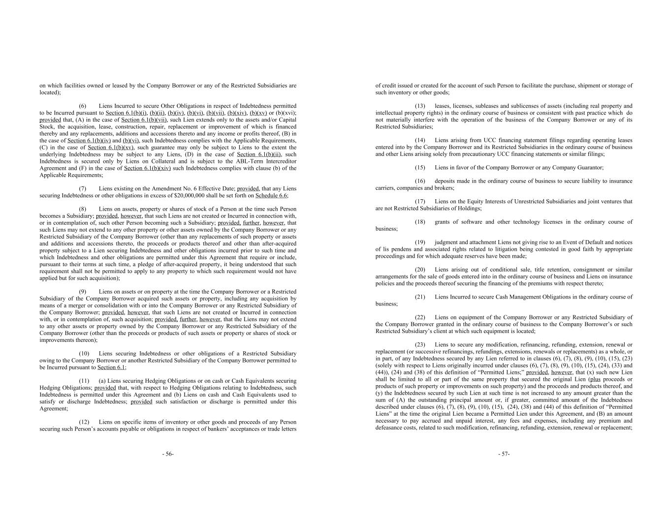 on which facilities owned or leased by the Company Borrower or any of the Restricted Subsidiaries are located); (6) Liens Incurred to secure Other Obligations in respect of Indebtedness permitted to be Incurred pursuant to Section 6.1(b)(i), (b)(ii), (b)(iv), (b)(vi), (b)(vii), (b)(xiv), (b)(xv) or (b)(xvi); provided that, (A) in the case of Section 6.1(b)(vii), such Lien extends only to the assets and/or Capital Stock, the acquisition, lease, construction, repair, replacement or improvement of which is financed thereby and any replacements, additions and accessions thereto and any income or profits thereof, (B) in the case of Section 6.1(b)(iv) and (b)(vi), such Indebtedness complies with the Applicable Requirements, (C) in the case of Section 6.1(b)(xv), such guarantee may only be subject to Liens to the extent the underlying Indebtedness may be subject to any Liens, (D) in the case of Section 6.1(b)(ii), such Indebtedness is secured only by Liens on Collateral and is subject to the ABL-Term Intercreditor Agreement and (F) in the case of Section 6.1(b)(xiv) such Indebtedness complies with clause (b) of the Applicable Requirements; (7) Liens existing on the Amendment No. 6 Effective Date; provided, that any Liens securing Indebtedness or other obligations in excess of $20,000,000 shall be set forth on Schedule 6.6; (8) Liens on assets, property or shares of stock of a Person at the time such Person becomes a Subsidiary; provided, however, that such Liens are not created or Incurred in connection with, or in contemplation of, such other Person becoming such a Subsidiary; provided, further, however, that such Liens may not extend to any other property or other assets owned by the Company Borrower or any Restricted Subsidiary of the Company Borrower (other than any replacements of such property or assets and additions and accessions thereto, the proceeds or products thereof and other than after-acquired property subject to a Lien securing Indebtedness and other obligations incurred prior to such time and which Indebtedness and other obligations are permitted under this Agreement that require or include, pursuant to their terms at such time, a pledge of after-acquired property, it being understood that such requirement shall not be permitted to apply to any property to which such requirement would not have applied but for such acquisition); (9) Liens on assets or on property at the time the Company Borrower or a Restricted Subsidiary of the Company Borrower acquired such assets or property, including any acquisition by means of a merger or consolidation with or into the Company Borrower or any Restricted Subsidiary of the Company Borrower; provided, however, that such Liens are not created or Incurred in connection with, or in contemplation of, such acquisition; provided, further, however, that the Liens may not extend to any other assets or property owned by the Company Borrower or any Restricted Subsidiary of the Company Borrower (other than the proceeds or products of such assets or property or shares of stock or improvements thereon); (10) Liens securing Indebtedness or other obligations of a Restricted Subsidiary owing to the Company Borrower or another Restricted Subsidiary of the Company Borrower permitted to be Incurred pursuant to Section 6.1; (11) (a) Liens securing Hedging Obligations or on cash or Cash Equivalents securing Hedging Obligations; provided that, with respect to Hedging Obligations relating to Indebtedness, such Indebtedness is permitted under this Agreement and (b) Liens on cash and Cash Equivalents used to satisfy or discharge Indebtedness; provided such satisfaction or discharge is permitted under this Agreement; (12) Liens on specific items of inventory or other goods and proceeds of any Person securing such Person’s accounts payable or obligations in respect of bankers’ acceptances or trade letters - 56- of credit issued or created for the account of such Person to facilitate the purchase, shipment or storage of such inventory or other goods; (13) leases, licenses, subleases and sublicenses of assets (including real property and intellectual property rights) in the ordinary course of business or consistent with past practice which do not materially interfere with the operation of the business of the Company Borrower or any of its Restricted Subsidiaries; (14) Liens arising from UCC financing statement filings regarding operating leases entered into by the Company Borrower and its Restricted Subsidiaries in the ordinary course of business and other Liens arising solely from precautionary UCC financing statements or similar filings; (15) Liens in favor of the Company Borrower or any Company Guarantor; (16) deposits made in the ordinary course of business to secure liability to insurance carriers, companies and brokers; (17) Liens on the Equity Interests of Unrestricted Subsidiaries and joint ventures that are not Restricted Subsidiaries of Holdings; (18) grants of software and other technology licenses in the ordinary course of business; (19) judgment and attachment Liens not giving rise to an Event of Default and notices of lis pendens and associated rights related to litigation being contested in good faith by appropriate proceedings and for which adequate reserves have been made; (20) Liens arising out of conditional sale, title retention, consignment or similar arrangements for the sale of goods entered into in the ordinary course of business and Liens on insurance policies and the proceeds thereof securing the financing of the premiums with respect thereto; (21) Liens Incurred to secure Cash Management Obligations in the ordinary course of business; (22) Liens on equipment of the Company Borrower or any Restricted Subsidiary of the Company Borrower granted in the ordinary course of business to the Company Borrower’s or such Restricted Subsidiary’s client at which such equipment is located; (23) Liens to secure any modification, refinancing, refunding,