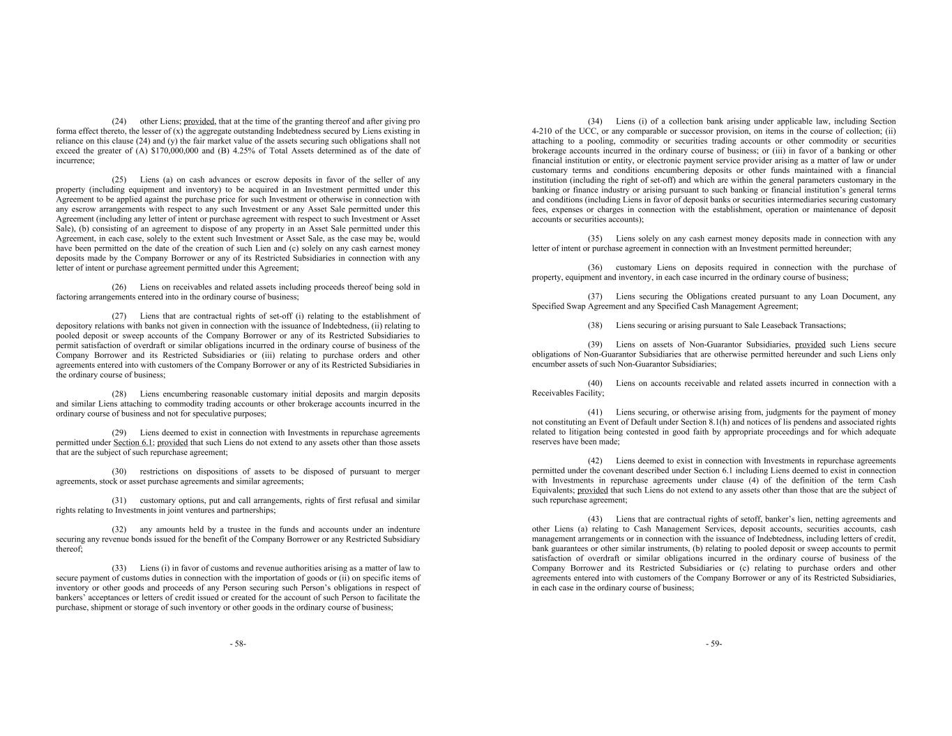 (24) other Liens; provided, that at the time of the granting thereof and after giving pro forma effect thereto, the lesser of (x) the aggregate outstanding Indebtedness secured by Liens existing in reliance on this clause (24) and (y) the fair market value of the assets securing such obligations shall not exceed the greater of (A) $170,000,000 and (B) 4.25% of Total Assets determined as of the date of incurrence; (25) Liens (a) on cash advances or escrow deposits in favor of the seller of any property (including equipment and inventory) to be acquired in an Investment permitted under this Agreement to be applied against the purchase price for such Investment or otherwise in connection with any escrow arrangements with respect to any such Investment or any Asset Sale permitted under this Agreement (including any letter of intent or purchase agreement with respect to such Investment or Asset Sale), (b) consisting of an agreement to dispose of any property in an Asset Sale permitted under this Agreement, in each case, solely to the extent such Investment or Asset Sale, as the case may be, would have been permitted on the date of the creation of such Lien and (c) solely on any cash earnest money deposits made by the Company Borrower or any of its Restricted Subsidiaries in connection with any letter of intent or purchase agreement permitted under this Agreement; (26) Liens on receivables and related assets including proceeds thereof being sold in factoring arrangements entered into in the ordinary course of business; (27) Liens that are contractual rights of set-off (i) relating to the establishment of depository relations with banks not given in connection with the issuance of Indebtedness, (ii) relating to pooled deposit or sweep accounts of the Company Borrower or any of its Restricted Subsidiaries to permit satisfaction of overdraft or similar obligations incurred in the ordinary course of business of the Company Borrower and its Restricted Subsidiaries or (iii) relating to purchase orders and other agreements entered into with customers of the Company Borrower or any of its Restricted Subsidiaries in the ordinary course of business; (28) Liens encumbering reasonable customary initial deposits and margin deposits and similar Liens attaching to commodity trading accounts or other brokerage accounts incurred in the ordinary course of business and not for speculative purposes; (29) Liens deemed to exist in connection with Investments in repurchase agreements permitted under Section 6.1; provided that such Liens do not extend to any assets other than those assets that are the subject of such repurchase agreement; (30) restrictions on dispositions of assets to be disposed of pursuant to merger agreements, stock or asset purchase agreements and similar agreements; (31) customary options, put and call arrangements, rights of first refusal and similar rights relating to Investments in joint ventures and partnerships; (32) any amounts held by a trustee in the funds and accounts under an indenture securing any revenue bonds issued for the benefit of the Company Borrower or any Restricted Subsidiary thereof; (33) Liens (i) in favor of customs and revenue authorities arising as a matter of law to secure payment of customs duties in connection with the importation of goods or (ii) on specific items of inventory or other goods and proceeds of any Person securing such Person’s obligations in respect of bankers’ acceptances or letters of credit issued or created for the account of such Person to facilitate the purchase, shipment or storage of such inventory or other goods in the ordinary course of business; - 58- (34) Liens (i) of a collection bank arising under applicable law, including Section 4-210 of the UCC, or any comparable or successor provision, on items in the course of collection; (ii) attaching to a pooling, commodity or securities trading accounts or other commodity or securities brokerage accounts incurred in the ordinary course of business; or (iii) in favor of a banking or other financial institution or entity, or electronic payment service provider arising as a matter of law or under customary terms and conditions encumbering deposits or other funds maintained with a financial institution (including the right of set-off) and which are within the general parameters customary in the banking or finance industry or arising pursuant to such banking or financial institution’s general terms and conditions (including Liens in favor of deposit banks or securities intermediaries securing customary fees, expenses or charges in connection with the establishment, operation or maintenance of deposit accounts or securities accounts); (35) Liens solely on any cash earnest money deposits made in connection with any letter of intent or purchase agreement in connection with an Investment permitted hereunder; (36) customary Liens on deposits required in connection with the purchase of property, equipment and inventory, in each case incurred in the ordinary course of business; (37) Liens securing the Obligations created pursuant to any Loan Document, any Specified Swap Agreement and any Specified Cash Management Agreement; (38) Liens securing or arising pursuant to Sale Leaseback Transactions; (39) Liens on assets of Non-Guarantor Subsidiaries, provided such Liens secure obligations of Non-Guarantor Subsidiaries that are otherwise permitted hereunder and such Liens only encumber assets of such Non-Guarantor Subsidiaries; (40) Liens on accounts receivable and related assets incurred in connection with a Receivables Facility; (41) Liens securing, or otherwise arising from, judgments for the payment of money not constituting an Event of Default under Section 8.1(h) and notices of lis pendens and associated rights related to litigation being contested in good faith by appropriate proceedings and for which adequate reserves have been made; (42) Liens deemed to exist in connection with Investments in repurc