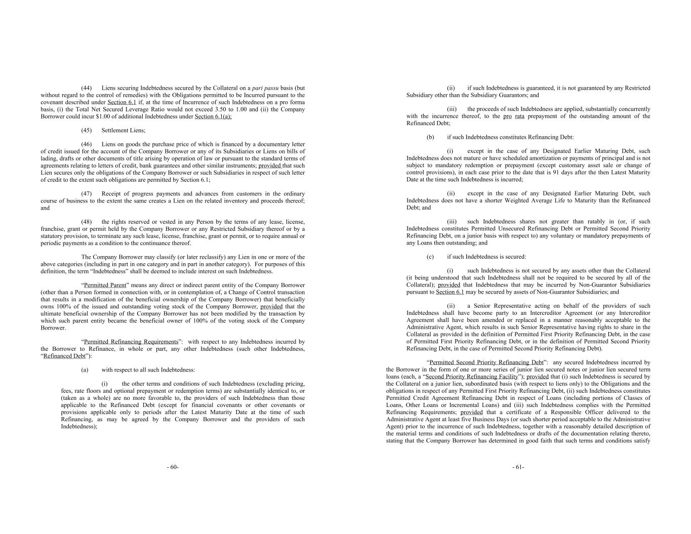 (44) Liens securing Indebtedness secured by the Collateral on a pari passu basis (but without regard to the control of remedies) with the Obligations permitted to be Incurred pursuant to the covenant described under Section 6.1 if, at the time of Incurrence of such Indebtedness on a pro forma basis, (i) the Total Net Secured Leverage Ratio would not exceed 3.50 to 1.00 and (ii) the Company Borrower could incur $1.00 of additional Indebtedness under Section 6.1(a); (45) Settlement Liens; (46) Liens on goods the purchase price of which is financed by a documentary letter of credit issued for the account of the Company Borrower or any of its Subsidiaries or Liens on bills of lading, drafts or other documents of title arising by operation of law or pursuant to the standard terms of agreements relating to letters of credit, bank guarantees and other similar instruments; provided that such Lien secures only the obligations of the Company Borrower or such Subsidiaries in respect of such letter of credit to the extent such obligations are permitted by Section 6.1; (47) Receipt of progress payments and advances from customers in the ordinary course of business to the extent the same creates a Lien on the related inventory and proceeds thereof; and (48) the rights reserved or vested in any Person by the terms of any lease, license, franchise, grant or permit held by the Company Borrower or any Restricted Subsidiary thereof or by a statutory provision, to terminate any such lease, license, franchise, grant or permit, or to require annual or periodic payments as a condition to the continuance thereof. The Company Borrower may classify (or later reclassify) any Lien in one or more of the above categories (including in part in one category and in part in another category). For purposes of this definition, the term “Indebtedness” shall be deemed to include interest on such Indebtedness. “Permitted Parent” means any direct or indirect parent entity of the Company Borrower (other than a Person formed in connection with, or in contemplation of, a Change of Control transaction that results in a modification of the beneficial ownership of the Company Borrower) that beneficially owns 100% of the issued and outstanding voting stock of the Company Borrower, provided that the ultimate beneficial ownership of the Company Borrower has not been modified by the transaction by which such parent entity became the beneficial owner of 100% of the voting stock of the Company Borrower. “Permitted Refinancing Requirements”: with respect to any Indebtedness incurred by the Borrower to Refinance, in whole or part, any other Indebtedness (such other Indebtedness, “Refinanced Debt”): (a) with respect to all such Indebtedness: (i) the other terms and conditions of such Indebtedness (excluding pricing, fees, rate floors and optional prepayment or redemption terms) are substantially identical to, or (taken as a whole) are no more favorable to, the providers of such Indebtedness than those applicable to the Refinanced Debt (except for financial covenants or other covenants or provisions applicable only to periods after the Latest Maturity Date at the time of such Refinancing, as may be agreed by the Company Borrower and the providers of such Indebtedness); - 60- (ii) if such Indebtedness is guaranteed, it is not guaranteed by any Restricted Subsidiary other than the Subsidiary Guarantors; and (iii) the proceeds of such Indebtedness are applied, substantially concurrently with the incurrence thereof, to the pro rata prepayment of the outstanding amount of the Refinanced Debt; (b) if such Indebtedness constitutes Refinancing Debt: (i) except in the case of any Designated Earlier Maturing Debt, such Indebtedness does not mature or have scheduled amortization or payments of principal and is not subject to mandatory redemption or prepayment (except customary asset sale or change of control provisions), in each case prior to the date that is 91 days after the then Latest Maturity Date at the time such Indebtedness is incurred; (ii) except in the case of any Designated Earlier Maturing Debt, such Indebtedness does not have a shorter Weighted Average Life to Maturity than the Refinanced Debt; and (iii) such Indebtedness shares not greater than ratably in (or, if such Indebtedness constitutes Permitted Unsecured Refinancing Debt or Permitted Second Priority Refinancing Debt, on a junior basis with respect to) any voluntary or mandatory prepayments of any Loans then outstanding; and (c) if such Indebtedness is secured: (i) such Indebtedness is not secured by any assets other than the Collateral (it being understood that such Indebtedness shall not be required to be secured by all of the Collateral); provided that Indebtedness that may be incurred by Non-Guarantor Subsidiaries pursuant to Section 6.1 may be secured by assets of Non-Guarantor Subsidiaries; and (ii) a Senior Representative acting on behalf of the providers of such Indebtedness shall have become party to an Intercreditor Agreement (or any Intercreditor Agreement shall have been amended or replaced in a manner reasonably acceptable to the Administrative Agent, which results in such Senior Representative having rights to share in the Collateral as provided in the definition of Permitted First Priority Refinancing Debt, in the case of Permitted First Priority Refinancing Debt, or in the definition of Permitted Second Priority Refinancing Debt, in the case of Permitted Second Priority Refinancing Debt). “Permitted Second Priority Refinancing Debt”: any secured Indebtedness incurred by the Borrower in the form of one or more series of junior lien secured notes or junior lien secured term loans (each, a “Second Priority Refinancing Facility”); provided that (i) such Indebtedness is secured by the Collateral on a junior lien, subordinated basis (with respect to liens only) to the Obligations and the obligations in respect of any Permitted First Priority Refina
