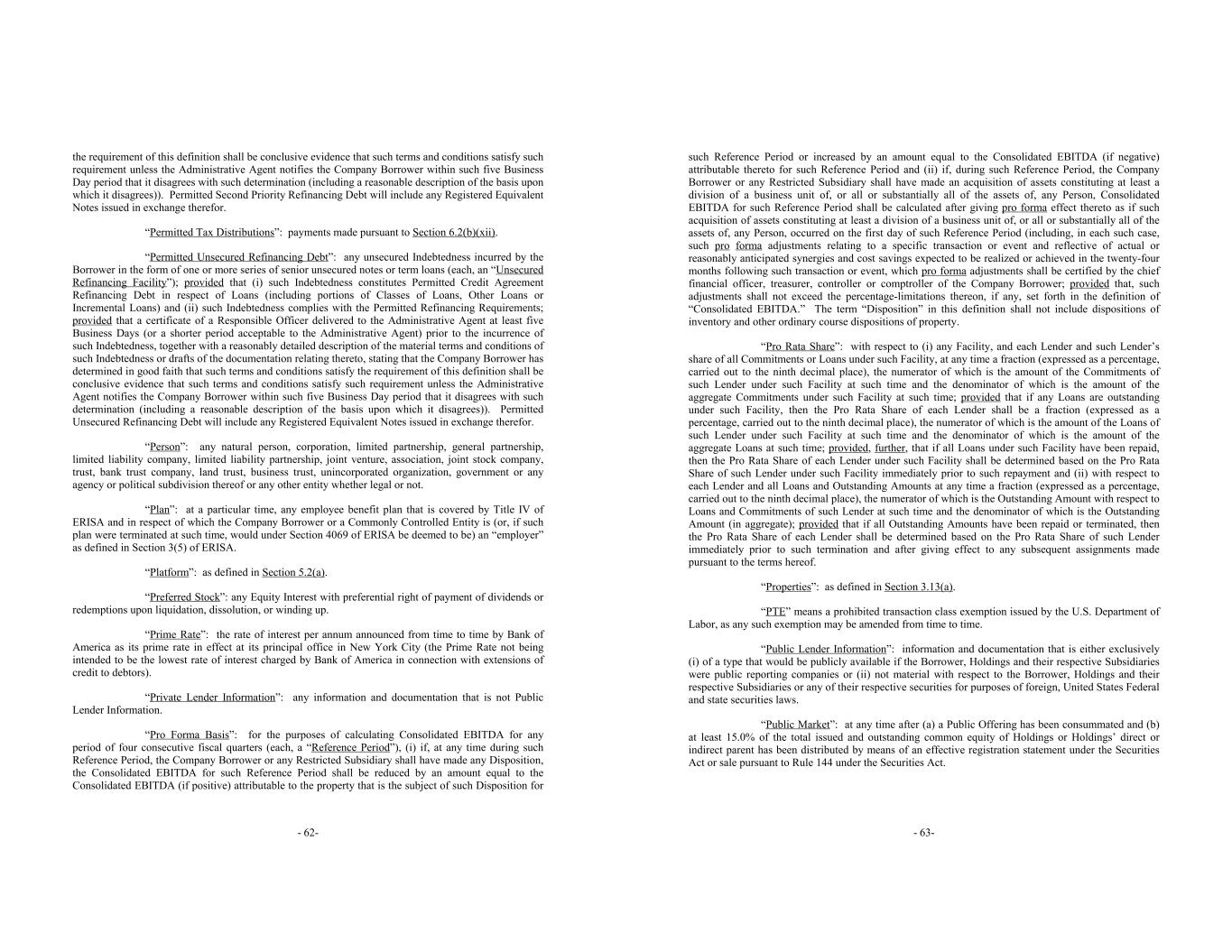 the requirement of this definition shall be conclusive evidence that such terms and conditions satisfy such requirement unless the Administrative Agent notifies the Company Borrower within such five Business Day period that it disagrees with such determination (including a reasonable description of the basis upon which it disagrees)). Permitted Second Priority Refinancing Debt will include any Registered Equivalent Notes issued in exchange therefor. “Permitted Tax Distributions”: payments made pursuant to Section 6.2(b)(xii). “Permitted Unsecured Refinancing Debt”: any unsecured Indebtedness incurred by the Borrower in the form of one or more series of senior unsecured notes or term loans (each, an “Unsecured Refinancing Facility”); provided that (i) such Indebtedness constitutes Permitted Credit Agreement Refinancing Debt in respect of Loans (including portions of Classes of Loans, Other Loans or Incremental Loans) and (ii) such Indebtedness complies with the Permitted Refinancing Requirements; provided that a certificate of a Responsible Officer delivered to the Administrative Agent at least five Business Days (or a shorter period acceptable to the Administrative Agent) prior to the incurrence of such Indebtedness, together with a reasonably detailed description of the material terms and conditions of such Indebtedness or drafts of the documentation relating thereto, stating that the Company Borrower has determined in good faith that such terms and conditions satisfy the requirement of this definition shall be conclusive evidence that such terms and conditions satisfy such requirement unless the Administrative Agent notifies the Company Borrower within such five Business Day period that it disagrees with such determination (including a reasonable description of the basis upon which it disagrees)). Permitted Unsecured Refinancing Debt will include any Registered Equivalent Notes issued in exchange therefor. “Person”: any natural person, corporation, limited partnership, general partnership, limited liability company, limited liability partnership, joint venture, association, joint stock company, trust, bank trust company, land trust, business trust, unincorporated organization, government or any agency or political subdivision thereof or any other entity whether legal or not. “Plan”: at a particular time, any employee benefit plan that is covered by Title IV of ERISA and in respect of which the Company Borrower or a Commonly Controlled Entity is (or, if such plan were terminated at such time, would under Section 4069 of ERISA be deemed to be) an “employer” as defined in Section 3(5) of ERISA. “Platform”: as defined in Section 5.2(a). “Preferred Stock”: any Equity Interest with preferential right of payment of dividends or redemptions upon liquidation, dissolution, or winding up. “Prime Rate”: the rate of interest per annum announced from time to time by Bank of America as its prime rate in effect at its principal office in New York City (the Prime Rate not being intended to be the lowest rate of interest charged by Bank of America in connection with extensions of credit to debtors). “Private Lender Information”: any information and documentation that is not Public Lender Information. “Pro Forma Basis”: for the purposes of calculating Consolidated EBITDA for any period of four consecutive fiscal quarters (each, a “Reference Period”), (i) if, at any time during such Reference Period, the Company Borrower or any Restricted Subsidiary shall have made any Disposition, the Consolidated EBITDA for such Reference Period shall be reduced by an amount equal to the Consolidated EBITDA (if positive) attributable to the property that is the subject of such Disposition for - 62- such Reference Period or increased by an amount equal to the Consolidated EBITDA (if negative) attributable thereto for such Reference Period and (ii) if, during such Reference Period, the Company Borrower or any Restricted Subsidiary shall have made an acquisition of assets constituting at least a division of a business unit of, or all or substantially all of the assets of, any Person, Consolidated EBITDA for such Reference Period shall be calculated after giving pro forma effect thereto as if such acquisition of assets constituting at least a division of a business unit of, or all or substantially all of the assets of, any Person, occurred on the first day of such Reference Period (including, in each such case, such pro forma adjustments relating to a specific transaction or event and reflective of actual or reasonably anticipated synergies and cost savings expected to be realized or achieved in the twenty-four months following such transaction or event, which pro forma adjustments shall be certified by the chief financial officer, treasurer, controller or comptroller of the Company Borrower; provided that, such adjustments shall not exceed the percentage-limitations thereon, if any, set forth in the definition of “Consolidated EBITDA.” The term “Disposition” in this definition shall not include dispositions of inventory and other ordinary course dispositions of property. “Pro Rata Share”: with respect to (i) any Facility, and each Lender and such Lender’s share of all Commitments or Loans under such Facility, at any time a fraction (expressed as a percentage, carried out to the ninth decimal place), the numerator of which is the amount of the Commitments of such Lender under such Facility at such time and the denominator of which is the amount of the aggregate Commitments under such Facility at such time; provided that if any Loans are outstanding under such Facility, then the Pro Rata Share of each Lender shall be a fraction (expressed as a percentage, carried out to the ninth decimal place), the numerator of which is the amount of the Loans of such Lender under such Facility at such time and the denominator of which is the amount of the aggregate Loans at such