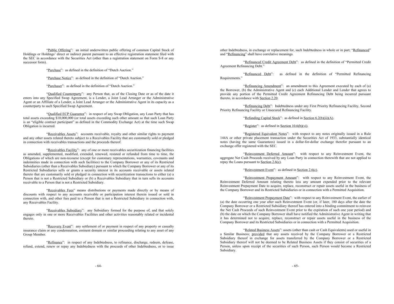 “Public Offering”: an initial underwritten public offering of common Capital Stock of Holdings or Holdings’ direct or indirect parent pursuant to an effective registration statement filed with the SEC in accordance with the Securities Act (other than a registration statement on Form S-8 or any successor form). “Purchase”: as defined in the definition of “Dutch Auction.” “Purchase Notice”: as defined in the definition of “Dutch Auction.” “Purchaser”: as defined in the definition of “Dutch Auction.” “Qualified Counterparty”: any Person that, as of the Closing Date or as of the date it enters into any Specified Swap Agreement, is a Lender, a Joint Lead Arranger or the Administrative Agent or an Affiliate of a Lender, a Joint Lead Arranger or the Administrative Agent in its capacity as a counterparty to such Specified Swap Agreement. “Qualified ECP Guarantor”: in respect of any Swap Obligation, any Loan Party that has total assets exceeding $10,000,000 (or total assets exceeding such other amount so that such Loan Party is an “eligible contract participant” as defined in the Commodity Exchange Act) at the time such Swap Obligation is incurred. “Receivables Assets”: accounts receivable, royalty and other similar rights to payment and any other assets related thereto subject to a Receivables Facility that are customarily sold or pledged in connection with receivables transactions and the proceeds thereof. “Receivables Facility”: any of one or more receivables securitization financing facilities as amended, supplemented, modified, extended, renewed, restated or refunded from time to time, the Obligations of which are non-recourse (except for customary representations, warranties, covenants and indemnities made in connection with such facilities) to the Company Borrower or any of its Restricted Subsidiaries (other than a Receivables Subsidiary) pursuant to which the Company Borrower or any of its Restricted Subsidiaries sells or grants a security interest in its accounts receivable or assets related thereto that are customarily sold or pledged in connection with securitization transactions to either (a) a Person that is not a Restricted Subsidiary or (b) a Receivables Subsidiary that in turn sells its accounts receivable to a Person that is not a Restricted Subsidiary. “Receivables Fees” means distributions or payments made directly or by means of discounts with respect to any accounts receivable or participation interest therein issued or sold in connection with, and other fees paid to a Person that is not a Restricted Subsidiary in connection with, any Receivables Facility. “Receivables Subsidiary”: any Subsidiary formed for the purpose of, and that solely engages only in one or more Receivables Facilities and other activities reasonably related or incidental thereto. “Recovery Event”: any settlement of or payment in respect of any property or casualty insurance claim or any condemnation, eminent domain or similar proceeding relating to any asset of any Group Member. “Refinance”: in respect of any Indebtedness, to refinance, discharge, redeem, defease, refund, extend, renew or repay any Indebtedness with the proceeds of other Indebtedness, or to issue - 64- other Indebtedness, in exchange or replacement for, such Indebtedness in whole or in part; “Refinanced” and “Refinancing” shall have correlative meanings. “Refinanced Credit Agreement Debt”: as defined in the definition of “Permitted Credit Agreement Refinancing Debt.” “Refinanced Debt”: as defined in the definition of “Permitted Refinancing Requirements.” “Refinancing Amendment”: an amendment to this Agreement executed by each of (a) the Borrower, (b) the Administrative Agent and (c) each Additional Lender and Lender that agrees to provide any portion of the Permitted Credit Agreement Refinancing Debt being incurred pursuant thereto, in accordance with Section 2.20. “Refinancing Debt”: Indebtedness under any First Priority Refinancing Facility, Second Priority Refinancing Facility or Unsecured Refinancing Facility. “Refunding Capital Stock”: as defined in Section 6.2(b)(ii)(A). “Register”: as defined in Section 10.6(b)(vi). “Registered Equivalent Notes”: with respect to any notes originally issued in a Rule 144A or other private placement transaction under the Securities Act of 1933, substantially identical notes (having the same Guarantees) issued in a dollar-for-dollar exchange therefor pursuant to an exchange offer registered with the SEC. “Reinvestment Deferred Amount”: with respect to any Reinvestment Event, the aggregate Net Cash Proceeds received by any Loan Party in connection therewith that are not applied to repay the Loans pursuant to Section 2.6(c). “Reinvestment Event”: as defined in Section 2.6(c). “Reinvestment Prepayment Amount”: with respect to any Reinvestment Event, the Reinvestment Deferred Amount relating thereto less any amount expended prior to the relevant Reinvestment Prepayment Date to acquire, replace, reconstruct or repair assets useful in the business of the Company Borrower and its Restricted Subsidiaries or in connection with a Permitted Acquisition. “Reinvestment Prepayment Date”: with respect to any Reinvestment Event, the earlier of (a) the date occurring one year after such Reinvestment Event (or, if later, 180 days after the date the Company Borrower or a Restricted Subsidiary thereof has entered into a binding commitment to reinvest the Net Cash Proceeds of such Reinvestment Event prior to the expiration of such one year period) and (b) the date on which the Company Borrower shall have notified the Administrative Agent in writing that it has determined not to acquire, replace, reconstruct or repair assets useful in the business of the Company Borrower and its Restricted Subsidiaries or in connection with a Permitted Acquisition. “Related Business Assets”: assets (other than c