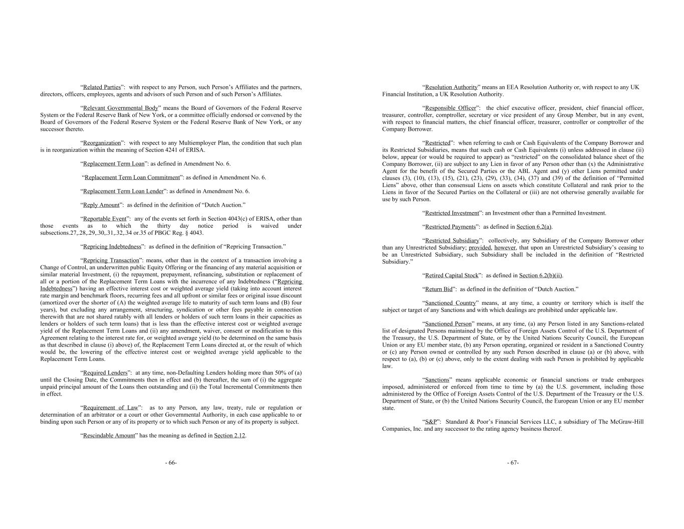 “Related Parties”: with respect to any Person, such Person’s Affiliates and the partners, directors, officers, employees, agents and advisors of such Person and of such Person’s Affiliates. “Relevant Governmental Body” means the Board of Governors of the Federal Reserve System or the Federal Reserve Bank of New York, or a committee officially endorsed or convened by the Board of Governors of the Federal Reserve System or the Federal Reserve Bank of New York, or any successor thereto. “Reorganization”: with respect to any Multiemployer Plan, the condition that such plan is in reorganization within the meaning of Section 4241 of ERISA. “Replacement Term Loan”: as defined in Amendment No. 6. “Replacement Term Loan Commitment”: as defined in Amendment No. 6. “Replacement Term Loan Lender”: as defined in Amendment No. 6. “Reply Amount”: as defined in the definition of “Dutch Auction.” “Reportable Event”: any of the events set forth in Section 4043(c) of ERISA, other than those events as to which the thirty day notice period is waived under subsections.27,.28,.29,.30,.31,.32,.34 or.35 of PBGC Reg. § 4043. “Repricing Indebtedness”: as defined in the definition of “Repricing Transaction.” “Repricing Transaction”: means, other than in the context of a transaction involving a Change of Control, an underwritten public Equity Offering or the financing of any material acquisition or similar material Investment, (i) the repayment, prepayment, refinancing, substitution or replacement of all or a portion of the Replacement Term Loans with the incurrence of any Indebtedness (“Repricing Indebtedness”) having an effective interest cost or weighted average yield (taking into account interest rate margin and benchmark floors, recurring fees and all upfront or similar fees or original issue discount (amortized over the shorter of (A) the weighted average life to maturity of such term loans and (B) four years), but excluding any arrangement, structuring, syndication or other fees payable in connection therewith that are not shared ratably with all lenders or holders of such term loans in their capacities as lenders or holders of such term loans) that is less than the effective interest cost or weighted average yield of the Replacement Term Loans and (ii) any amendment, waiver, consent or modification to this Agreement relating to the interest rate for, or weighted average yield (to be determined on the same basis as that described in clause (i) above) of, the Replacement Term Loans directed at, or the result of which would be, the lowering of the effective interest cost or weighted average yield applicable to the Replacement Term Loans. “Required Lenders”: at any time, non-Defaulting Lenders holding more than 50% of (a) until the Closing Date, the Commitments then in effect and (b) thereafter, the sum of (i) the aggregate unpaid principal amount of the Loans then outstanding and (ii) the Total Incremental Commitments then in effect. “Requirement of Law”: as to any Person, any law, treaty, rule or regulation or determination of an arbitrator or a court or other Governmental Authority, in each case applicable to or binding upon such Person or any of its property or to which such Person or any of its property is subject. “Rescindable Amount” has the meaning as defined in Section 2.12. - 66- “Resolution Authority” means an EEA Resolution Authority or, with respect to any UK Financial Institution, a UK Resolution Authority. “Responsible Officer”: the chief executive officer, president, chief financial officer, treasurer, controller, comptroller, secretary or vice president of any Group Member, but in any event, with respect to financial matters, the chief financial officer, treasurer, controller or comptroller of the Company Borrower. “Restricted”: when referring to cash or Cash Equivalents of the Company Borrower and its Restricted Subsidiaries, means that such cash or Cash Equivalents (i) unless addressed in clause (ii) below, appear (or would be required to appear) as “restricted” on the consolidated balance sheet of the Company Borrower, (ii) are subject to any Lien in favor of any Person other than (x) the Administrative Agent for the benefit of the Secured Parties or the ABL Agent and (y) other Liens permitted under clauses (3), (10), (13), (15), (21), (23), (29), (33), (34), (37) and (39) of the definition of “Permitted Liens” above, other than consensual Liens on assets which constitute Collateral and rank prior to the Liens in favor of the Secured Parties on the Collateral or (iii) are not otherwise generally available for use by such Person. “Restricted Investment”: an Investment other than a Permitted Investment. “Restricted Payments”: as defined in Section 6.2(a). “Restricted Subsidiary”: collectively, any Subsidiary of the Company Borrower other than any Unrestricted Subsidiary; provided, however, that upon an Unrestricted Subsidiary’s ceasing to be an Unrestricted Subsidiary, such Subsidiary shall be included in the definition of “Restricted Subsidiary.” “Retired Capital Stock”: as defined in Section 6.2(b)(ii). “Return Bid”: as defined in the definition of “Dutch Auction.” “Sanctioned Country” means, at any time, a country or territory which is itself the subject or target of any Sanctions and with which dealings are prohibited under applicable law. “Sanctioned Person” means, at any time, (a) any Person listed in any Sanctions-related list of designated Persons maintained by the Office of Foreign Assets Control of the U.S. Department of the Treasury, the U.S. Department of State, or by the United Nations Security Council, the European Union or any EU member state, (b) any Person operating, organized or resident in a Sanctioned Country or (c) any Person owned or controlled by any such Person described in clause (a) or (b) above, with respect to (a), (b) or (c) above, only to t