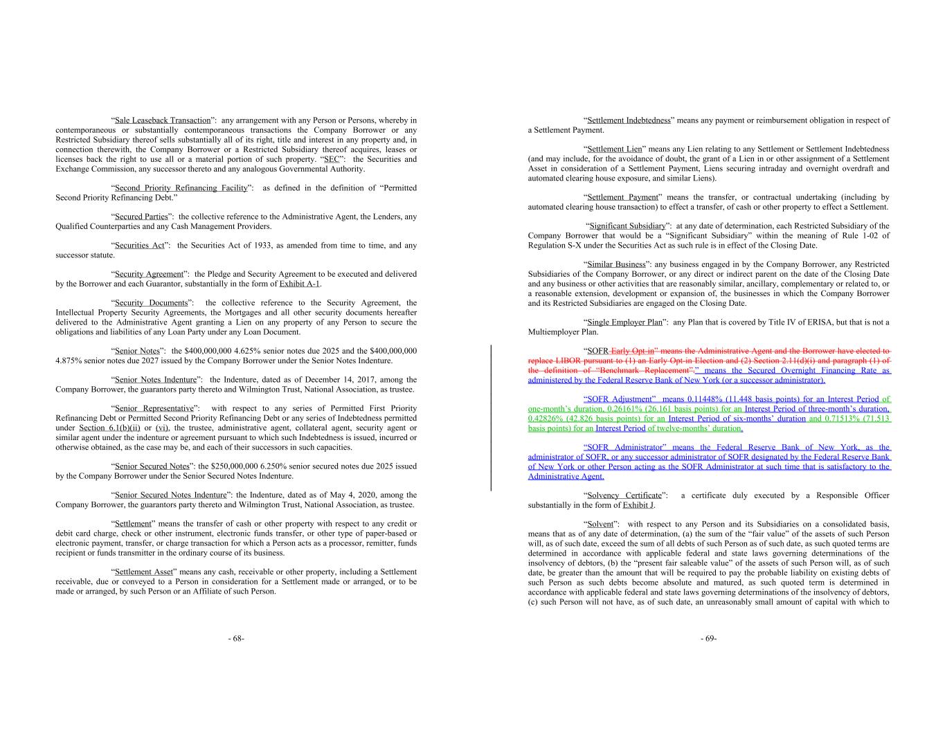 “Sale Leaseback Transaction”: any arrangement with any Person or Persons, whereby in contemporaneous or substantially contemporaneous transactions the Company Borrower or any Restricted Subsidiary thereof sells substantially all of its right, title and interest in any property and, in connection therewith, the Company Borrower or a Restricted Subsidiary thereof acquires, leases or licenses back the right to use all or a material portion of such property. “SEC”: the Securities and Exchange Commission, any successor thereto and any analogous Governmental Authority. “Second Priority Refinancing Facility”: as defined in the definition of “Permitted Second Priority Refinancing Debt.” “Secured Parties”: the collective reference to the Administrative Agent, the Lenders, any Qualified Counterparties and any Cash Management Providers. “Securities Act”: the Securities Act of 1933, as amended from time to time, and any successor statute. “Security Agreement”: the Pledge and Security Agreement to be executed and delivered by the Borrower and each Guarantor, substantially in the form of Exhibit A-1. “Security Documents”: the collective reference to the Security Agreement, the Intellectual Property Security Agreements, the Mortgages and all other security documents hereafter delivered to the Administrative Agent granting a Lien on any property of any Person to secure the obligations and liabilities of any Loan Party under any Loan Document. “Senior Notes”: the $400,000,000 4.625% senior notes due 2025 and the $400,000,000 4.875% senior notes due 2027 issued by the Company Borrower under the Senior Notes Indenture. “Senior Notes Indenture”: the Indenture, dated as of December 14, 2017, among the Company Borrower, the guarantors party thereto and Wilmington Trust, National Association, as trustee. “Senior Representative”: with respect to any series of Permitted First Priority Refinancing Debt or Permitted Second Priority Refinancing Debt or any series of Indebtedness permitted under Section 6.1(b)(ii) or (vi), the trustee, administrative agent, collateral agent, security agent or similar agent under the indenture or agreement pursuant to which such Indebtedness is issued, incurred or otherwise obtained, as the case may be, and each of their successors in such capacities. “Senior Secured Notes”: the $250,000,000 6.250% senior secured notes due 2025 issued by the Company Borrower under the Senior Secured Notes Indenture. “Senior Secured Notes Indenture”: the Indenture, dated as of May 4, 2020, among the Company Borrower, the guarantors party thereto and Wilmington Trust, National Association, as trustee. “Settlement” means the transfer of cash or other property with respect to any credit or debit card charge, check or other instrument, electronic funds transfer, or other type of paper-based or electronic payment, transfer, or charge transaction for which a Person acts as a processor, remitter, funds recipient or funds transmitter in the ordinary course of its business. “Settlement Asset” means any cash, receivable or other property, including a Settlement receivable, due or conveyed to a Person in consideration for a Settlement made or arranged, or to be made or arranged, by such Person or an Affiliate of such Person. - 68- “Settlement Indebtedness” means any payment or reimbursement obligation in respect of a Settlement Payment. “Settlement Lien” means any Lien relating to any Settlement or Settlement Indebtedness (and may include, for the avoidance of doubt, the grant of a Lien in or other assignment of a Settlement Asset in consideration of a Settlement Payment, Liens securing intraday and overnight overdraft and automated clearing house exposure, and similar Liens). “Settlement Payment” means the transfer, or contractual undertaking (including by automated clearing house transaction) to effect a transfer, of cash or other property to effect a Settlement. “Significant Subsidiary”: at any date of determination, each Restricted Subsidiary of the Company Borrower that would be a “Significant Subsidiary” within the meaning of Rule 1-02 of Regulation S-X under the Securities Act as such rule is in effect of the Closing Date. “Similar Business”: any business engaged in by the Company Borrower, any Restricted Subsidiaries of the Company Borrower, or any direct or indirect parent on the date of the Closing Date and any business or other activities that are reasonably similar, ancillary, complementary or related to, or a reasonable extension, development or expansion of, the businesses in which the Company Borrower and its Restricted Subsidiaries are engaged on the Closing Date. “Single Employer Plan”: any Plan that is covered by Title IV of ERISA, but that is not a Multiemployer Plan. “SOFR Early Opt-in” means the Administrative Agent and the Borrower have elected to replace LIBOR pursuant to (1) an Early Opt-in Election and (2) Section 2.11(d)(i) and paragraph (1) of the definition of “Benchmark Replacement”.” means the Secured Overnight Financing Rate as administered by the Federal Reserve Bank of New York (or a successor administrator). “SOFR Adjustment” means 0.11448% (11.448 basis points) for an Interest Period of one-month’s duration, 0.26161% (26.161 basis points) for an Interest Period of three-month’s duration, 0.42826% (42.826 basis points) for an Interest Period of six-months’ duration and 0.71513% (71.513 basis points) for an Interest Period of twelve-months’ duration. “SOFR Administrator” means the Federal Reserve Bank of New York, as the administrator of SOFR, or any successor administrator of SOFR designated by the Federal Reserve Bank of New York or other Person acting as the SOFR Administrator at such time that is satisfactory to the Administrative Agent. “Solvency Certificate”: a certificate duly executed by a Responsible Officer substantially in the form of Exhibit J. “Solv