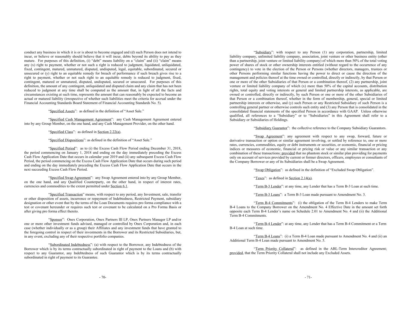 conduct any business in which it is or is about to become engaged and (d) such Person does not intend to incur, or believe or reasonably should believe that it will incur, debts beyond its ability to pay as they mature. For purposes of this definition, (i) “debt” means liability on a “claim” and (ii) “claim” means any (x) right to payment, whether or not such a right is reduced to judgment, liquidated, unliquidated, fixed, contingent, matured, unmatured, disputed, undisputed, legal, equitable, subordinated, secured or unsecured or (y) right to an equitable remedy for breach of performance if such breach gives rise to a right to payment, whether or not such right to an equitable remedy is reduced to judgment, fixed, contingent, matured or unmatured, disputed, undisputed, secured or unsecured. For purposes of this definition, the amount of any contingent, unliquidated and disputed claim and any claim that has not been reduced to judgment at any time shall be computed as the amount that, in light of all the facts and circumstances existing at such time, represents the amount that can reasonably be expected to become an actual or matured liability (irrespective of whether such liabilities meet the criteria for accrual under the Financial Accounting Standards Board Statement of Financial Accounting Standards No. 5). “Specified Assets”: as defined in the definition of “Asset Sale.” “Specified Cash Management Agreement”: any Cash Management Agreement entered into by any Group Member, on the one hand, and any Cash Management Provider, on the other hand. “Specified Class”: as defined in Section 2.22(a). “Specified Dispositions”: as defined in the definition of “Asset Sale.” “Specified Period”: as to (i) the Excess Cash Flow Period ending December 31, 2018, the period commencing on January 1, 2018 and ending on the day immediately preceding the Excess Cash Flow Application Date that occurs in calendar year 2019 and (ii) any subsequent Excess Cash Flow Period, the period commencing on the Excess Cash Flow Application Date that occurs during such period and ending on the day immediately preceding the Excess Cash Flow Application Date that occurs in the next succeeding Excess Cash Flow Period. “Specified Swap Agreement”: any Swap Agreement entered into by any Group Member, on the one hand, and any Qualified Counterparty, on the other hand, in respect of interest rates, currencies and commodities to the extent permitted under Section 6.1. “Specified Transaction” means, with respect to any period, any Investment, sale, transfer or other disposition of assets, incurrence or repayment of Indebtedness, Restricted Payment, subsidiary designation or other event that by the terms of the Loan Documents requires pro forma compliance with a test or covenant hereunder or requires such test or covenant to be calculated on a Pro Forma Basis or after giving pro forma effect thereto. “Sponsor”: Onex Corporation, Onex Partners III LP, Onex Partners Manager LP and/or one or more other investment funds advised, managed or controlled by Onex Corporation and, in each case (whether individually or as a group) their Affiliates and any investment funds that have granted to the foregoing control in respect of their investments in the Borrower and its Restricted Subsidiaries, but, in any event, excluding any of their respective portfolio companies. “Subordinated Indebtedness”: (a) with respect to the Borrower, any Indebtedness of the Borrower which is by its terms contractually subordinated in right of payment to the Loans and (b) with respect to any Guarantor, any Indebtedness of such Guarantor which is by its terms contractually subordinated in right of payment to its Guarantee. - 70- “Subsidiary”: with respect to any Person (1) any corporation, partnership, limited liability company, unlimited liability company, association, joint venture or other business entity (other than a partnership, joint venture or limited liability company) of which more than 50% of the total voting power of shares of stock or other ownership interests entitled (without regard to the occurrence of any contingency) to vote in the election of the Person or Persons (whether directors, managers, trustees or other Persons performing similar functions having the power to direct or cause the direction of the management and policies thereof at the time owned or controlled, directly or indirectly, by that Person or one or more of the other Subsidiaries of that Person or a combination thereof, (2) any partnership, joint venture or limited liability company of which (x) more than 50% of the capital accounts, distribution rights, total equity and voting interests or general and limited partnership interests, as applicable, are owned or controlled, directly or indirectly, by such Person or one or more of the other Subsidiaries of that Person or a combination thereof, whether in the form of membership, general, special or limited partnership interests or otherwise, and (y) such Person or any Restricted Subsidiary of such Person is a controlling general partner or otherwise controls such entity and (3) any Person that is consolidated in the consolidated financial statements of the specified Person in accordance with GAAP. Unless otherwise qualified, all references to a “Subsidiary” or to “Subsidiaries” in this Agreement shall refer to a Subsidiary or Subsidiaries of Holdings. “Subsidiary Guarantor”: the collective reference to the Company Subsidiary Guarantors. “Swap Agreement”: any agreement with respect to any swap, forward, future or derivative transaction or option or similar agreement involving, or settled by reference to, one or more rates, currencies, commodities, equity or debt instruments or securities, or economic, financial or pricing indices or measures of economic, financial or pricing risk or value or any similar transaction or any combination of these transactions; provide